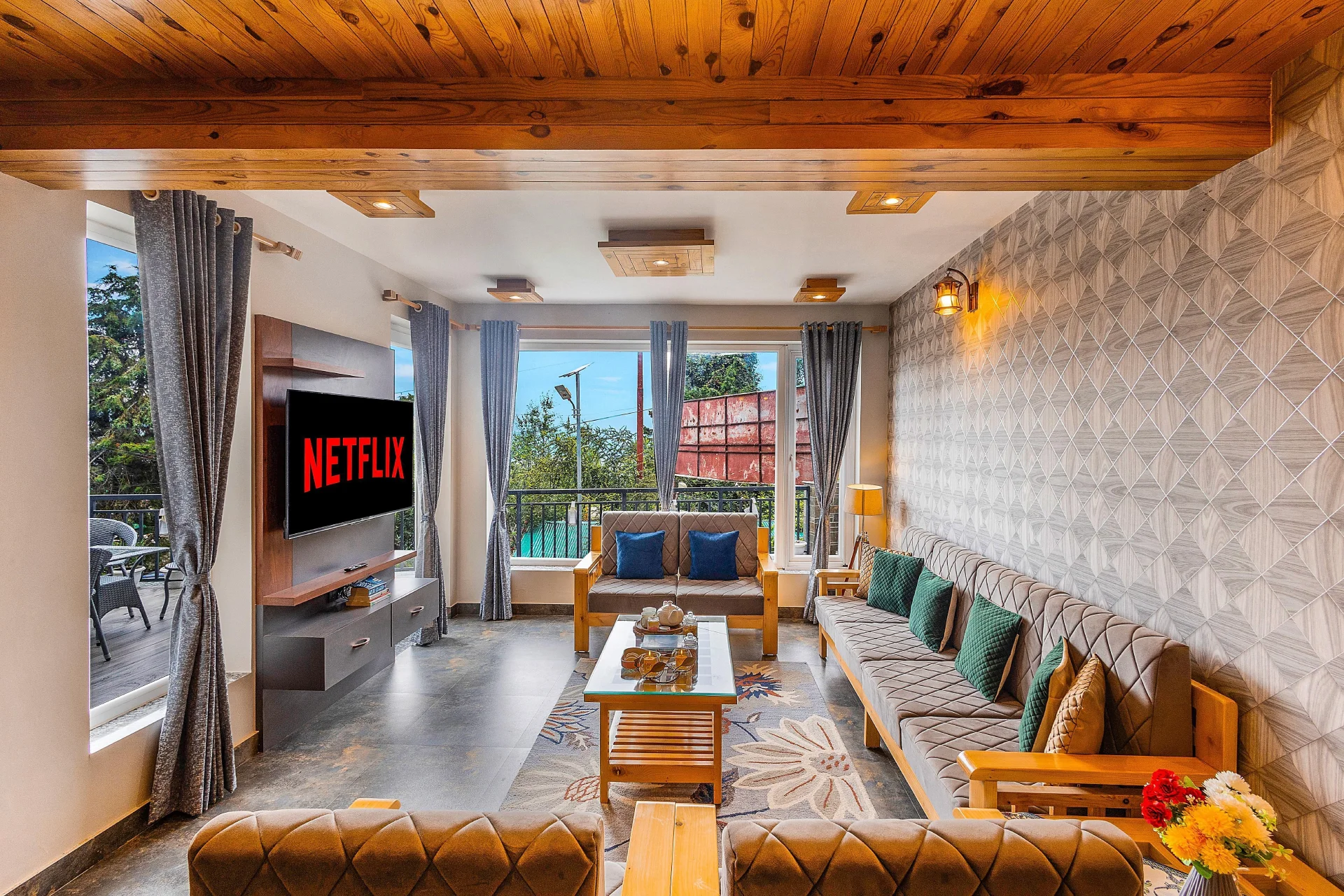 VODUK91 A Luxury Home Stay in Mukteshwar presents a spacious chalet featuring three bedrooms and three bathrooms. The living room boasts a comfortable seating area, perfect for unwinding. Guests benefit from complimentary WiFi, a terrace, and a balcony that overlooks the garden. The property is equipped with a fully functional kitchen, a kitchenette, and a lounge area. Additional amenities include a private check-in and check-out service, a buffet suitable for children, and free parking on-site.