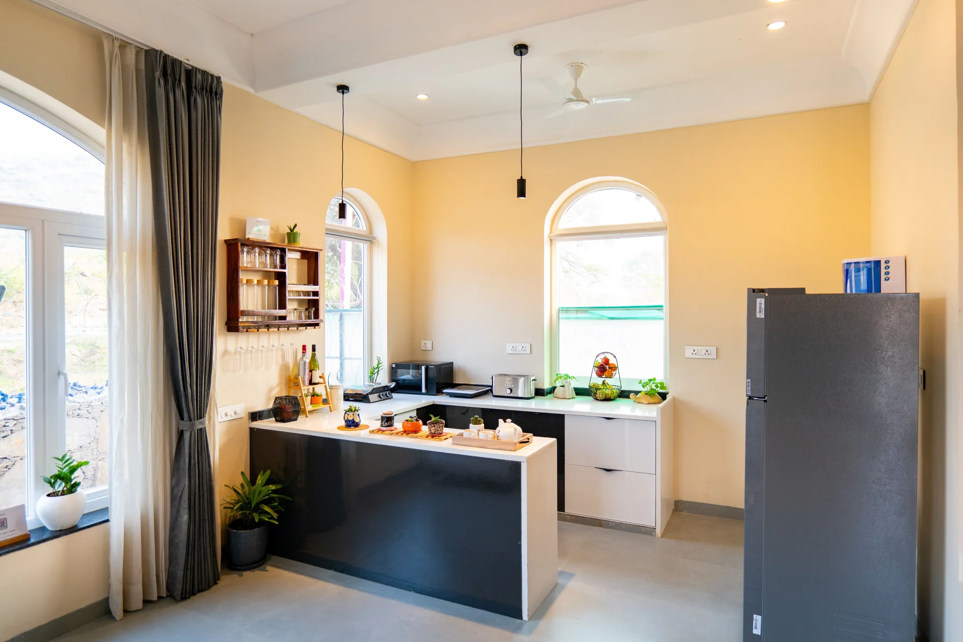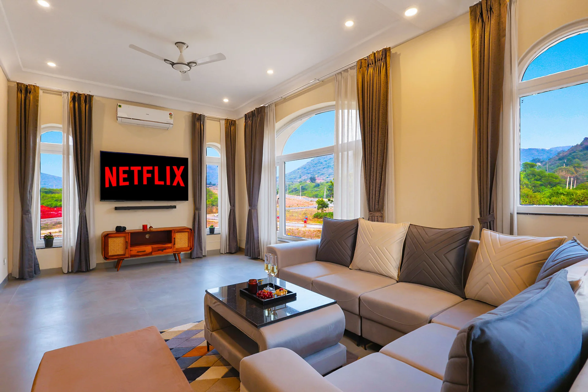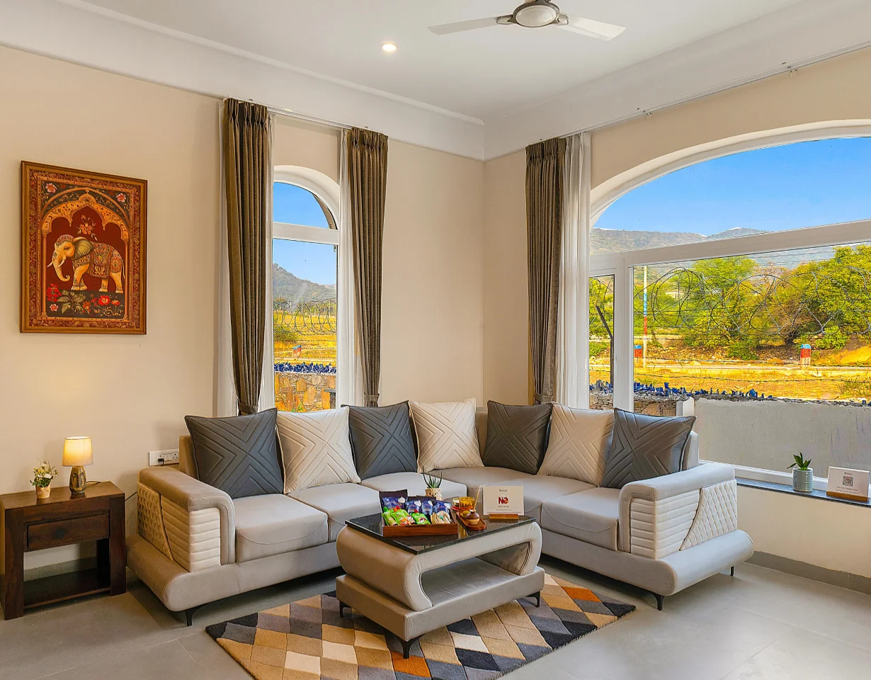 3 BHK Rooftop Pool Villa In Udaipur Situated in the core of nature, this exquisite villa featuring a European design harmoniously combines classic aesthetics with contemporary warmth. Positioned against a tranquil valley setting, it reveals bright interiors, arched windows, gentle neutral shades, and unobstructed vistas of the lake, hills, and lush surroundings.