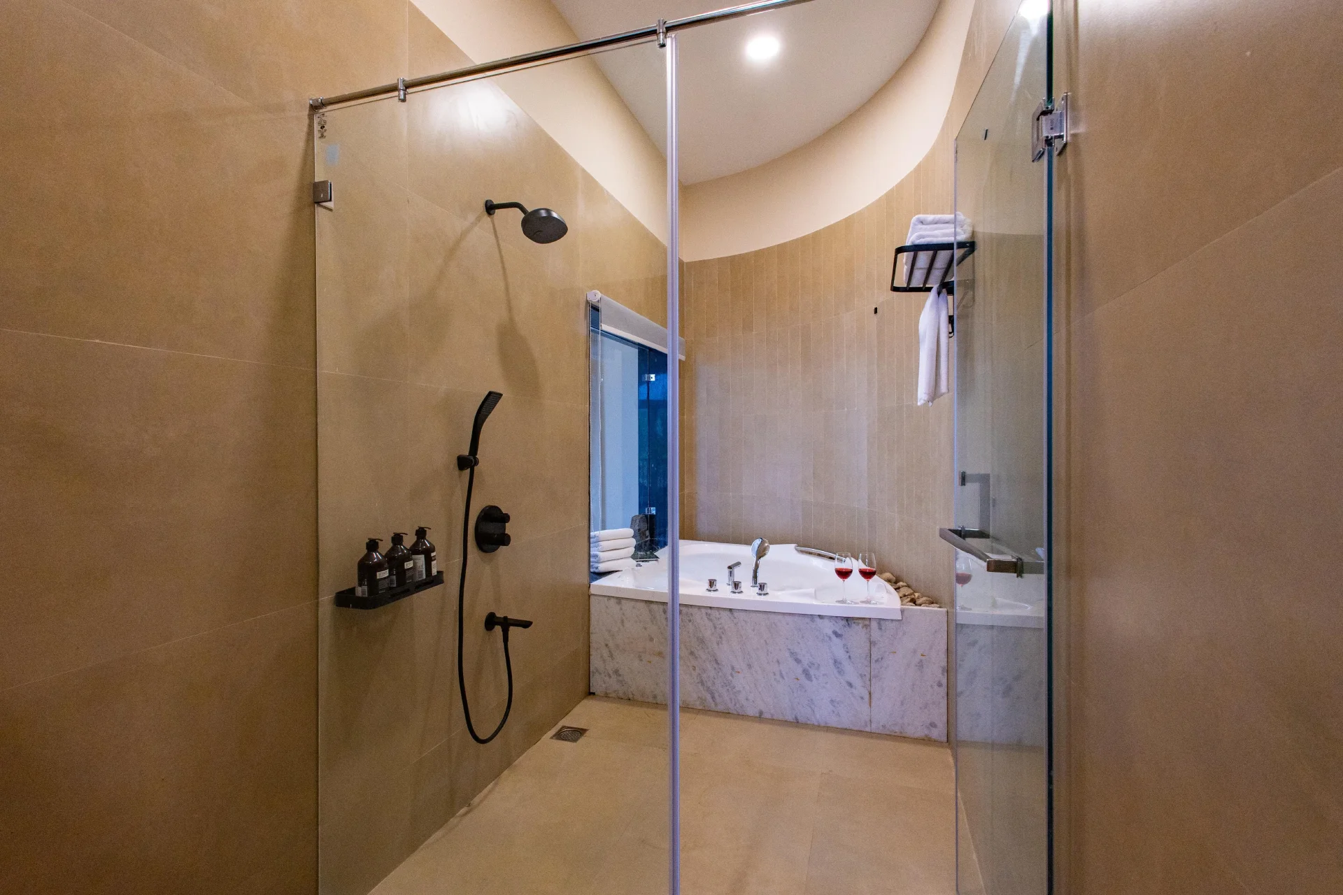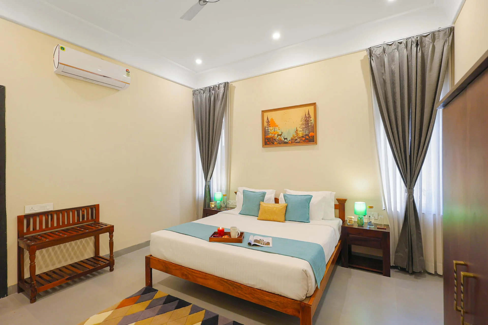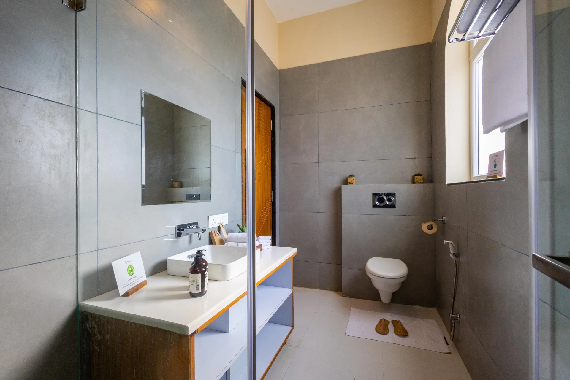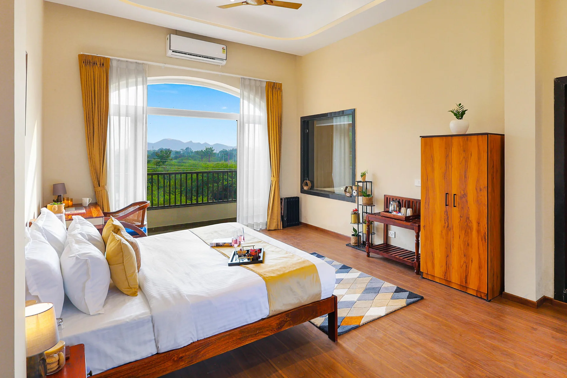 The villa boasts three meticulously designed bedrooms. Bedroom 1, located on the first floor, features a king-sized bed, a layout of 250 sq. ft., a workstation, wooden flooring, ambient lighting, a mini-fridge, and a large arched window that allows ample natural light to enter. It includes an attached balcony and a spacious ensuite bathroom equipped with a jacuzzi, shower, and organic toiletries. Bedrooms 2 and 3, situated on the ground floor, maintain the same serene aesthetic, each measuring 168 sq. ft., and furnished with king-sized beds, arched or full-height windows, recessed lighting, TV units, indoor plants, and tranquil views of the hills.