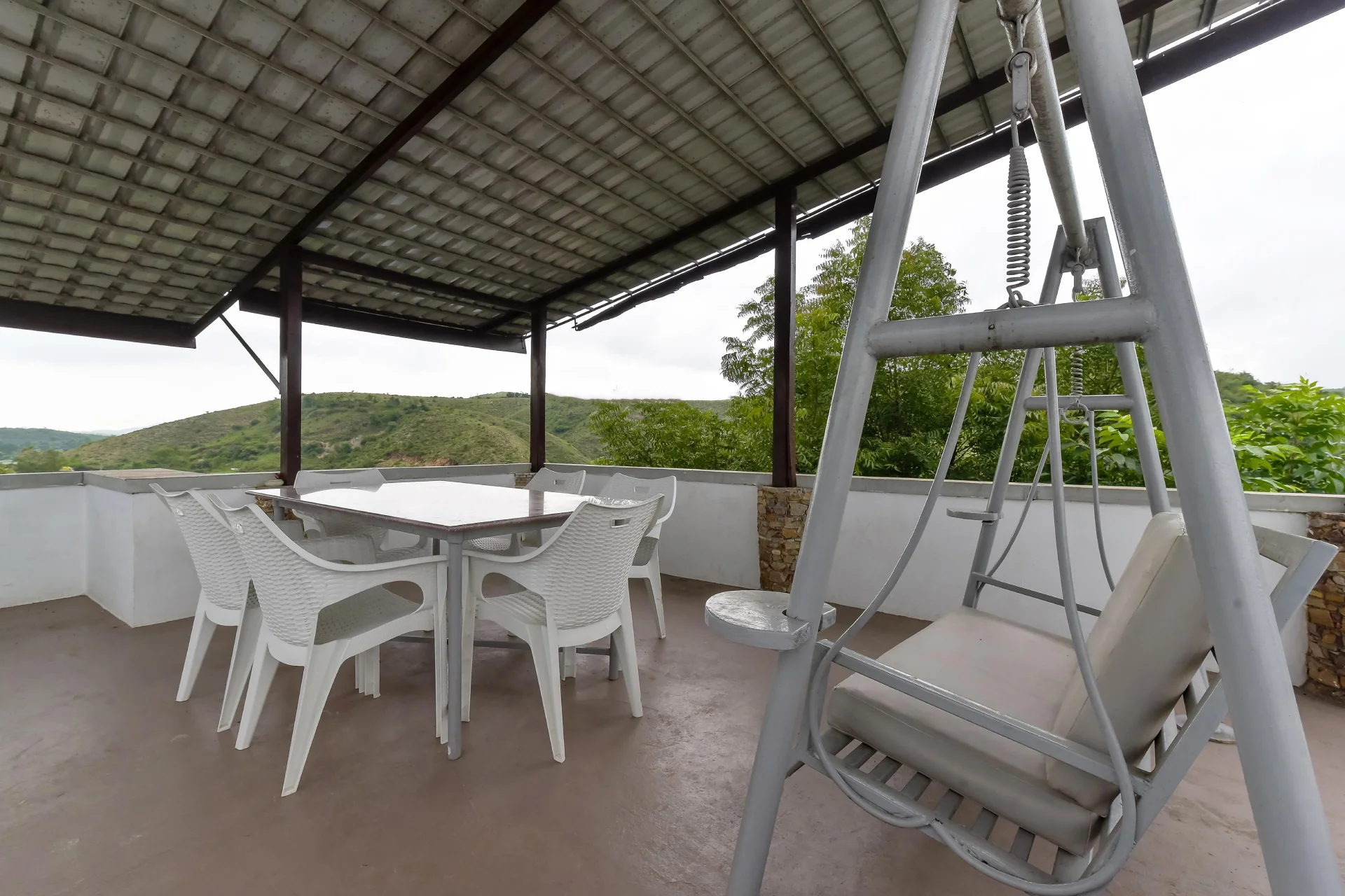 Escape to VODRJ245 Villa, situated near Udaipur. The main attraction is a private infinity pool, which spans 400 sq. ft. and is strategically placed to capture the stunning views of the surrounding hills. The pool has a shallow depth of 4.5 ft, accompanied by white sun loungers and warm lighting that enhances the ambiance around the deck. Nearby, a hammock is suspended between trees, providing the perfect spot for leisurely afternoons or shaded reading sessions. This villa is pet-friendly and offers breathtaking mountain views, a private infinity pool, swings, bonfire facilities, BBQ nights, Wi-Fi, and a fully equipped kitchen.