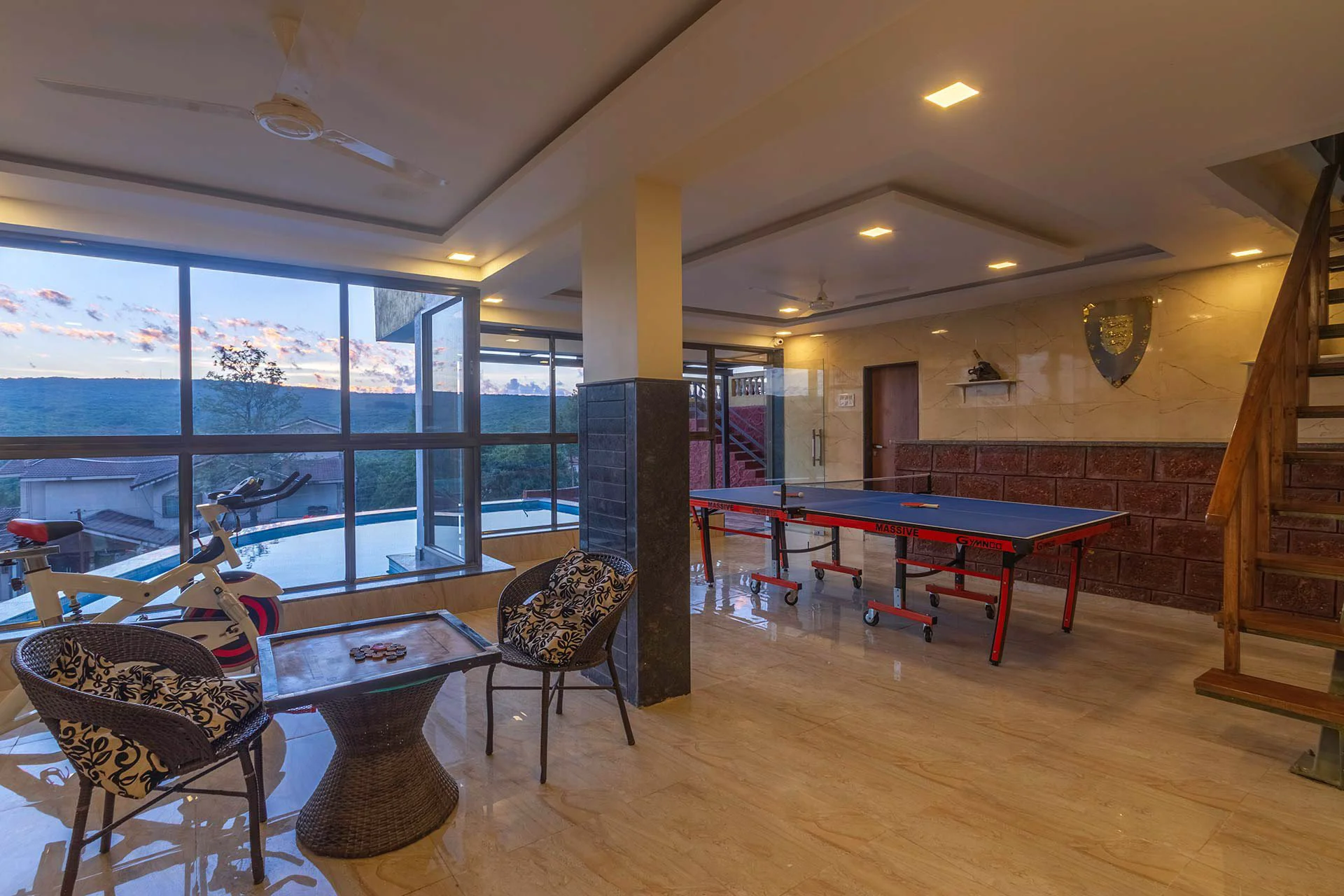 VODMH284 Villa in Mahabaleshwar provides a villa that includes a garden, terrace, and complimentary WiFi. Guests benefit from private check-in and check-out services, a lounge, and an outdoor seating area. The property is equipped with air-conditioning, a pool with a view, a balcony, and a dining area. Additional features consist of a refrigerator, microwave, television, and complimentary toiletries. Free private parking is available on-site.