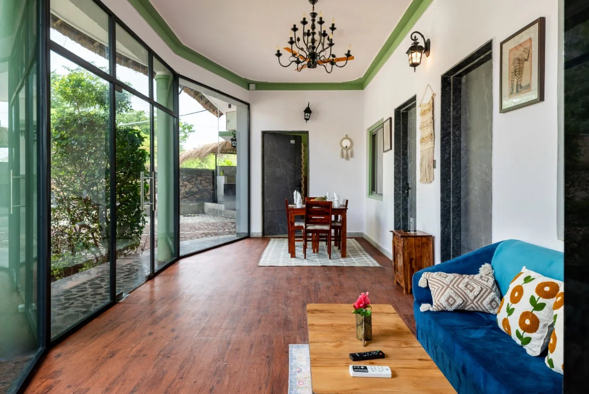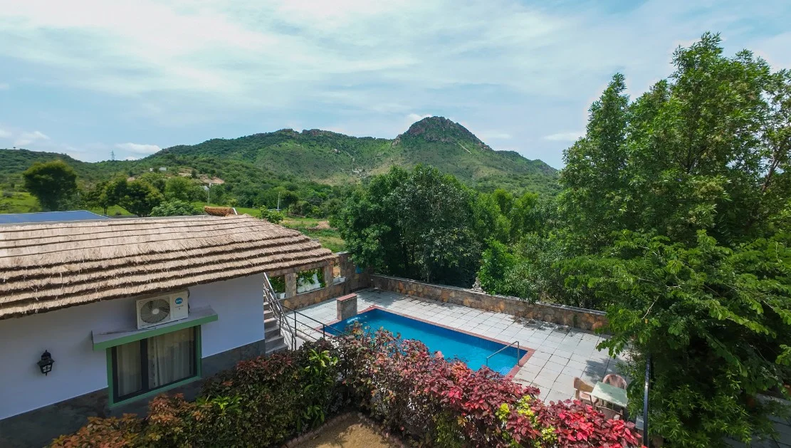 4.5 BHK Pool Villa In Udaipur Experience the allure of rural living at VODRJ210 Villa, a meticulously crafted sanctuary situated in the tranquil environment of Dangiyo Ki Hundar. Surrounded by nature, the villa is thoughtfully equipped to make your stay relaxing and memorable.