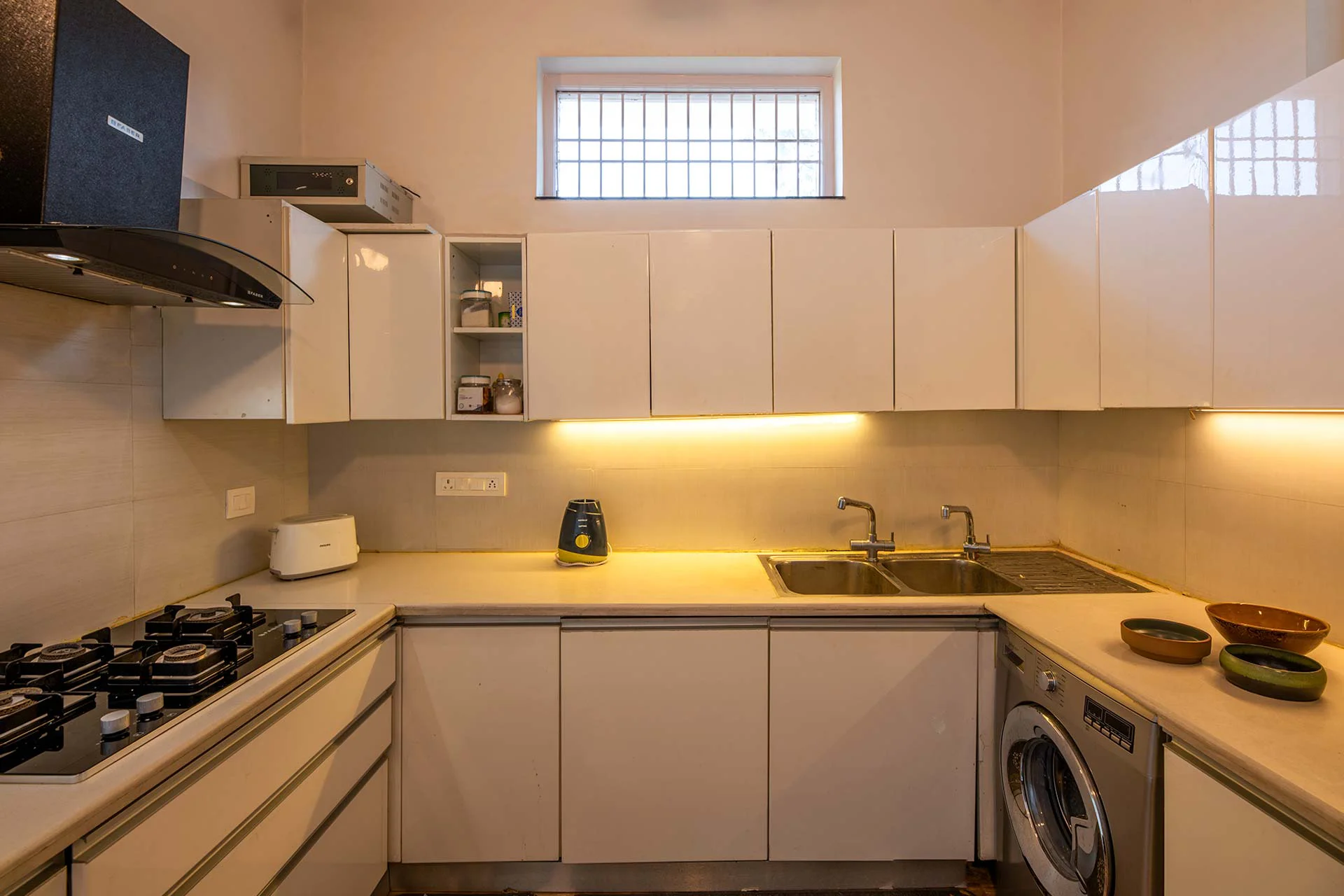 VODRJ183 Villa in Jaipur features a villa that includes a garden, terrace, and balcony offering views of the garden. Complimentary WiFi is accessible throughout the premises. The villa is equipped with air conditioning, a fully furnished kitchen, a washing machine, and private bathrooms. Additional amenities comprise a dining area, outdoor seating, and free private parking on-site. The reception staff are fluent in both English and Hindi. Upon entering the farm stay, guests are welcomed by the opulent lawns that envelop the property in lush greenery. The impressive architecture of this villa is enhanced by its minimalist and calming color palette, which gives the exterior an attractive appearance.