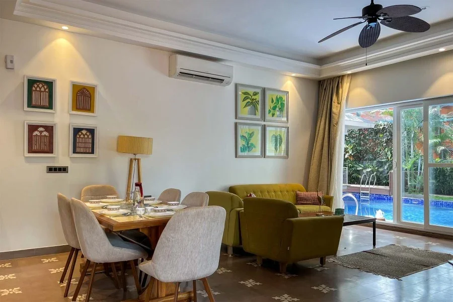 4 Bedroom Villa With Jacuzzi In Goa Situated in the tropical capital of India, Villa VODGA98 in Goa serves as an ideal retreat, offering a plethora of experiences. The exterior features a charming lawn and presents a remarkable facade characterized by contemporary architecture in traditional Portuguese hues.
