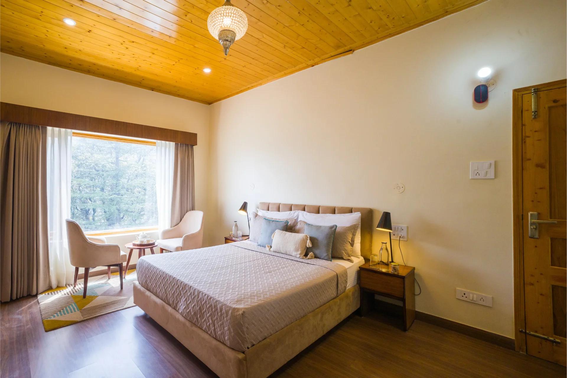 Lush greenery blankets the terraced garden, presenting unobstructed views of the rolling peaks. A stylish white wicker dining set, positioned around a glass-topped table, creates a perfect setting for leisurely breakfasts and intimate evening teas. Each bedroom radiates warmth and sophistication with its wooden interiors, entertainment unit, and expansive windows. A snug seating nook by the windows offers breathtaking views of the hills and verdant surroundings. The property is situated 30.6 km from Jakhu Temple and 40.2 km from Tara Devi Mandir. The closest airport is Shimla Airport, located 49.9 km from the accommodation.We recently spent a magical few days at luxury Villa in Udaipur booked through Villas On Demand and the entire experience was so amazing. Every detail of our stay was Carefully planned, making this trip an unforgettable one for all of us.