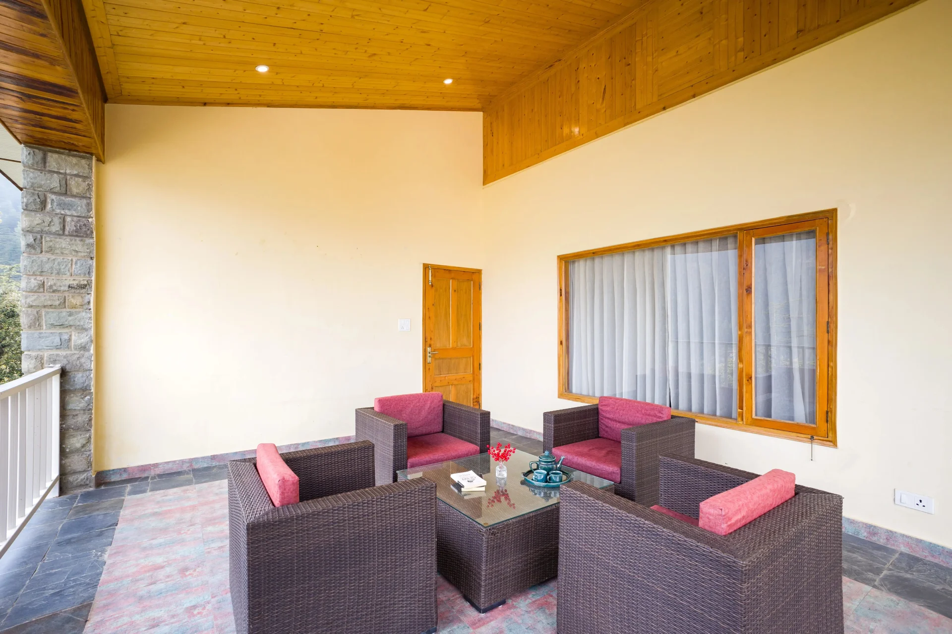 5 BHK Villa With Lounge In Shimla, a spacious balcony adorned with a wooden ceiling and stylish seating offers a view of the tranquil landscape, making it an ideal place to relax. Its semi-open layout fosters a peaceful retreat, perfect for unwinding or savoring the fresh mountain air. The lounge area is tailored for leisure, equipped with a table tennis setup and a carrom board for endless entertainment. Nearby, plush beige loungers provide a cozy spot to curl up with a book and relish the serene atmosphere. The property features a 24-hour front desk and room service available for guests. In the hotel rooms, amenities include air conditioning and a flat-screen TV.