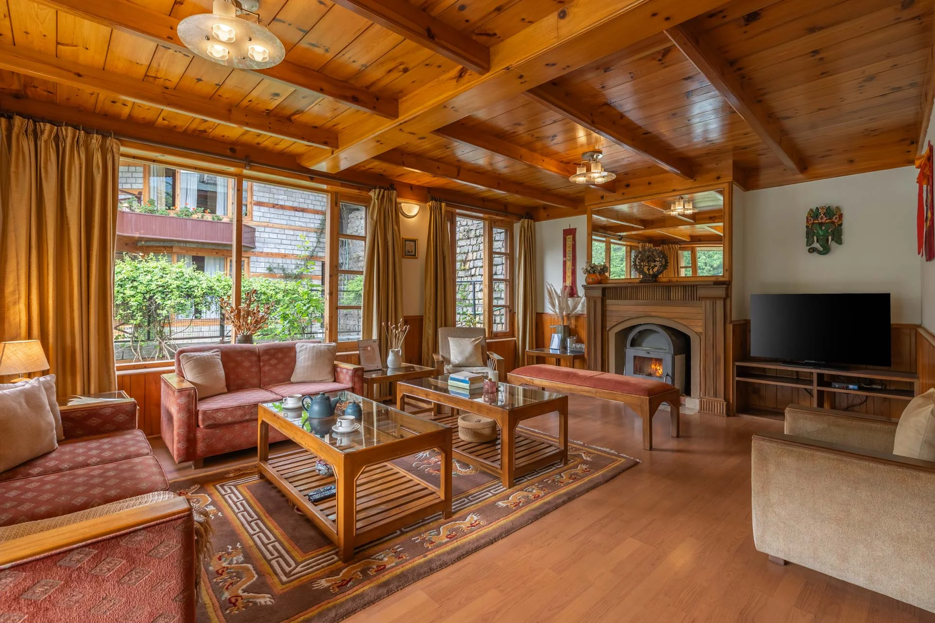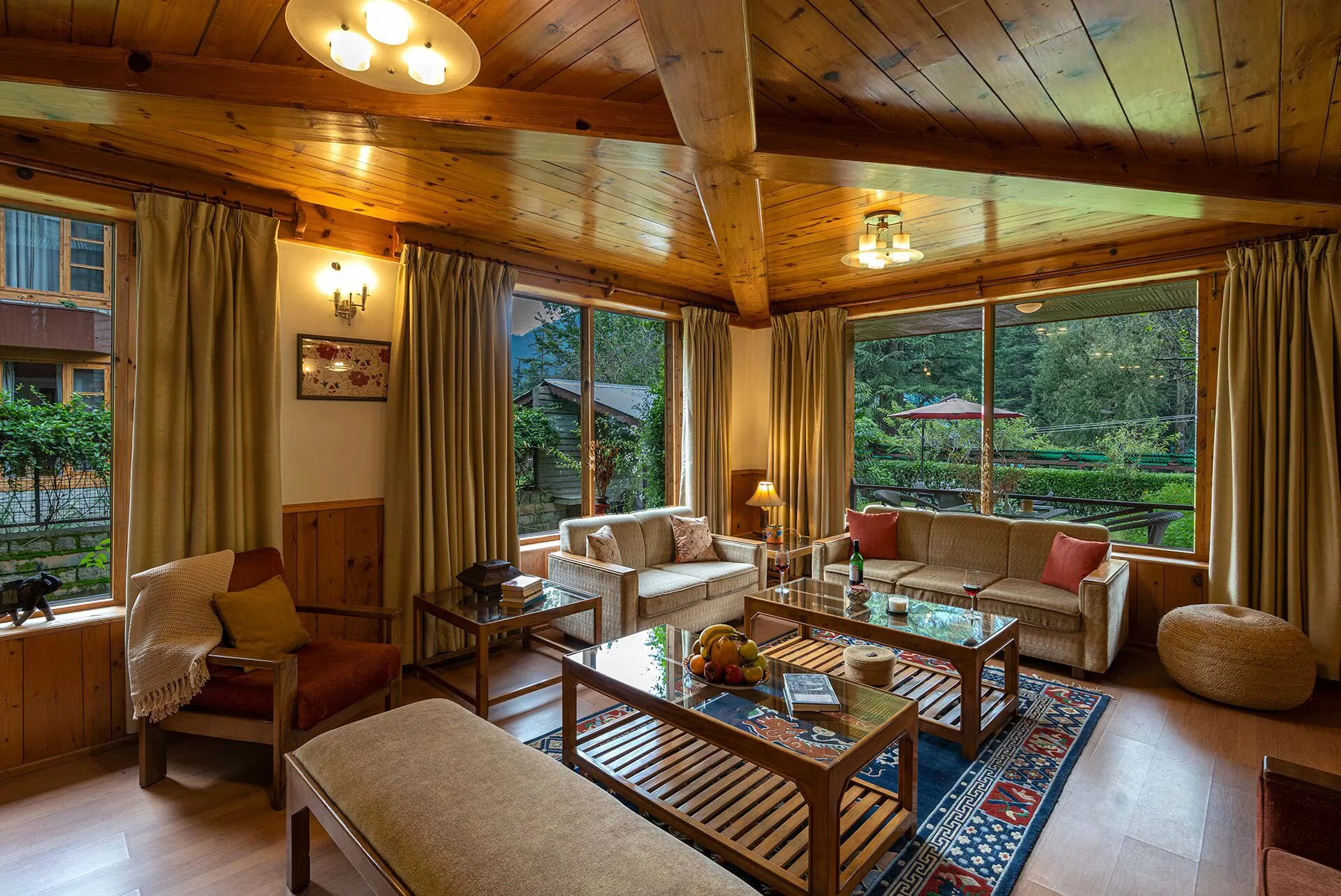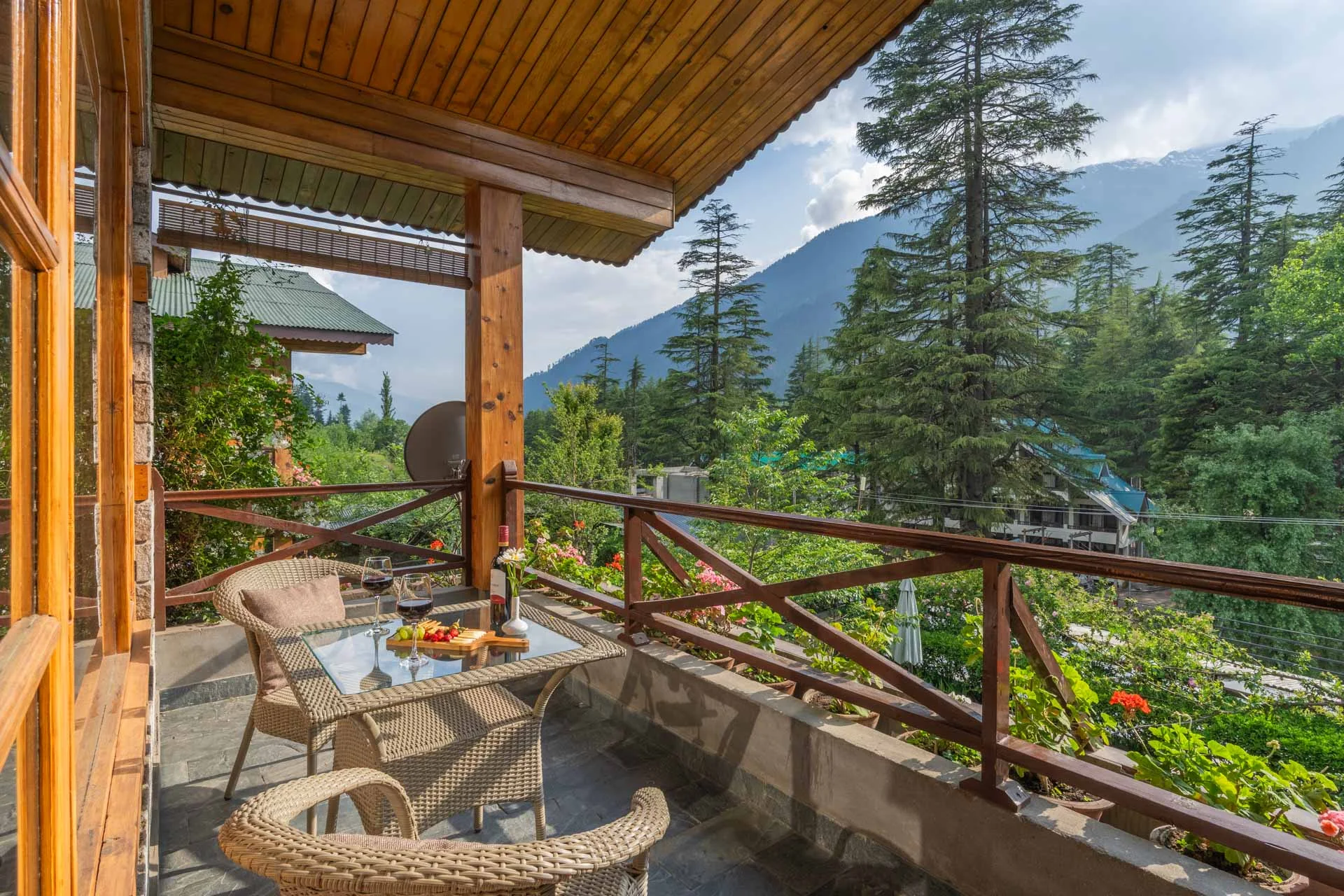 Luxury 9 BHK Villa With Lawn In Manali A lush forest, striking modern wooden interiors, and breathtaking views enable these Swiss chalets to be truly unique. Made with a personal touch, the wooden furnishings, angled ceilings, and large windows give this home so much character. In this paradise of expansive corners, relaxation is limitless.