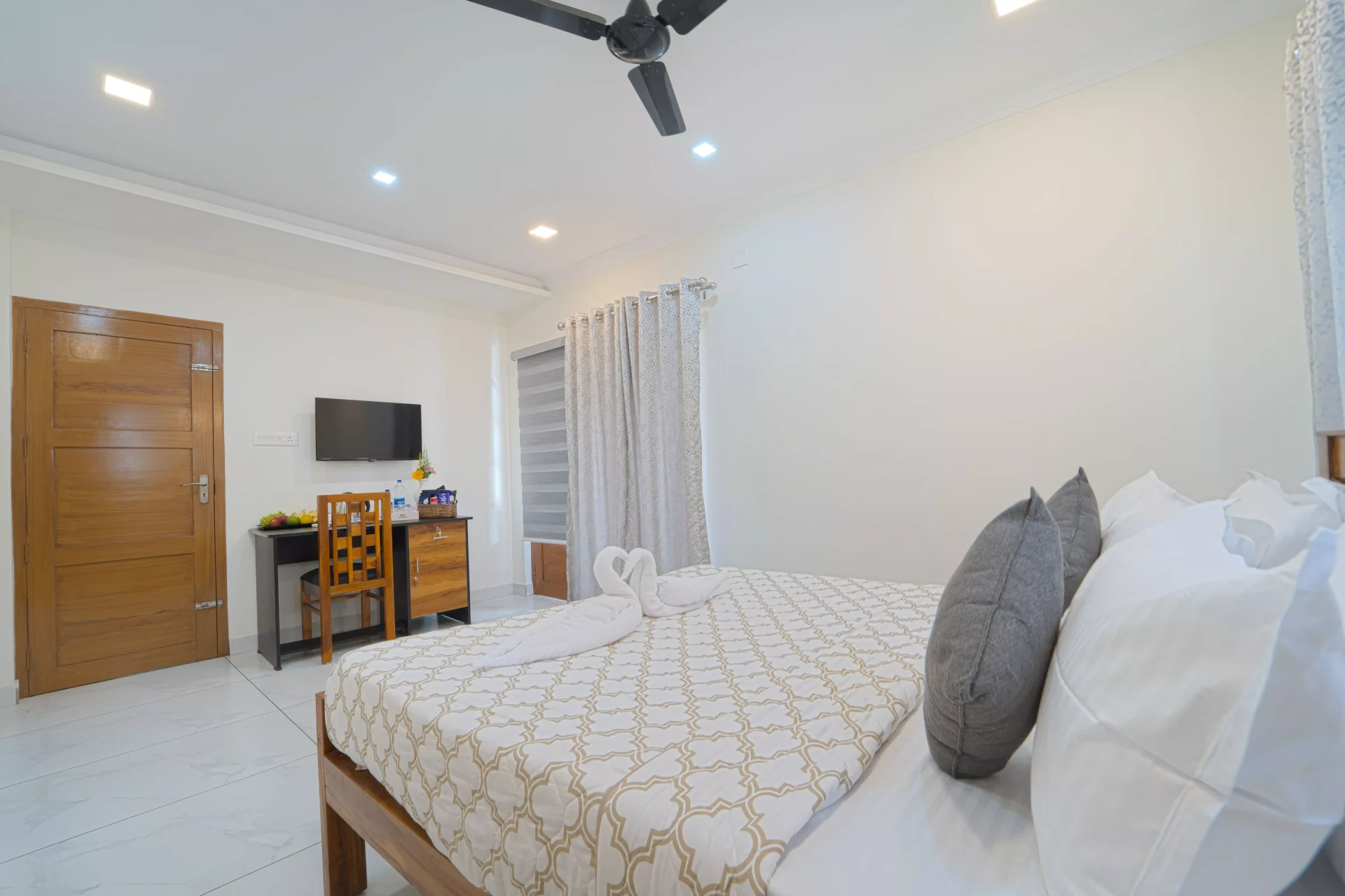 VODSI19 Homestay in Alleppey features a villa comprising one bedroom and one bathroom. Guests benefit from complimentary WiFi and air-conditioning, which contribute to a comfortable experience. The establishment offers free on-site private parking and a communal lounge area for relaxation. The spacious bedroom is equipped with a king-sized wooden bed, an ensuite bathroom, and soft white dรฉcor that enhances the tranquil atmosphere. Large glass windows, adorned with sheer curtains, provide panoramic views of the water, while the ensuite bathroom is outfitted with high-quality amenities. A dedicated workstation and a wall-mounted television ensure both comfort and convenience, while potted plants and gentle lighting introduce a sense of calm.