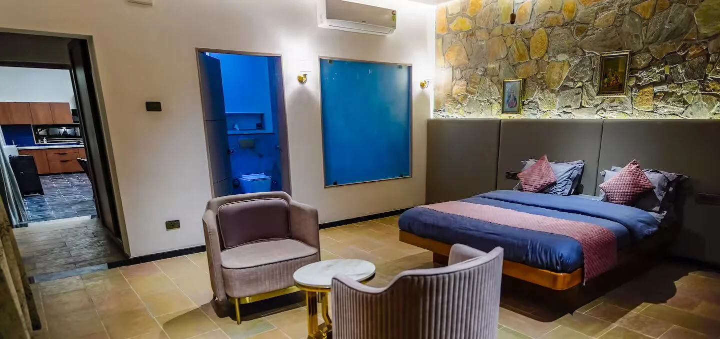 2 Bedroom Pet Friendly Villa In Udaipur Explore a charming and contemporary 2BHK farm villa situated only a few minutes away from Udaipur Airport, providing an ideal combination of comfort and serenity. This villa with 2 bedrooms is perfect for both tourists and travelers.