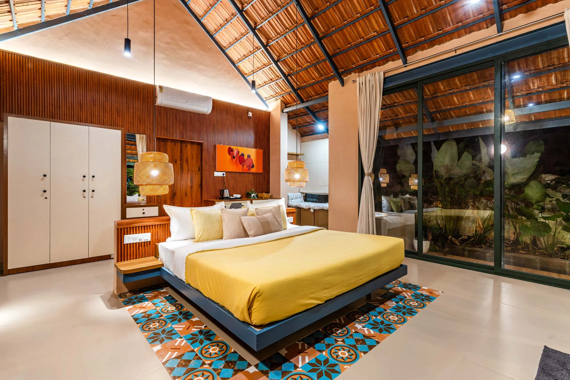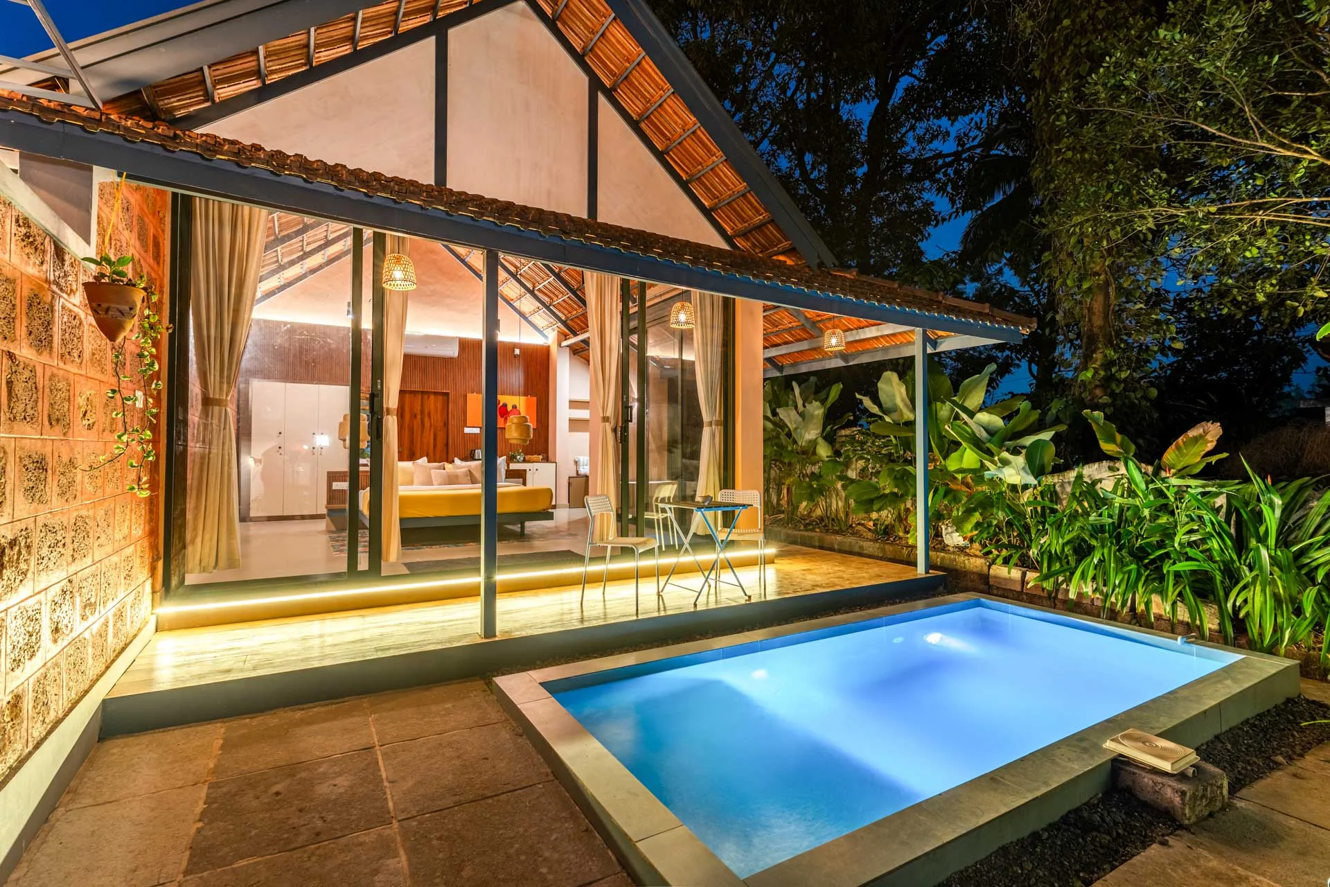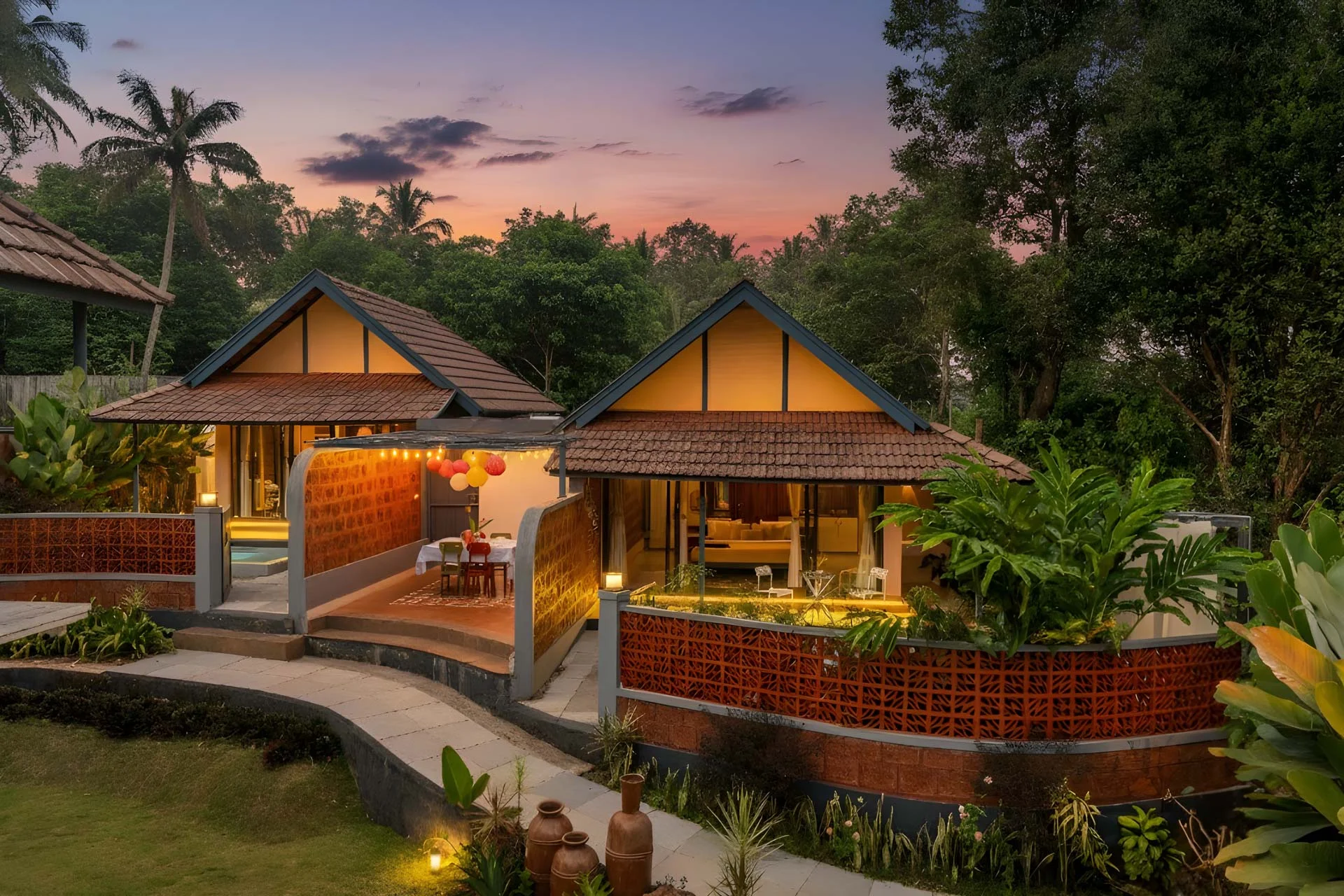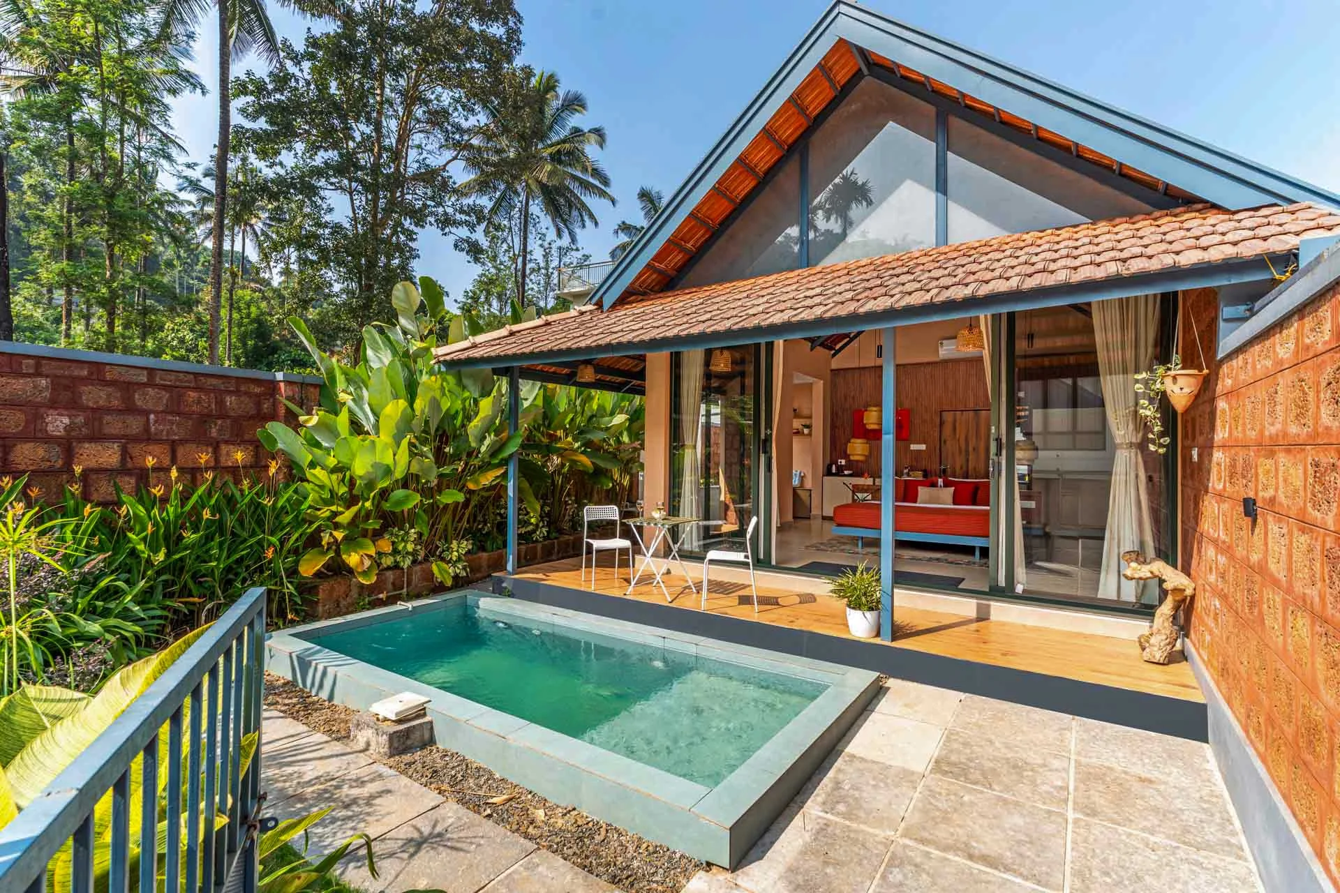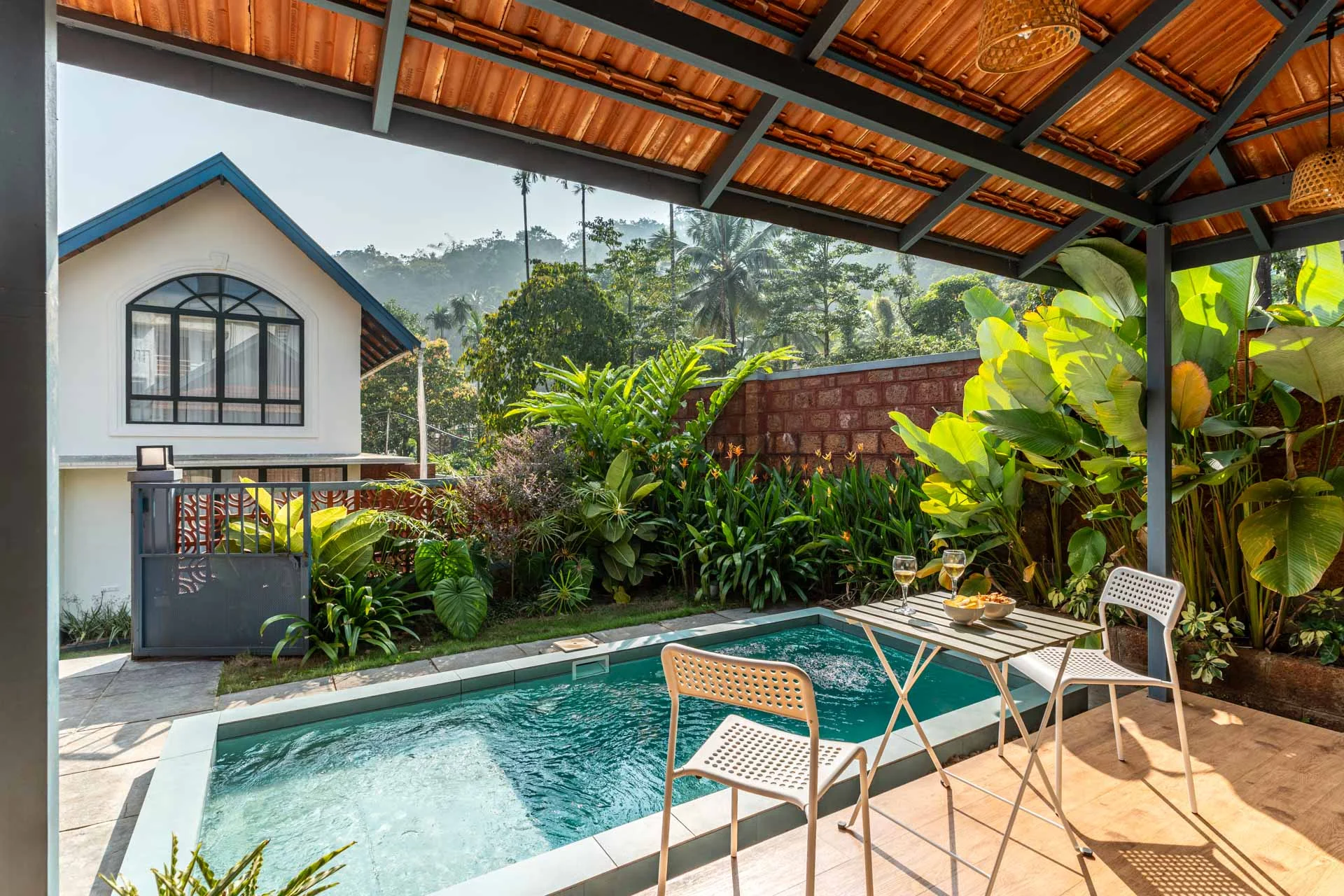2 Bedroom Plunge Pool Villa In Wayanad Nestled against the serene backdrop of Chembra Peak, there exists a villa in Wayanad, crafted as a tranquil retreat comprising two secluded cottages. The carefully designed jaali walls facilitate the passage of light and air throughout the residence while ensuring total privacy.