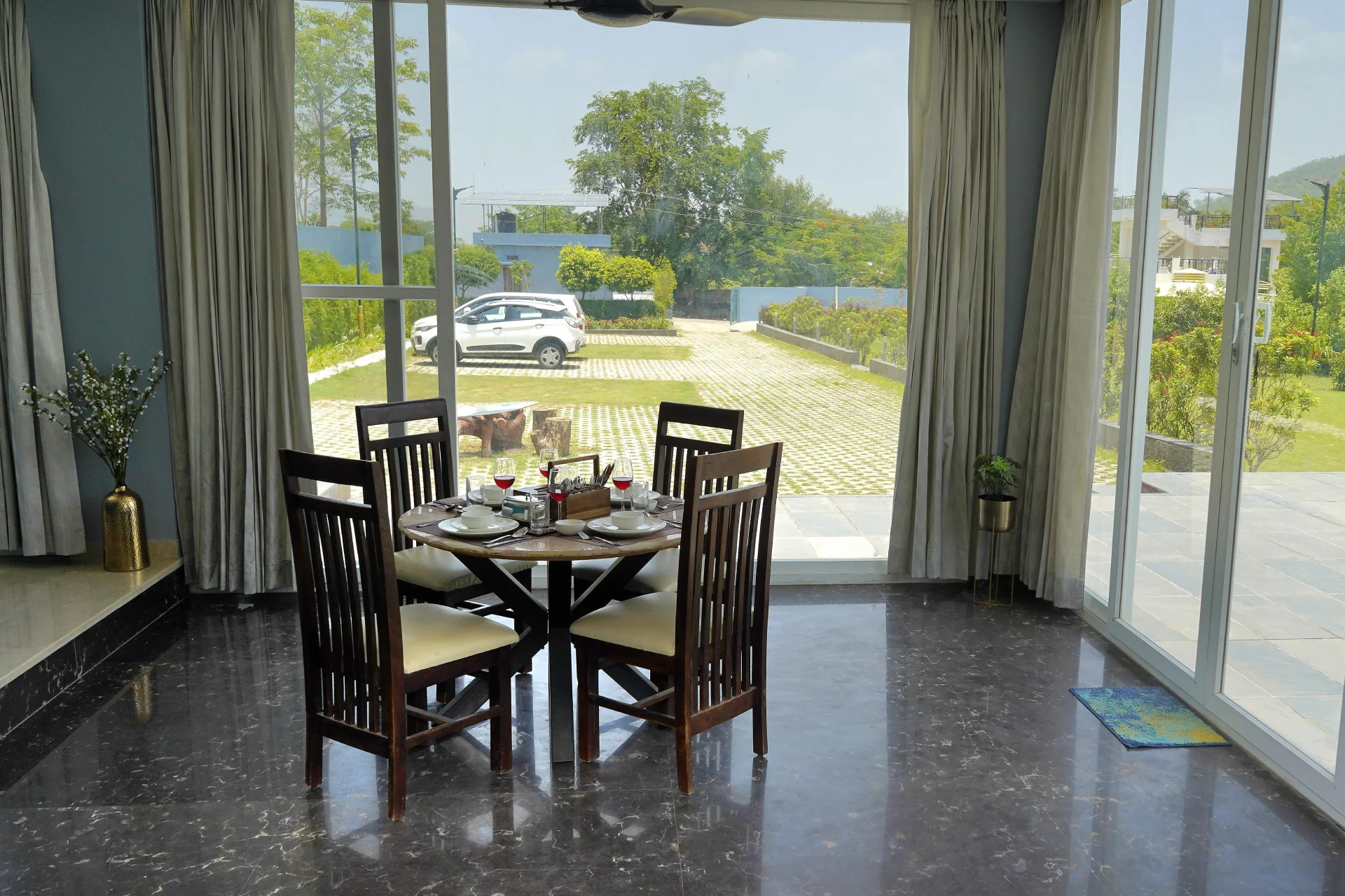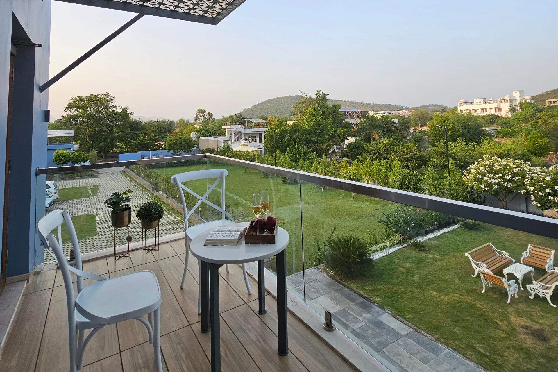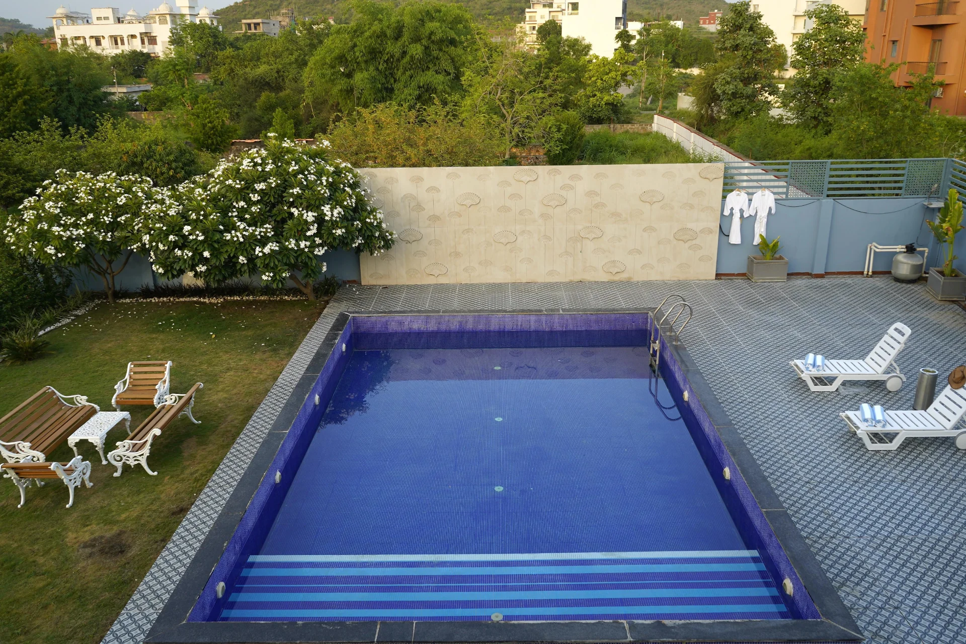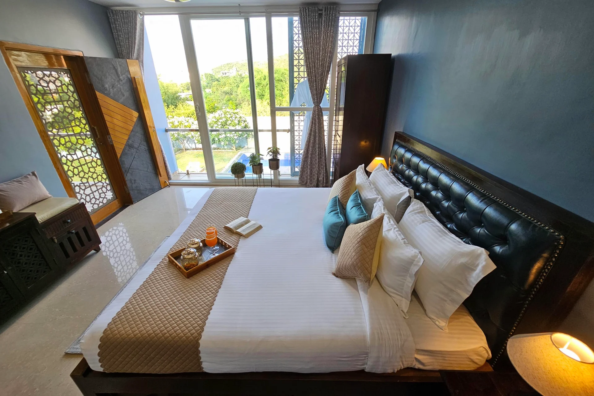 The reception staff are fluent in both English and Hindi. The poolside area is perfect for relaxation, with blue-tiled edges and sun loungers that facilitate a leisurely afternoon of doing nothing. The surrounding areas, including Fatehsagar and Badi Lakes, are naturally picturesque and breezy. Floor-to-ceiling windows allow ample sunlight to fill the interiors and provide serene views of the hills and valleys. Situated 29 km from Maharana Pratap Airport, the villa is conveniently located near Jagdish Temple 8 km, Bagore ki Haveli 8 km, and the City Palace of Udaipur 9 km.We recently spent a magical few days at luxury Villa in Udaipur booked through Villas On Demand and the entire experience was so amazing. Every detail of our stay was Carefully planned, making this trip an unforgettable one for all of us.