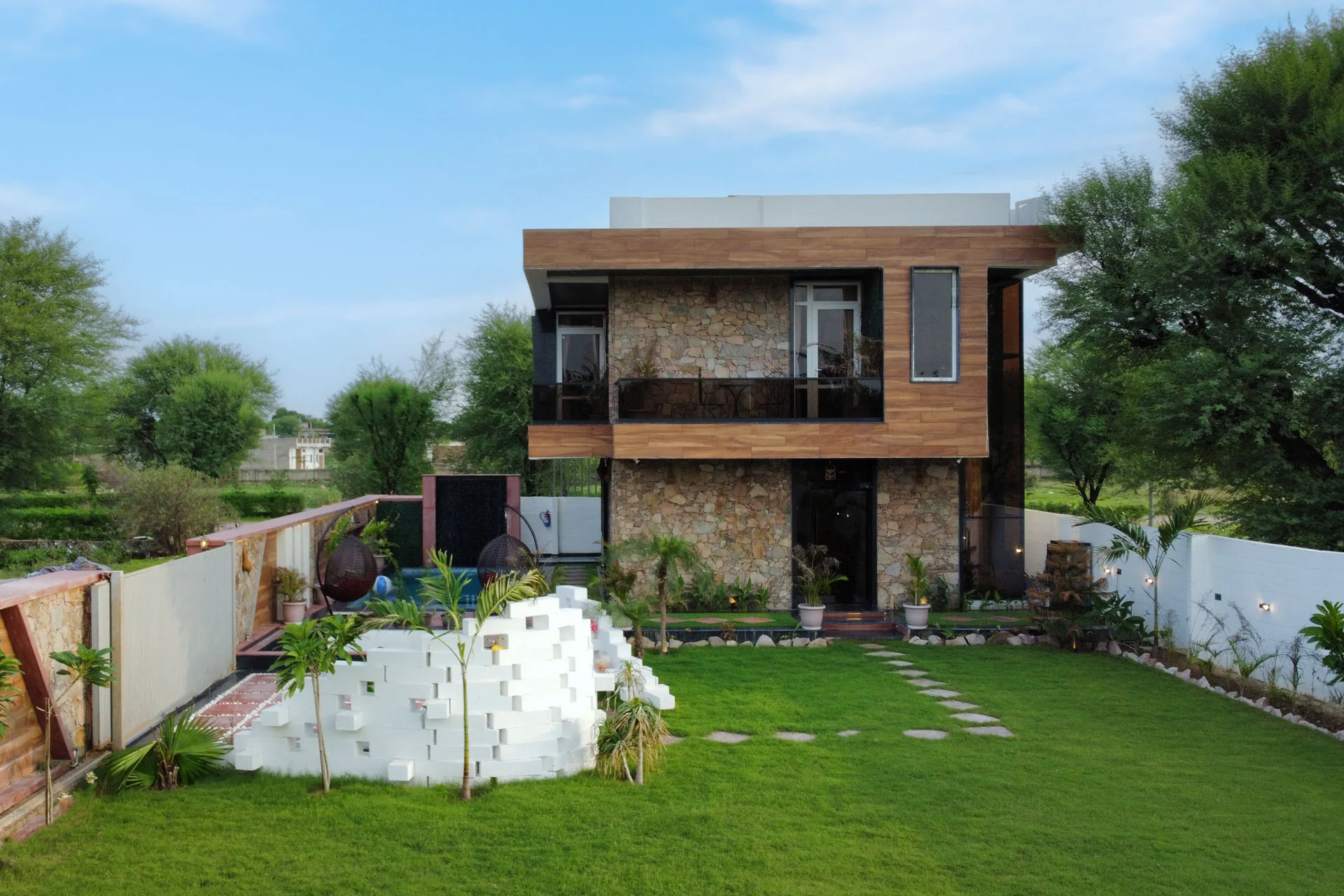 2 BHK Mountain View Villa In Jaipur VODRJ177 is a charming residence situated in the picturesque mountains of Jaipur. The villa features a contemporary rustic exterior, combining natural stone cladding with warm wooden accents, which fosters a welcoming and tranquil atmosphere.