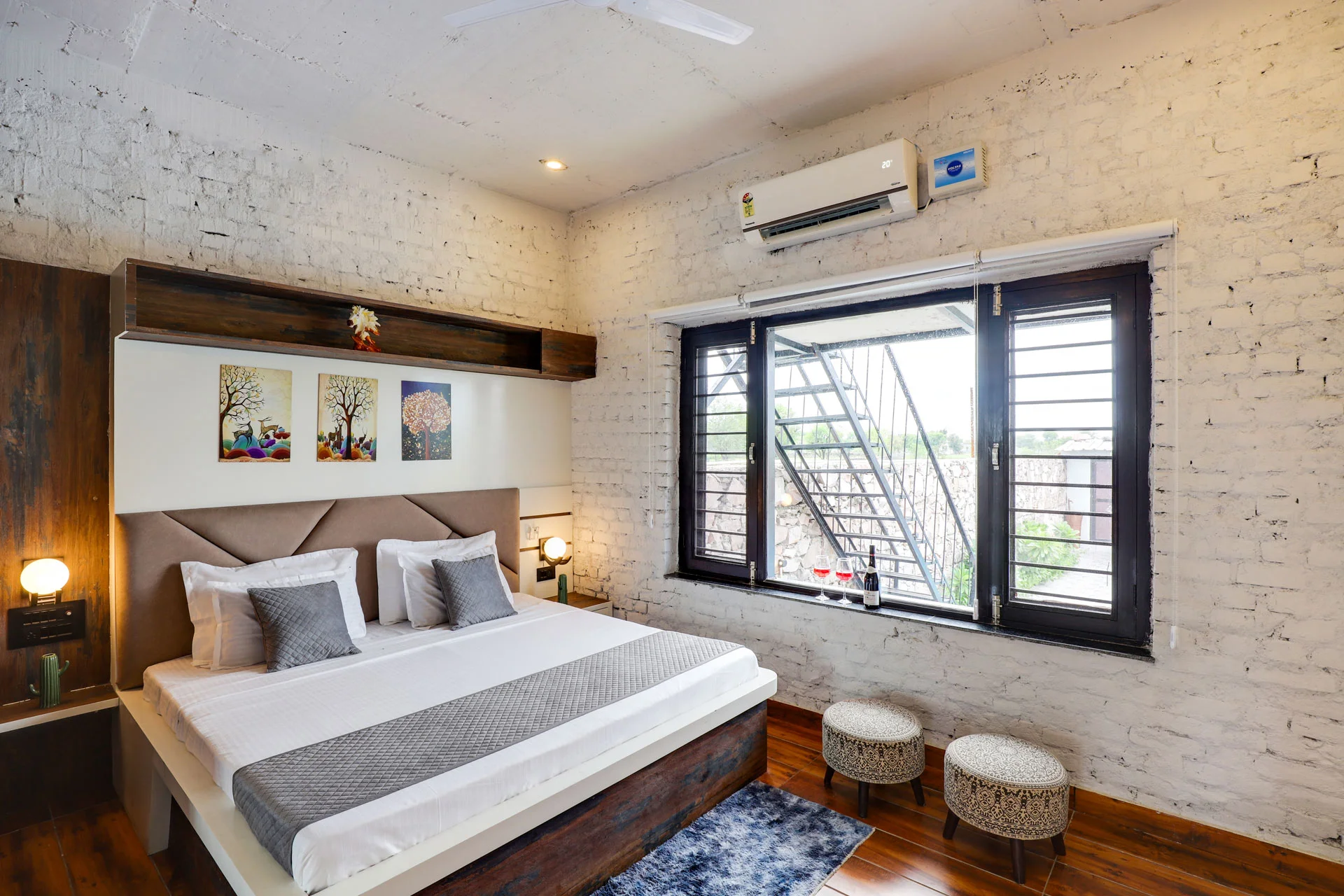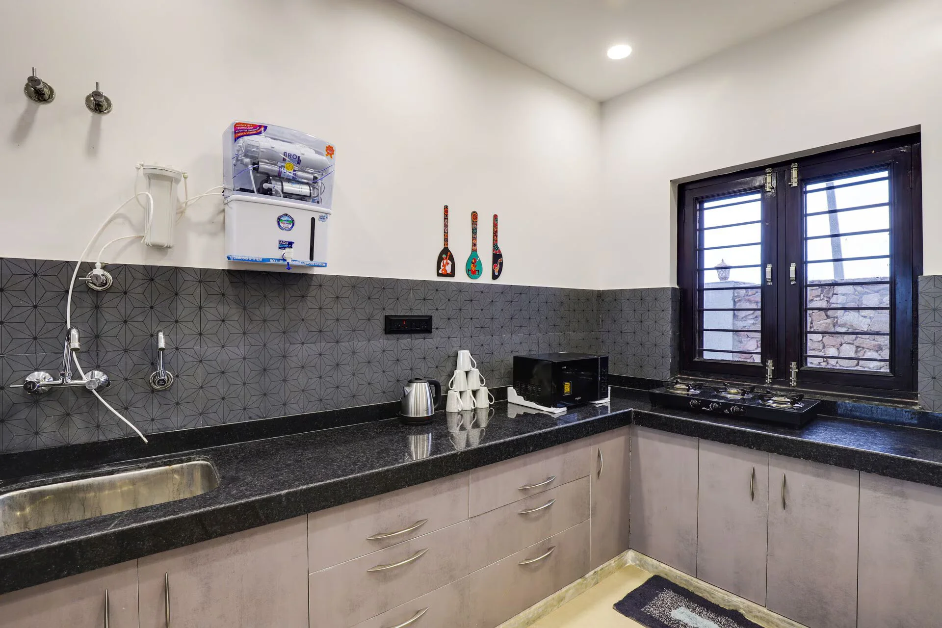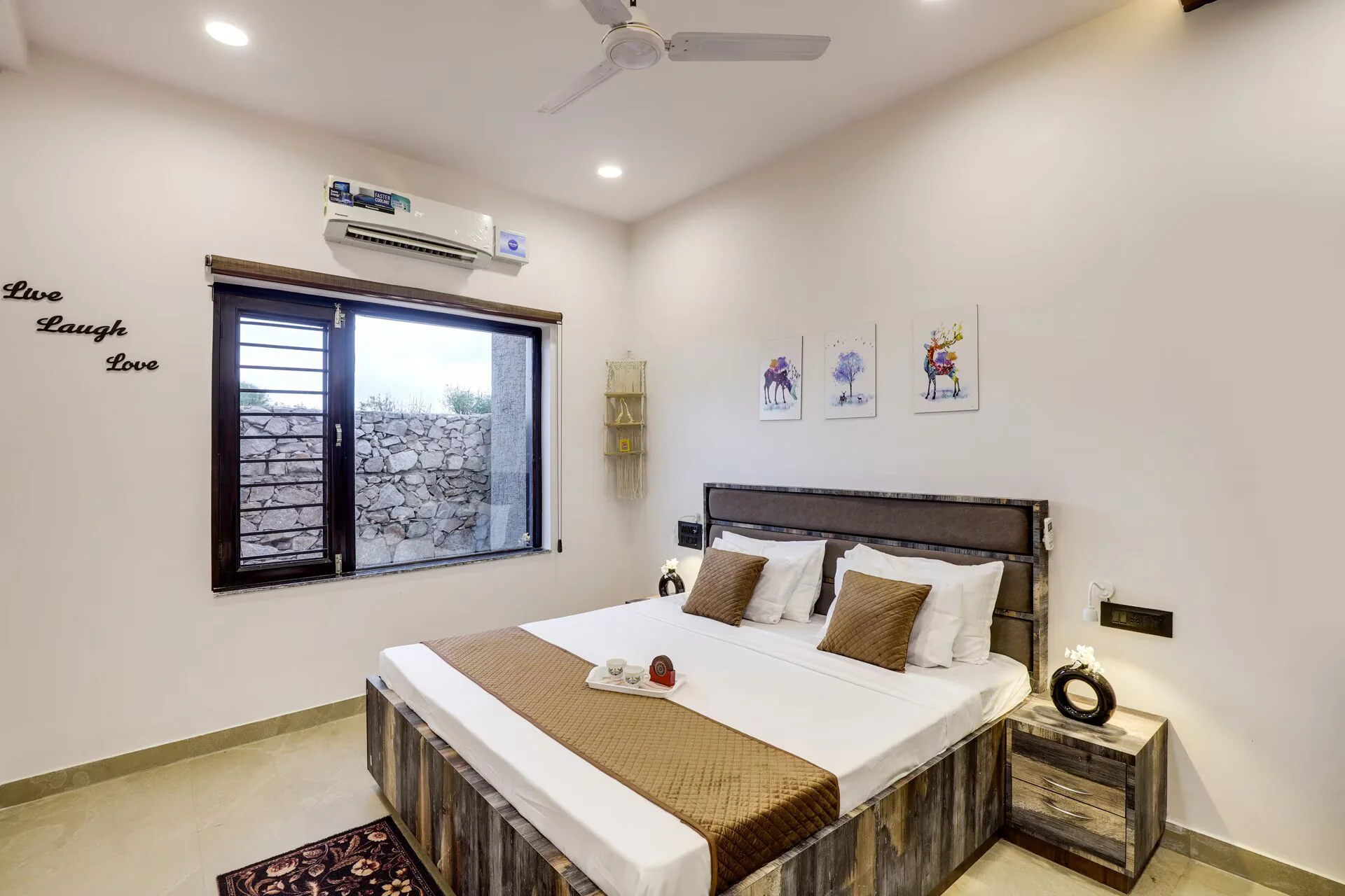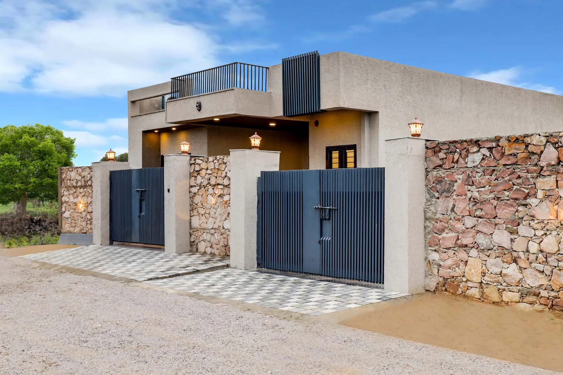 2 BHK Pet Friendly Villa In Jaipur Nestled within expansive agricultural land, VODRJ179 Villa distinguishes itself amid the verdant landscape, offering a peaceful escape from the hectic urban environment. Upon entering this splendid estate, you are instantly welcomed by modern contemporary architecture.