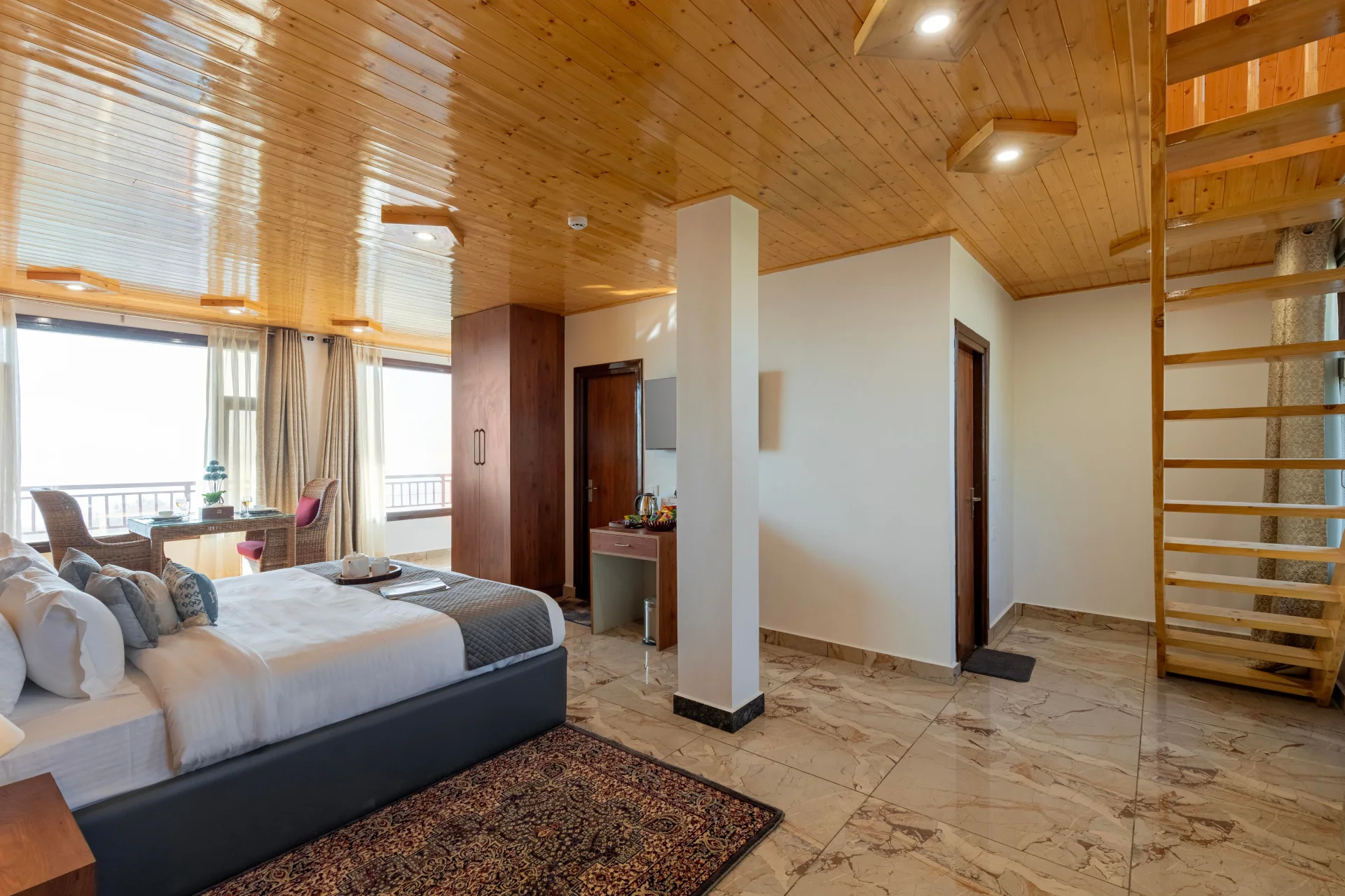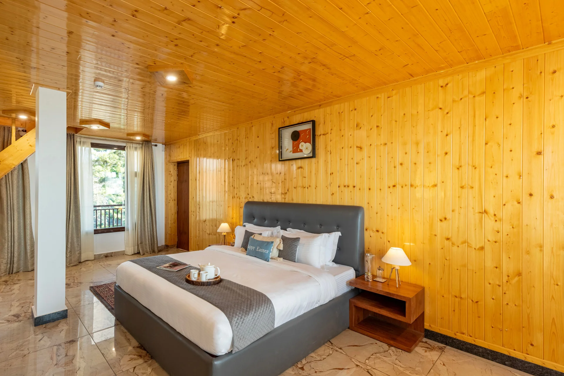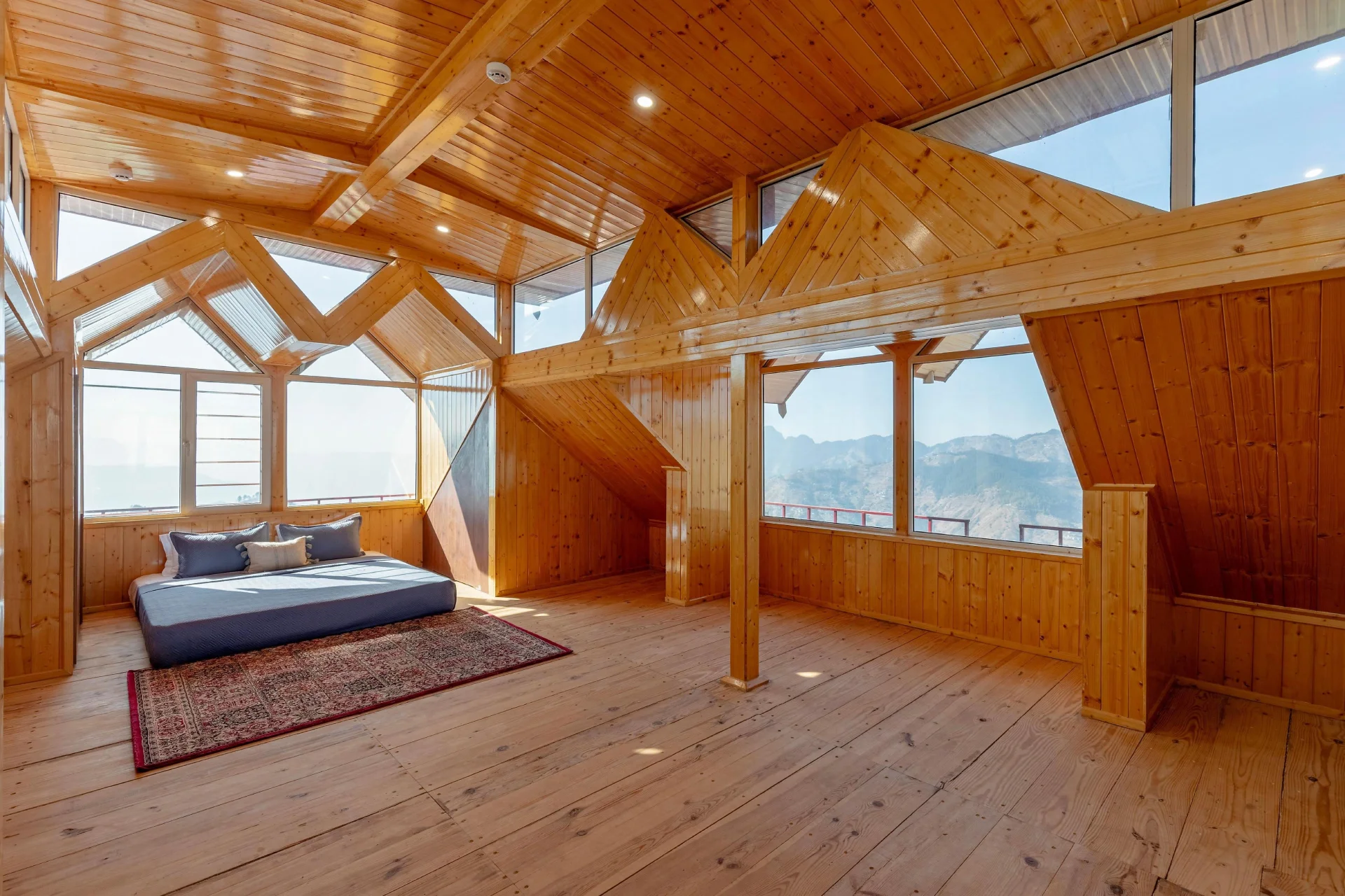 VODHP02 Room with Attic & Hill views in Shimla presents a recently refurbished 4-star villa featuring two bedrooms and two bathrooms. The bedroom is seamlessly connected to a charming wooden attic, which boasts large glass windows that showcase the sweeping view of the far-off, misty mountains. Guests benefit from a private entrance, tiled flooring, and a fully equipped kitchenette.