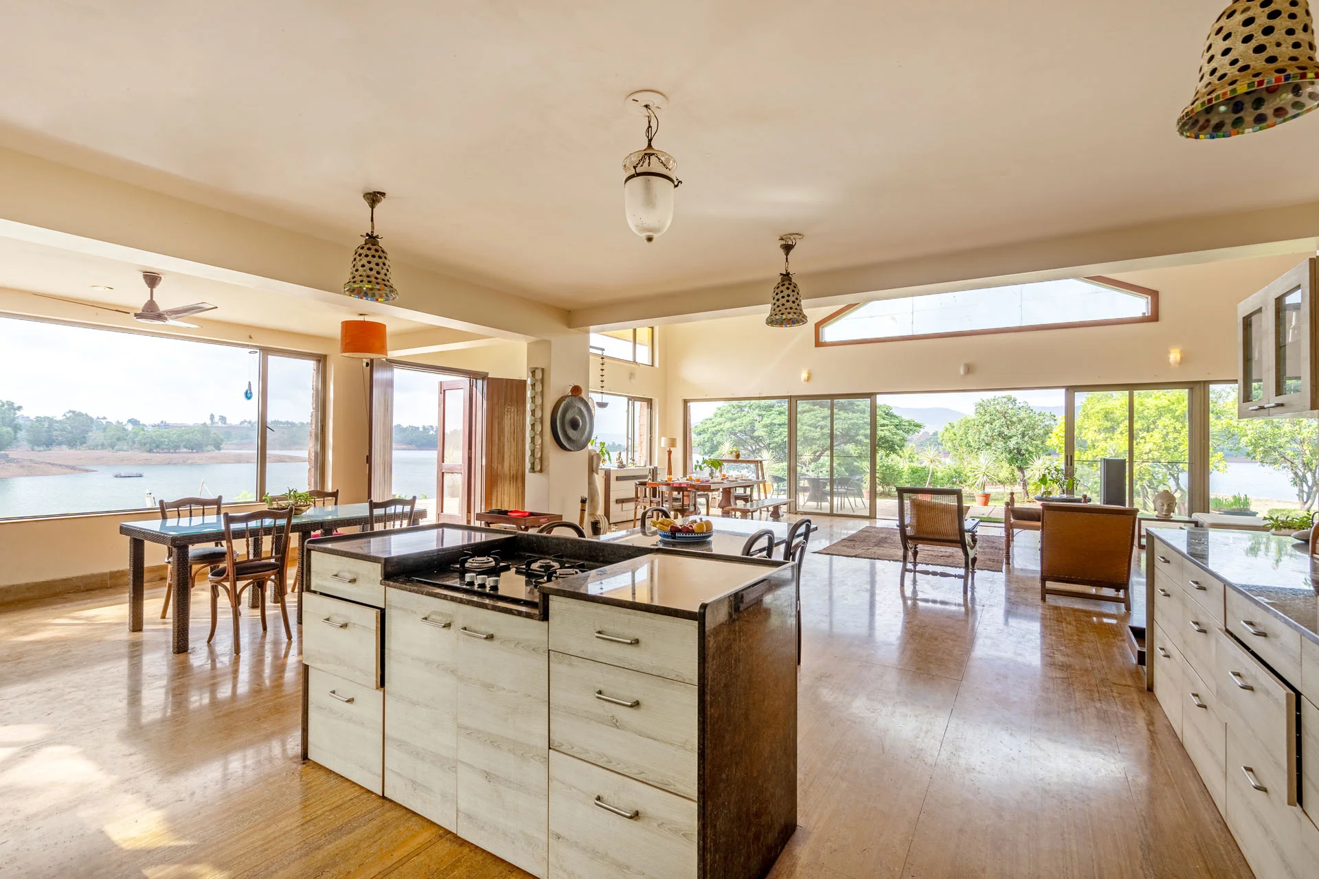 3 Bedroom Lake View Villa In Lonavala VODMH306 Villa is a delightful residence located in the scenic Kamshet area close to Lonavala. This beautiful villa provides stunning views of the lake, uniquely encircled by water on three sides. The villa showcases a combination of classic charm and minimalist design, resulting in a warm and welcoming ambiance.