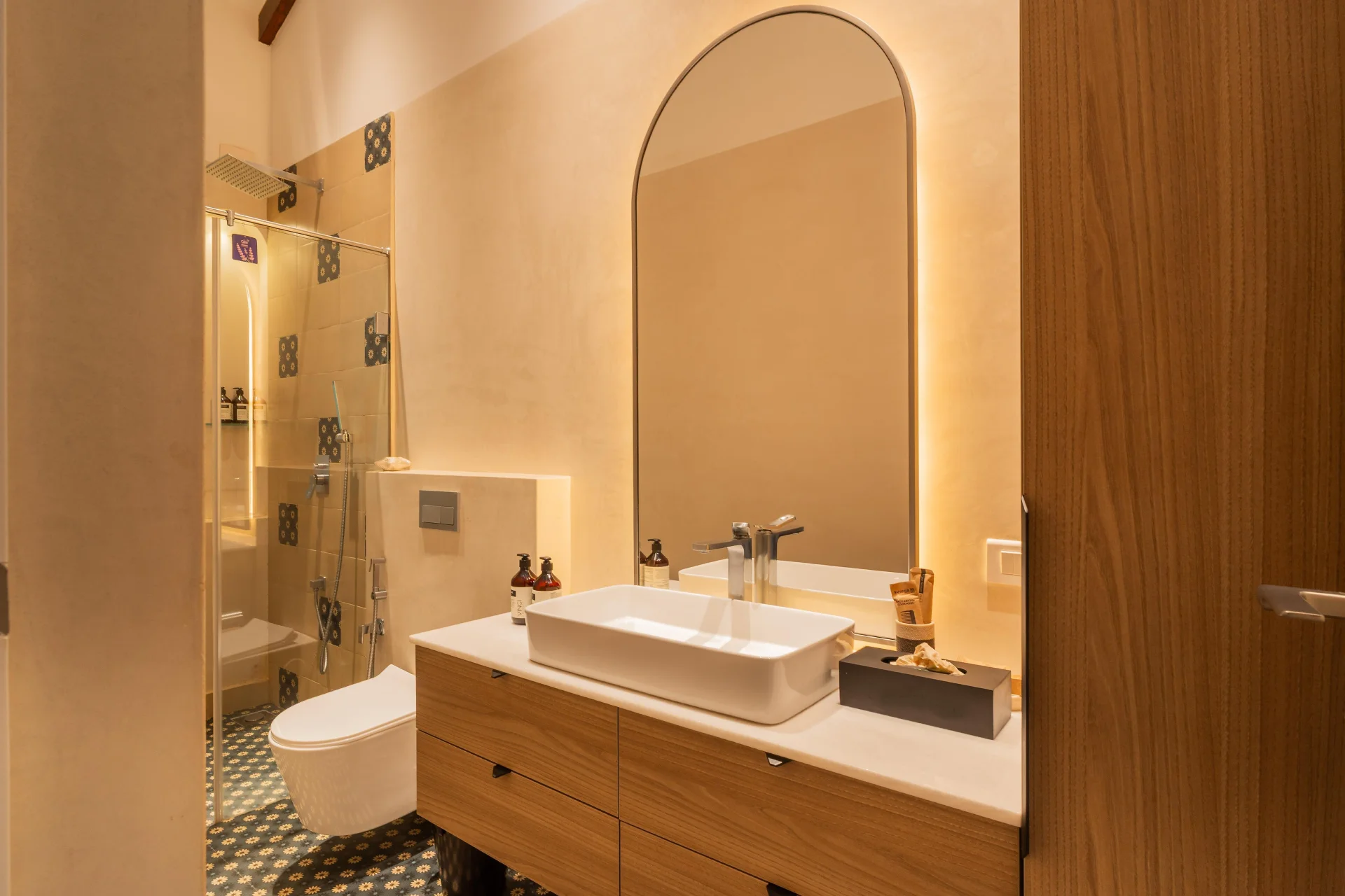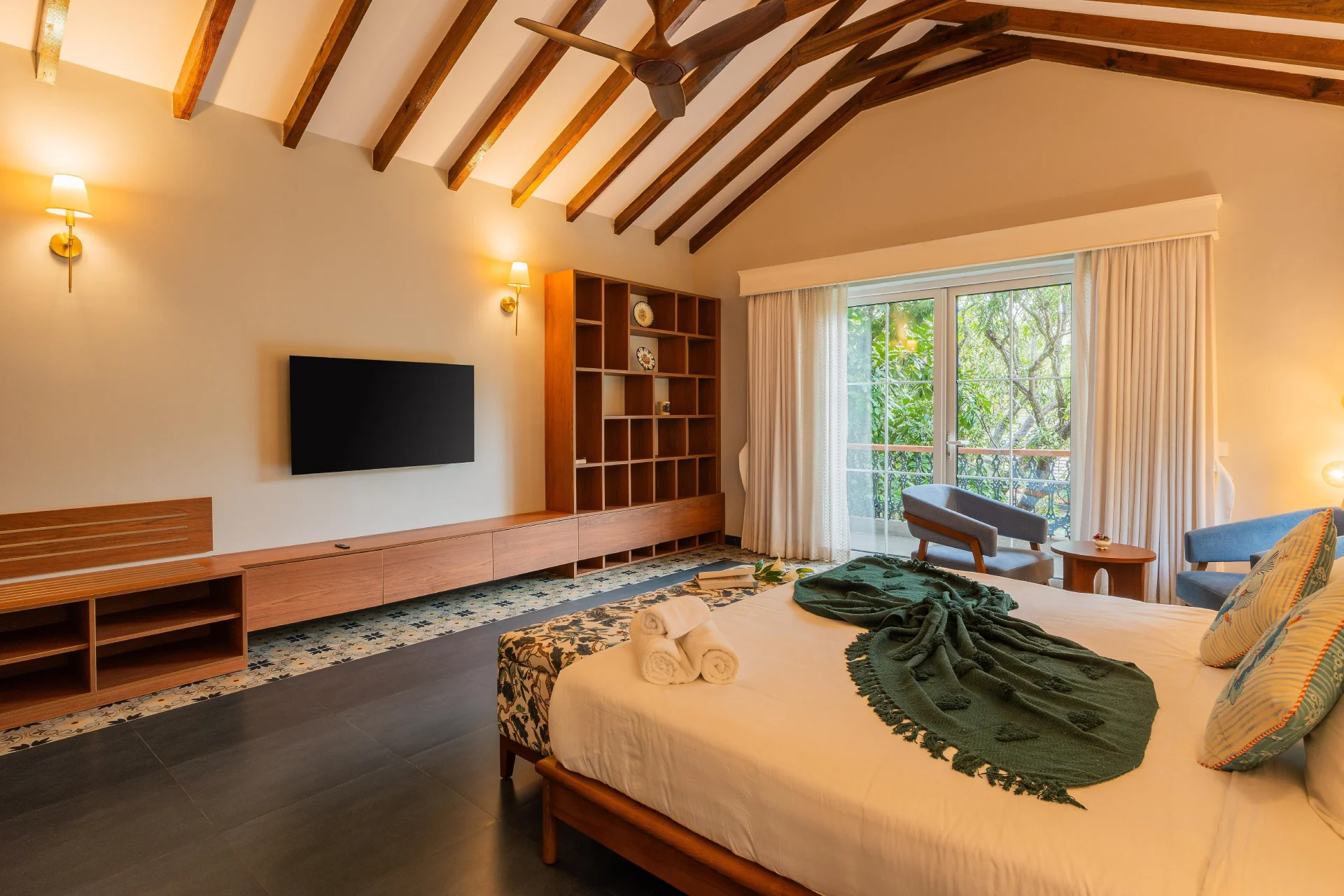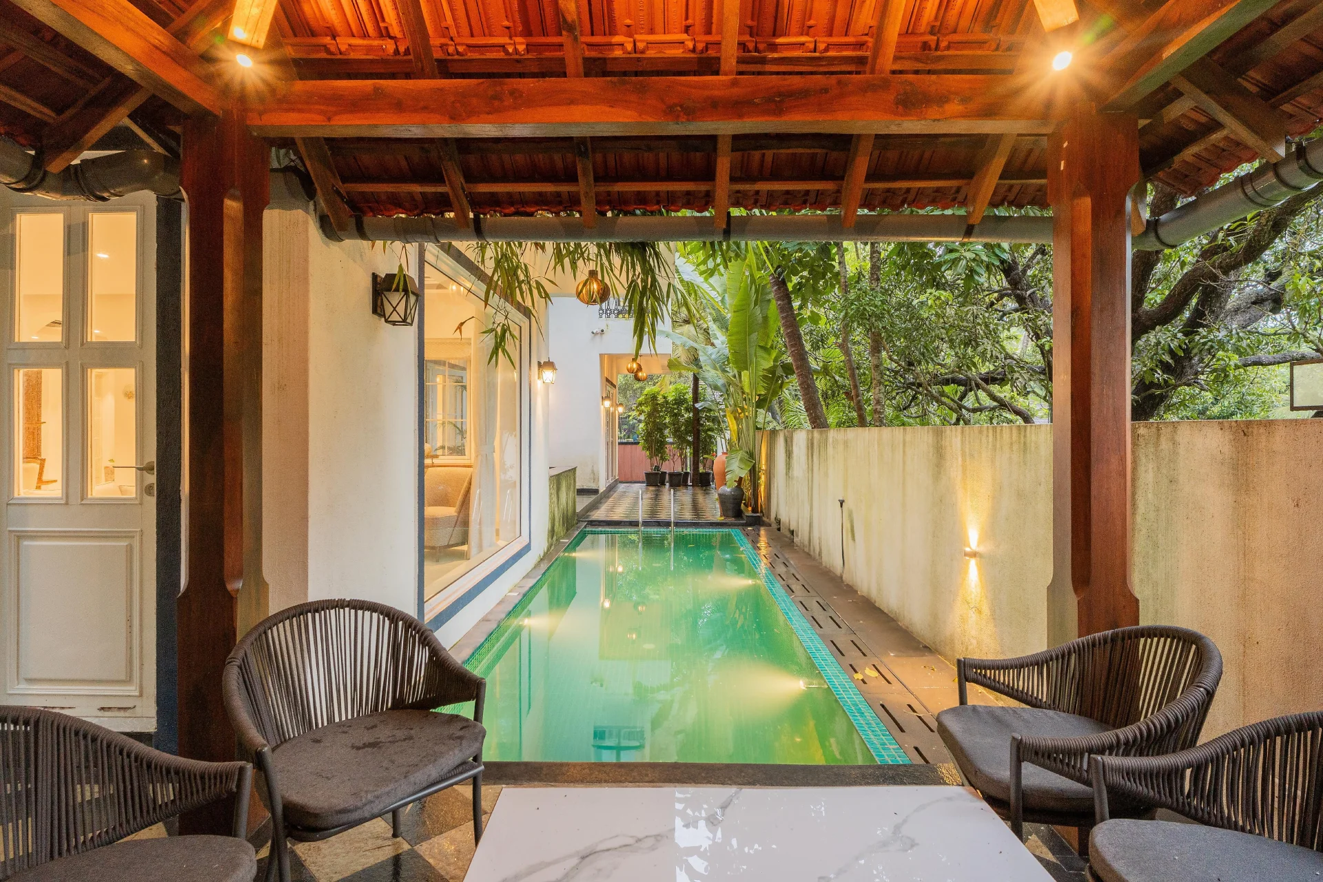 Picture wooden beds, plush white linens, floral throw pillows, cozy armchairs, wardrobes, and ample sunlight and greenery. The bathrooms are stylish, featuring ceramic basins, vanity storage, soft lighting, hairdryers, and organic toiletries. One of the most captivating aspects is the private swimming pool, beautifully enhanced by a shaded gazebo. Enveloped by lush greenery and warm-toned architecture, this area includes wicker seating and soft pendant lights, making it ideal for sunny afternoons or tranquil evening swims, all just minutes away from the vibrant scene of North Goa.We recently spent a magical few days at luxury Villa in Udaipur booked through Villas On Demand and the entire experience was so amazing. Every detail of our stay was Carefully planned, making this trip an unforgettable one for all of us.