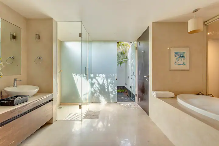 Everything can be ticked off at this amazing Balinese styled 3 bedroom home that is designed in a manner where the living space is separate from the bedroom area ensuring no disturbance to late risers or early sleepers. It has 2 open to sky showers attached to the baths and one bathtub as well to indulge. The space Its like a private forest of your own with a water lagoon Guest access all areas. The villa boasts top-notch facilities including a private swimming pool, shared kitchen, living room, pool/beach towels, and a caretaker.