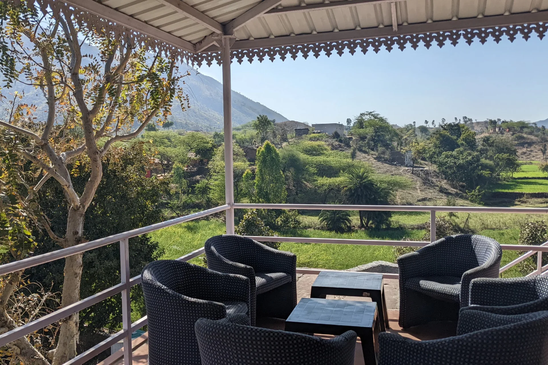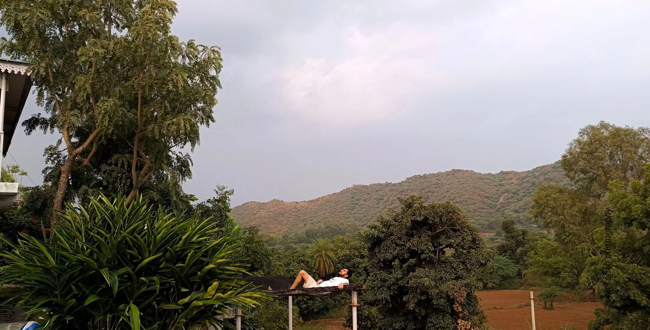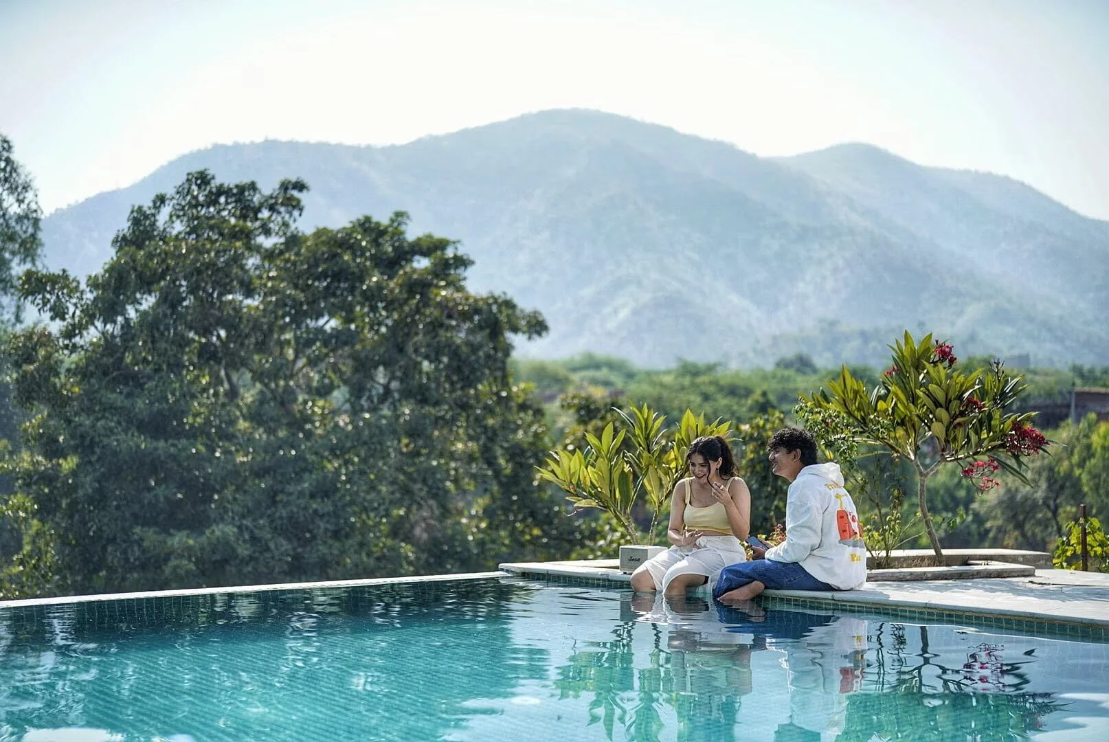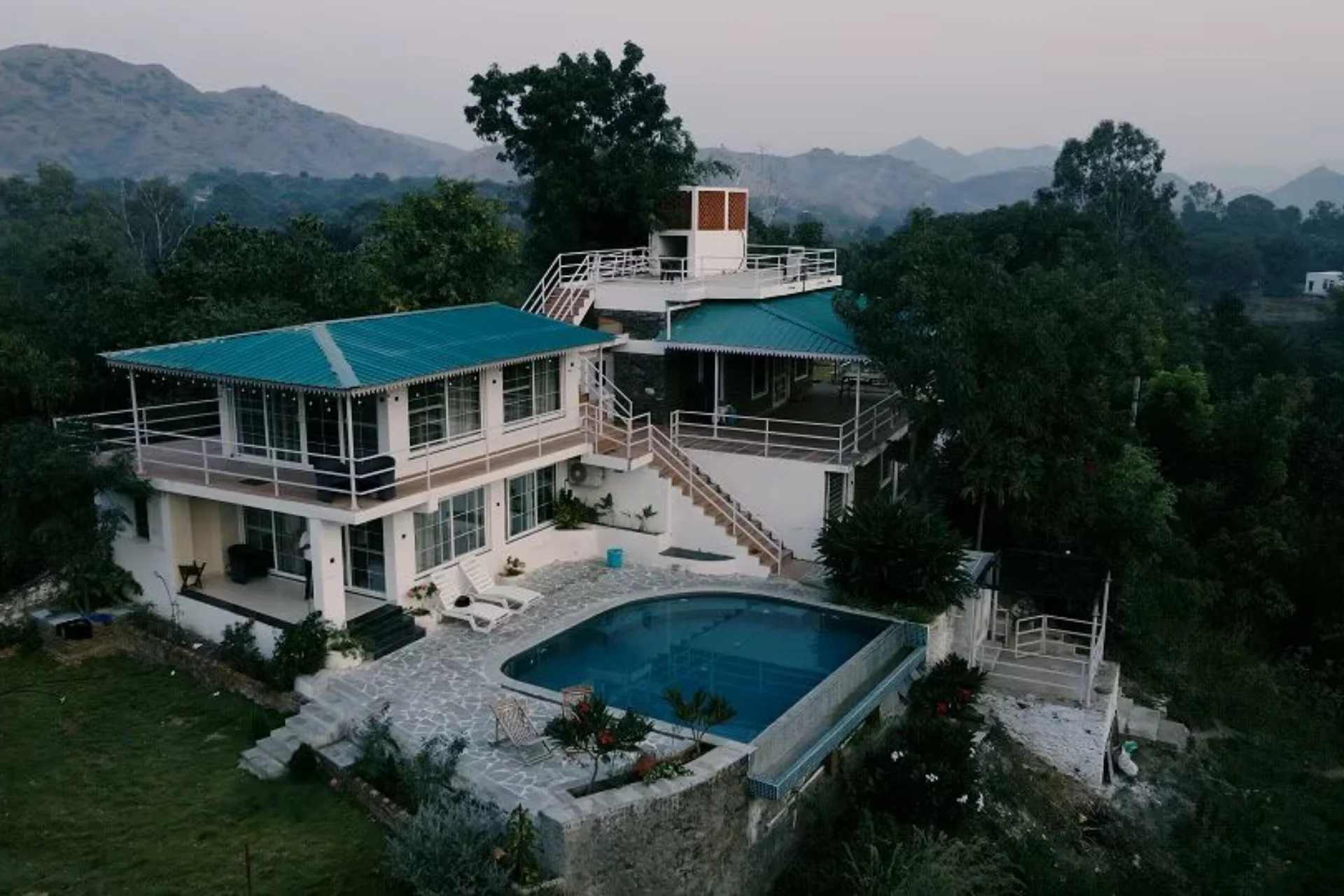 3 BHK Infinity Pool Villa In Udaipur VODRJ212 is a peaceful retreat situated on a hill within an expansive farm covering more than 2 lakh square feet in Udaipur. Surrounded by a river to the north, verdant mountains to the east, and thick forests to the west, this sanctuary provides a serene atmosphere.