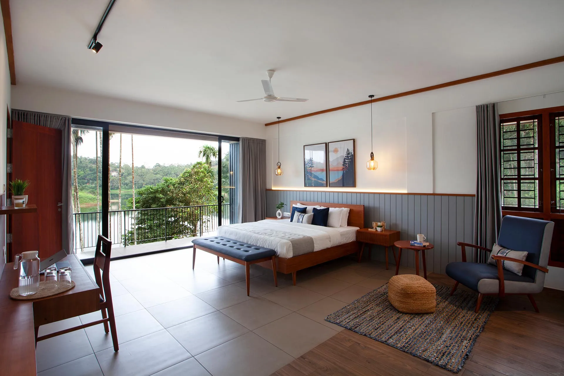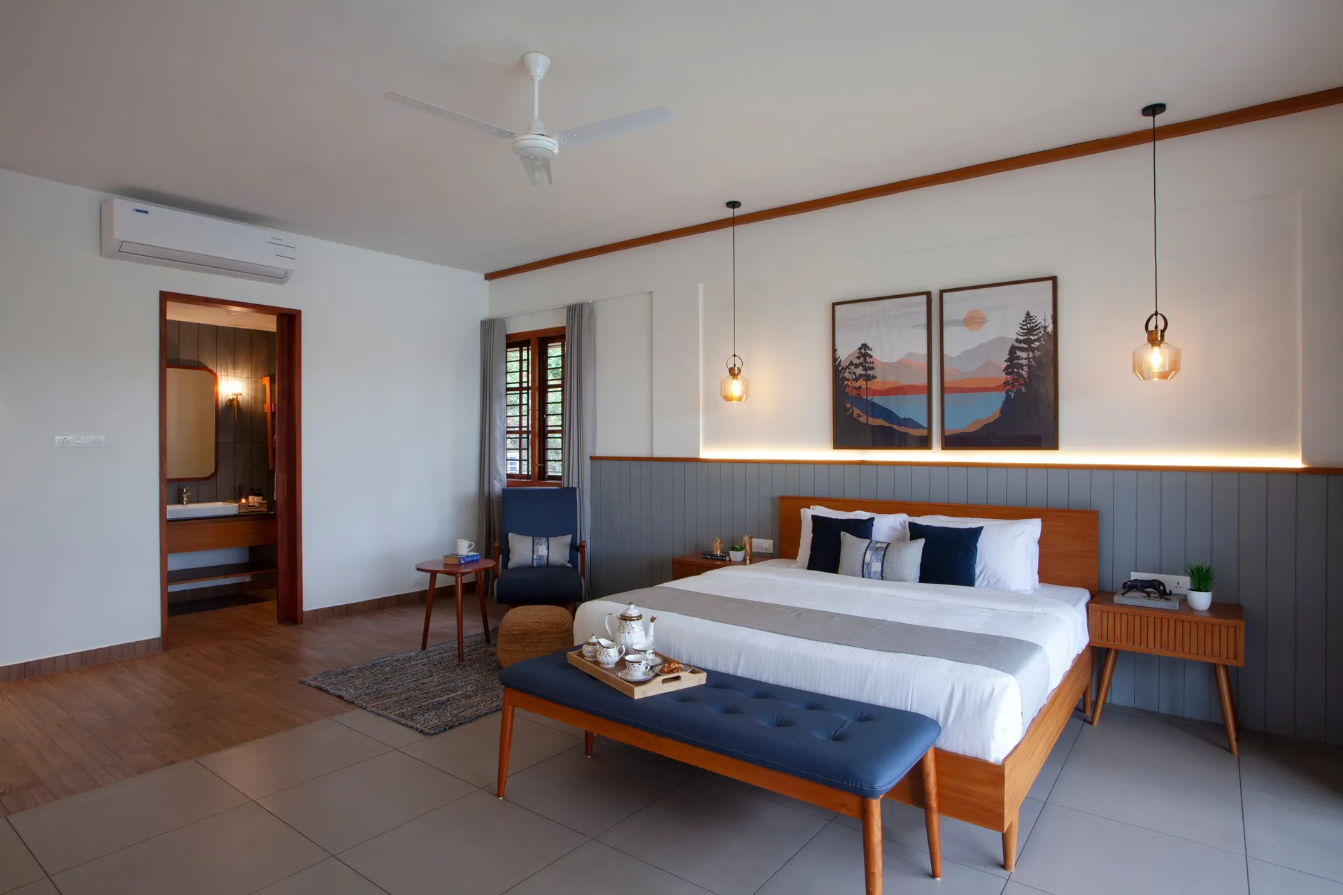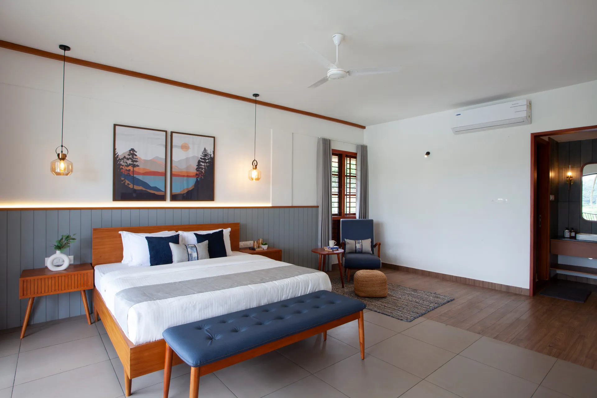 VODSI47 Villa, 3 BHK Lake View Villa In Wayanad nestled in the heart of Wayanad’s picturesque hills, embodies luxury, tranquility, and nature. Surrounded by serene landscapes and lush greenery, this architecturally remarkable retreat offers a charming blend of cozy wooden interiors, numerous outdoor activities, and breathtaking design.