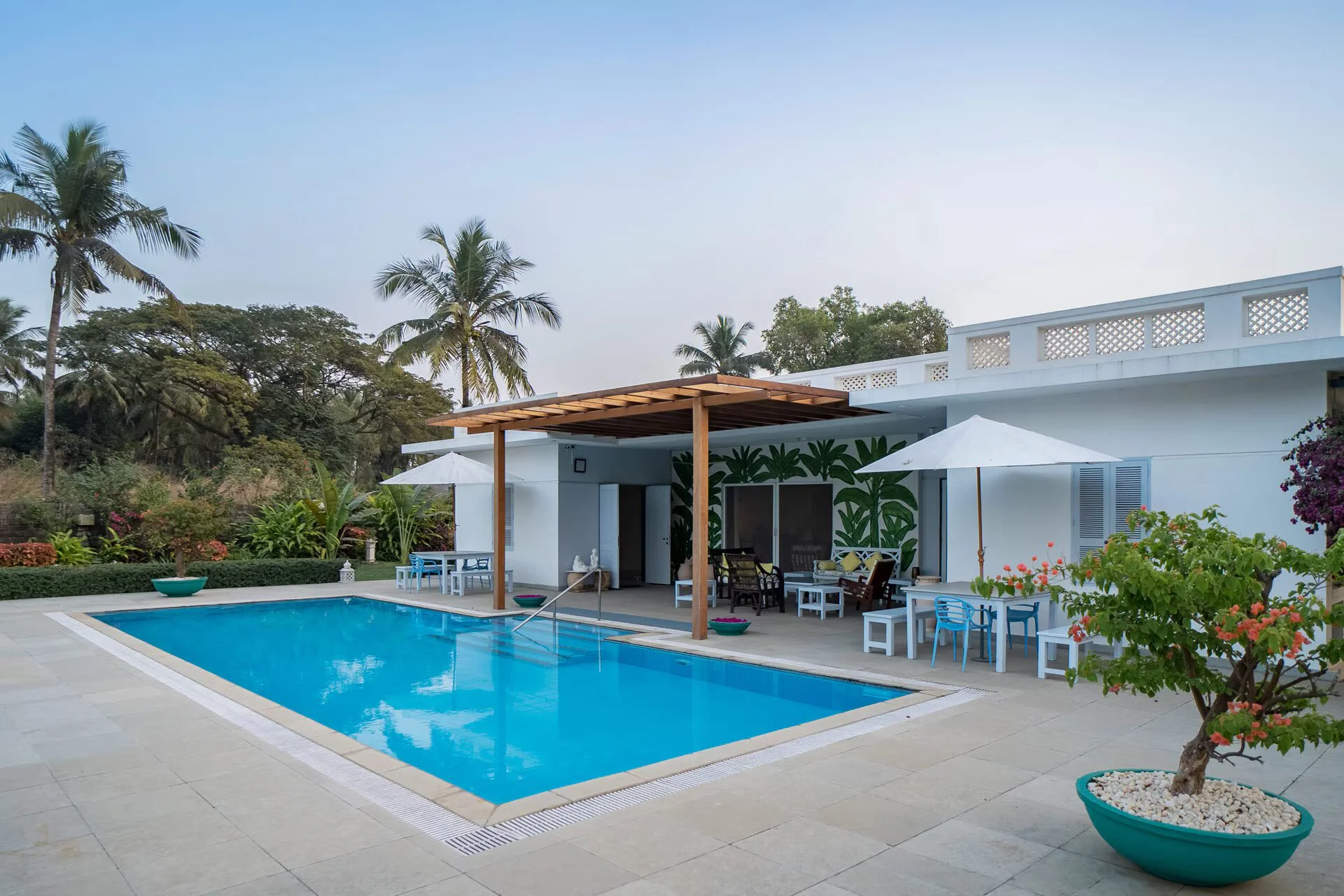 3 BHK Pool View Villa Nestled far from the hustle and bustle of urban life, VODMH162 Villa is an expansive holiday residence surrounded by towering palm trees and lush greenery, making it an excellent choice for your next weekend retreat, capable of hosting up to 9 individuals, including infants.