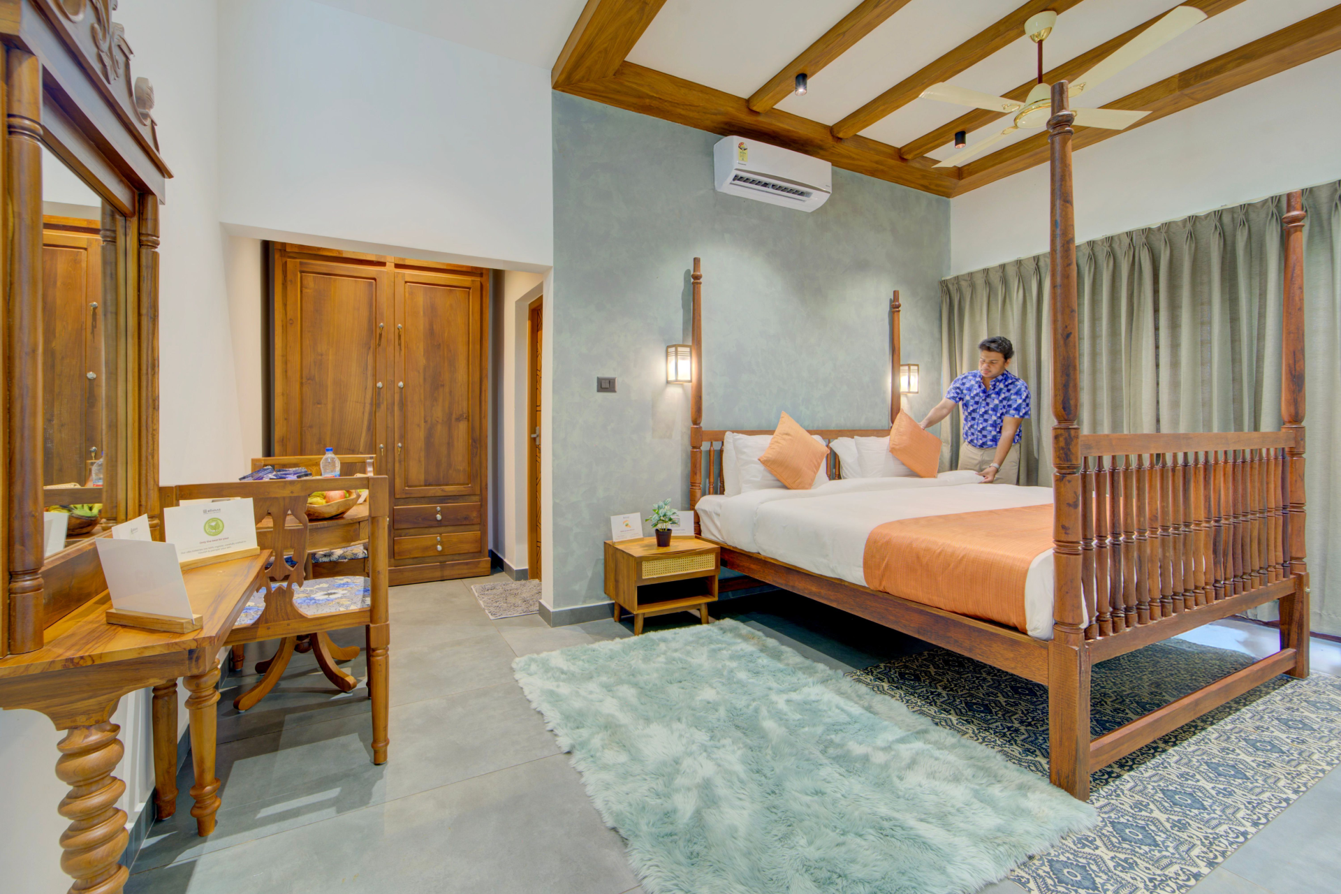 VODSI24 Resort in Champakulam features a spacious villa comprising three bedrooms and three bathrooms. The living room offers generous space for relaxation. Guests benefit from complimentary WiFi, air conditioning, and a television. The property boasts a verandah and an outdoor patio, ideal for engaging in outdoor activities. Complimentary on-site private parking is provided for guests. Inside, the 3BHK retreat harmoniously combines authentic rustic charm with the clean, soothing lines of modern comfort, resulting in an environment that feels both grounded and profoundly restful. Each master bedroom opens to expansive fields where dawn casts soft, golden light across the horizon.