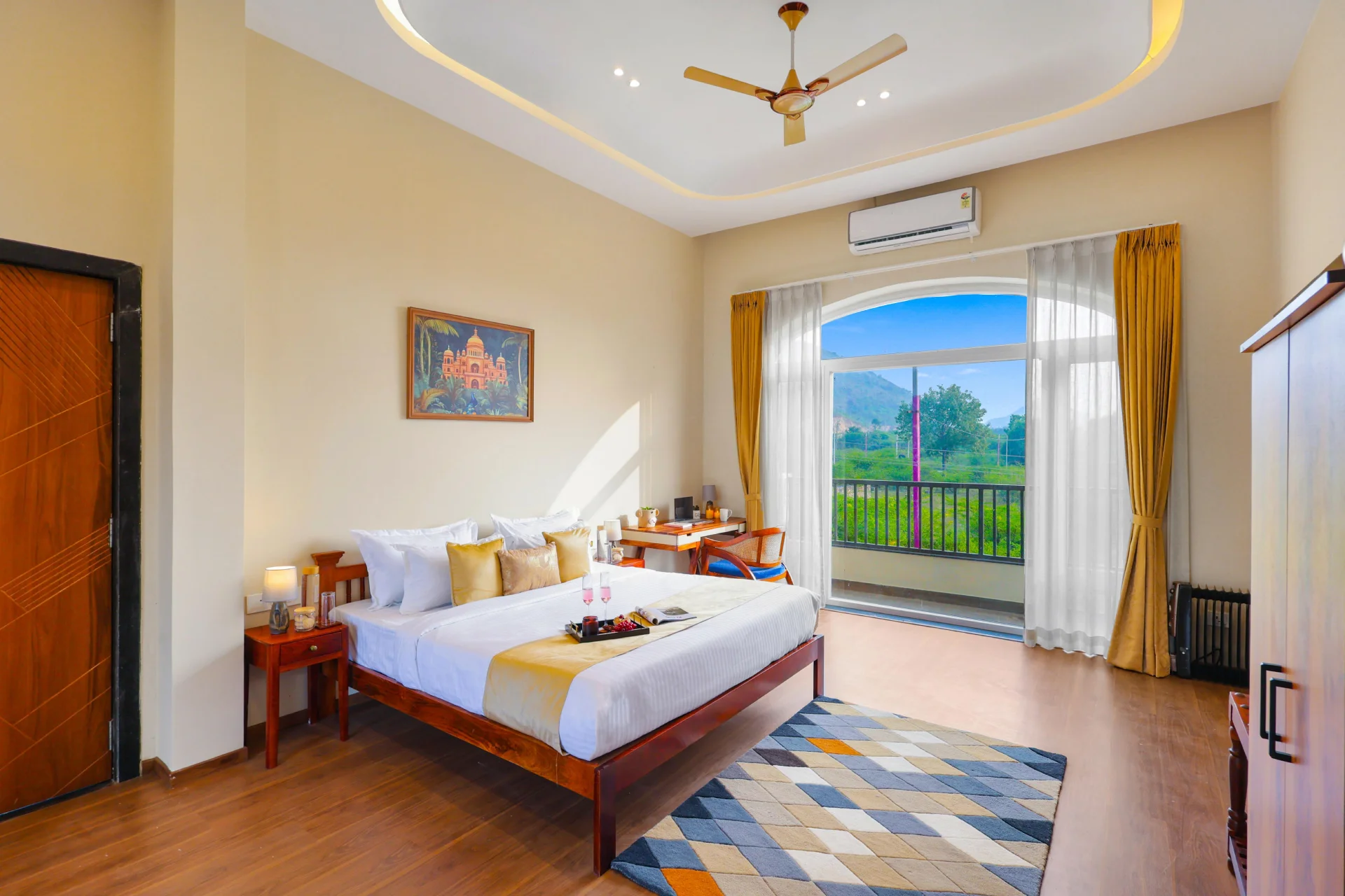 The villa boasts three meticulously designed bedrooms. Bedroom 1, located on the first floor, features a king-sized bed, a layout of 250 sq. ft., a workstation, wooden flooring, ambient lighting, a mini-fridge, and a large arched window that allows ample natural light to enter. It includes an attached balcony and a spacious ensuite bathroom equipped with a jacuzzi, shower, and organic toiletries. Bedrooms 2 and 3, situated on the ground floor, maintain the same serene aesthetic, each measuring 168 sq. ft., and furnished with king-sized beds, arched or full-height windows, recessed lighting, TV units, indoor plants, and tranquil views of the hills.