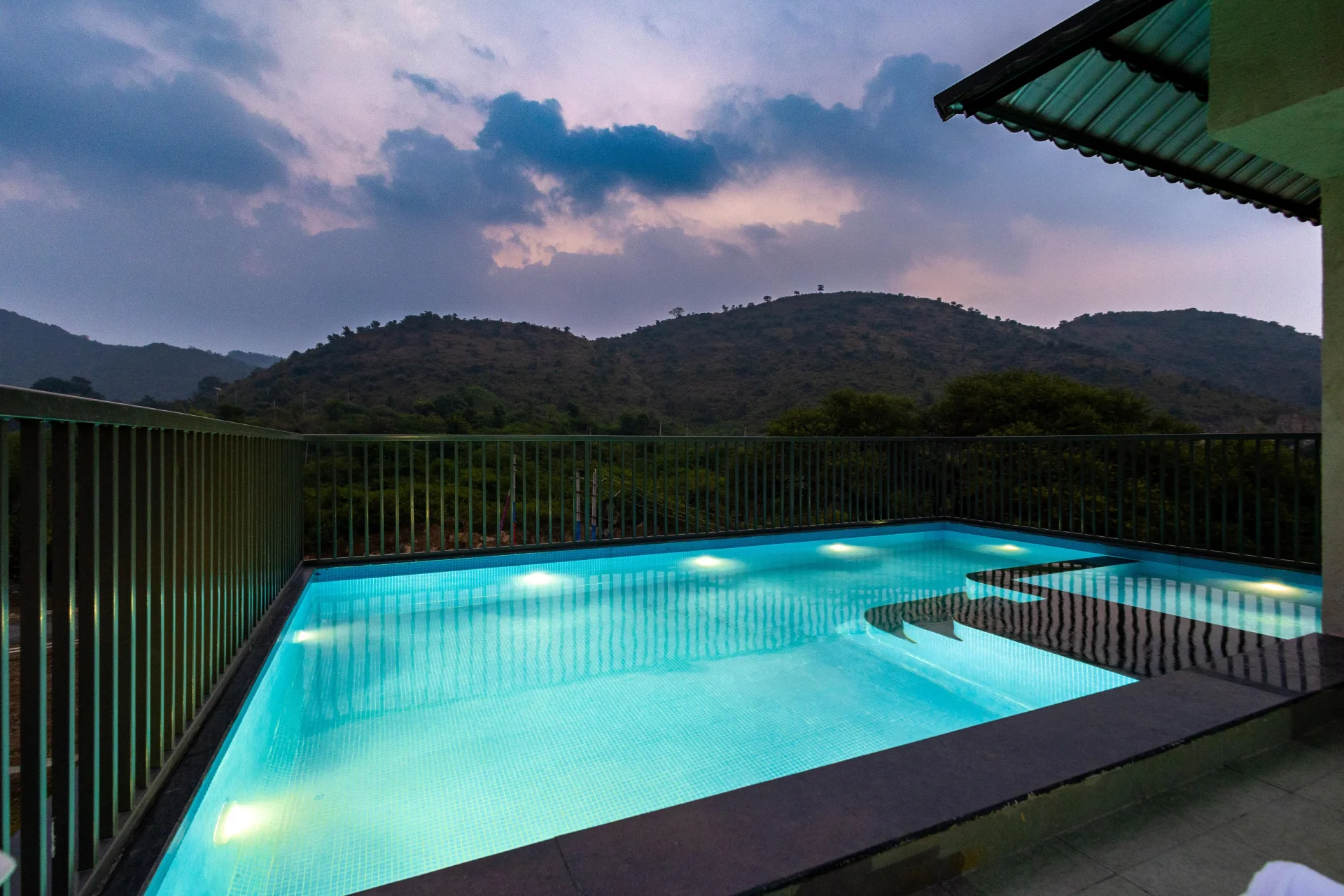 3 BHK Rooftop Pool Villa In Udaipur Situated in the core of nature, this exquisite villa featuring a European design harmoniously combines classic aesthetics with contemporary warmth. Positioned against a tranquil valley setting, it reveals bright interiors, arched windows, gentle neutral shades, and unobstructed vistas of the lake, hills, and lush surroundings.