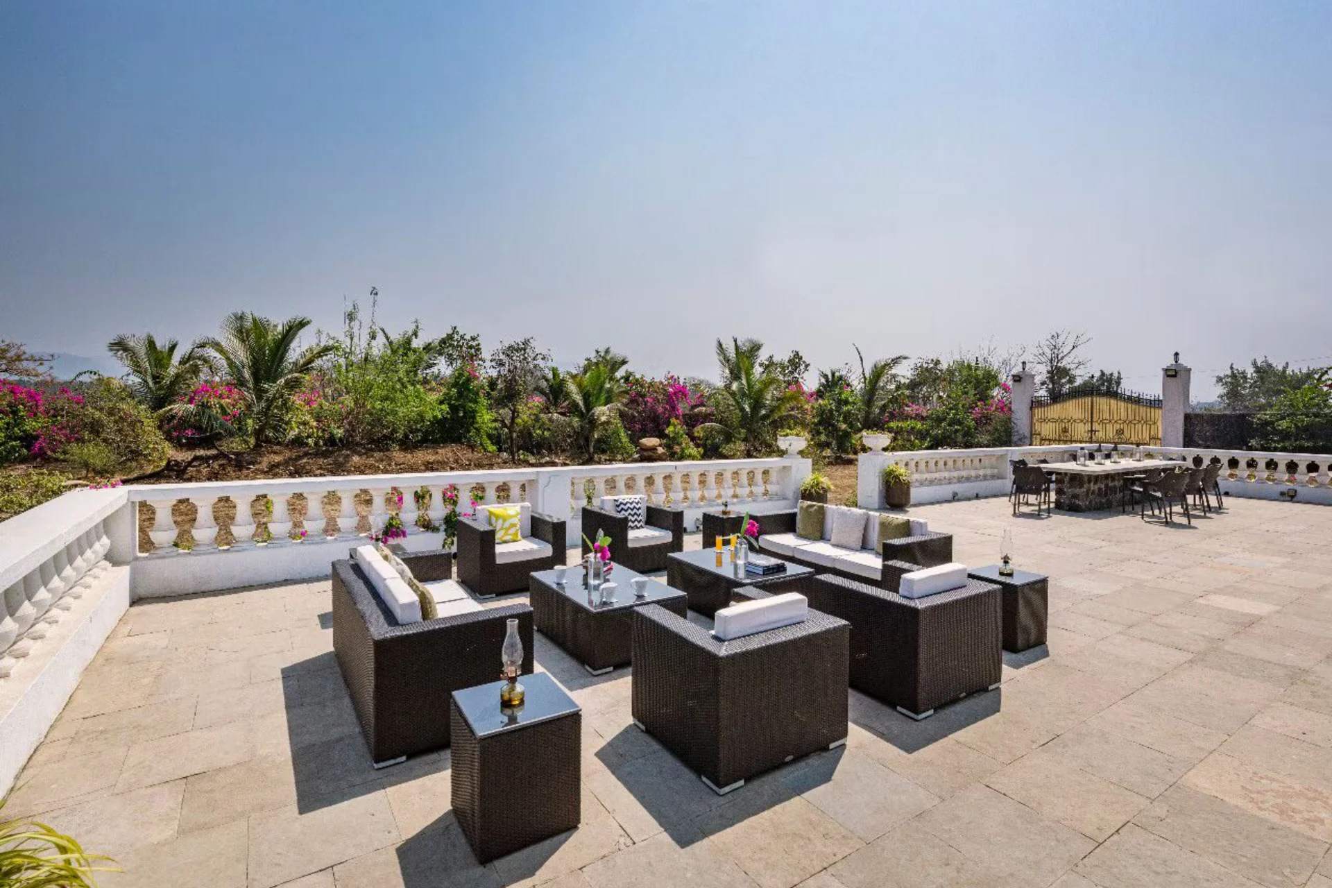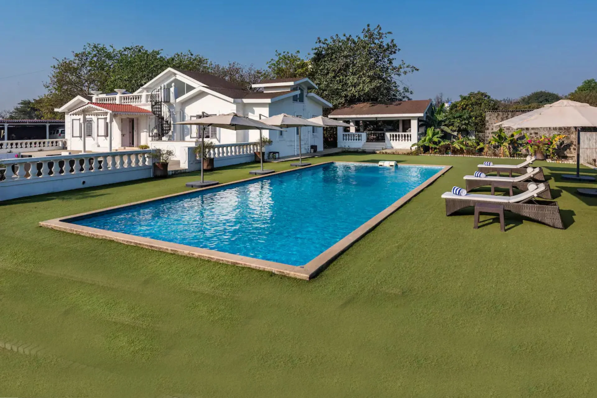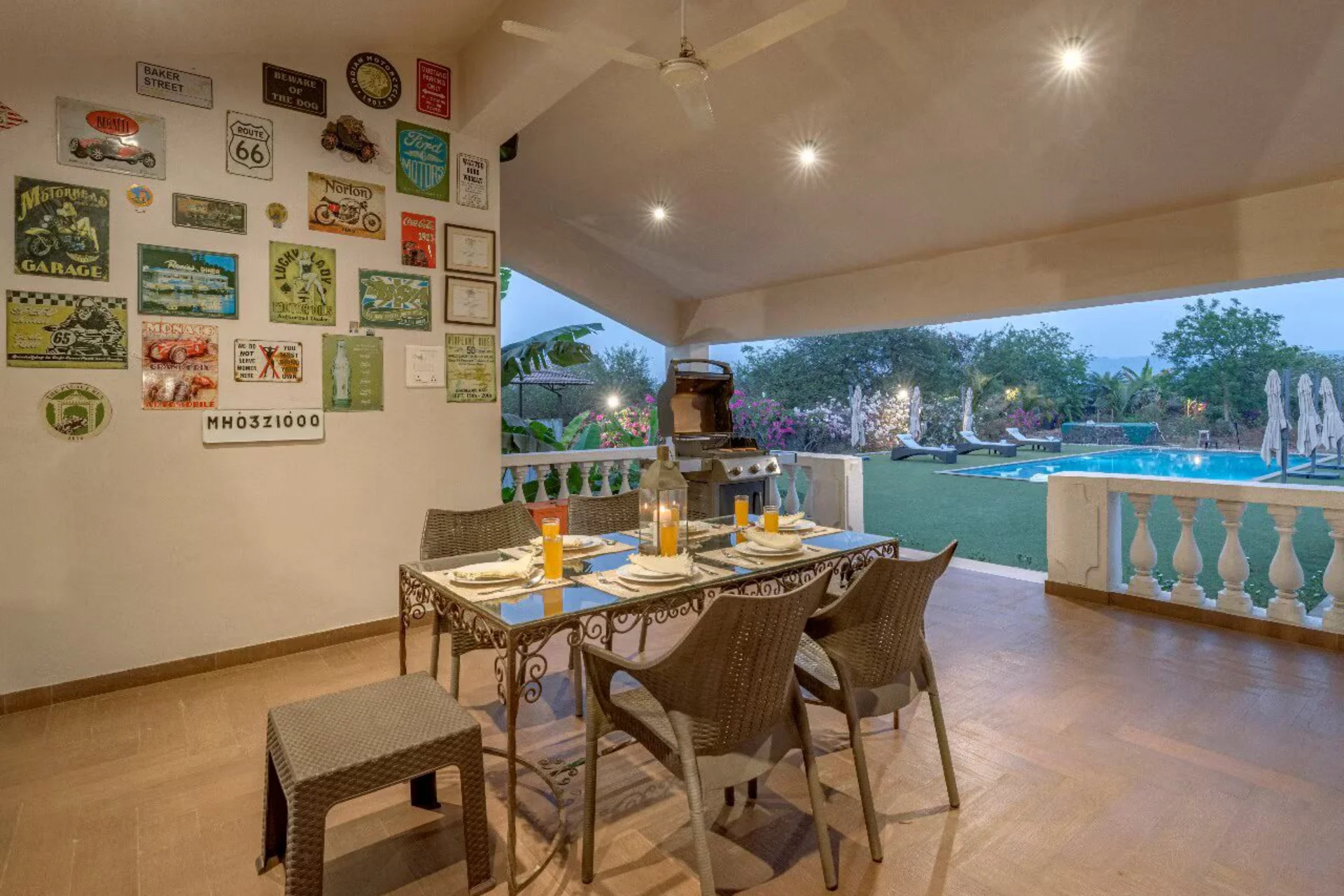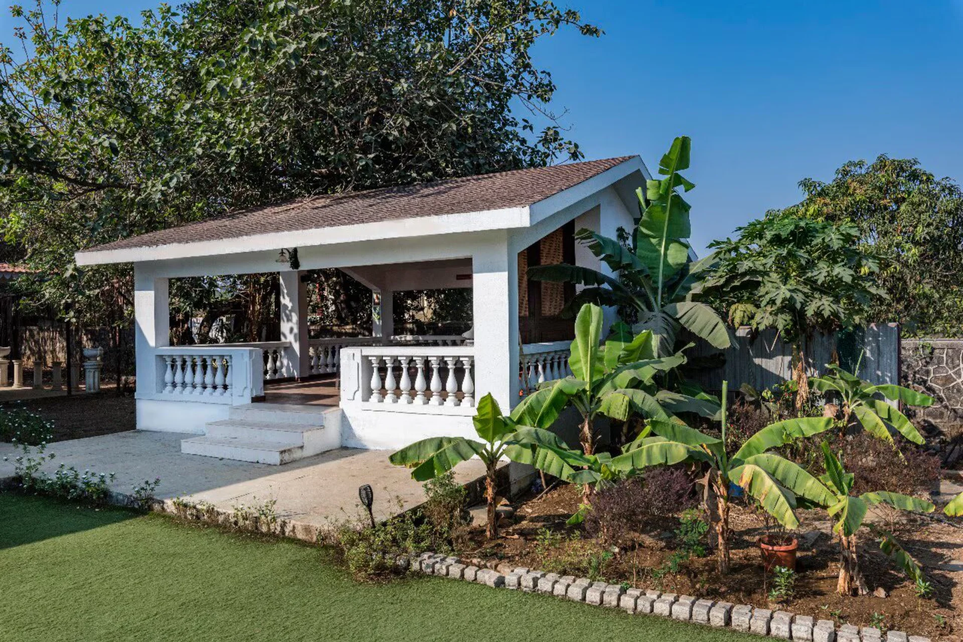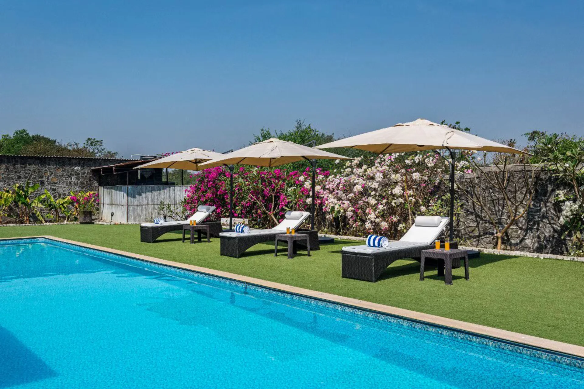 3 BHK Villa With Pool A classic villa nestled amidst the lush greenery of Alibaug, where the fragrance of blooming flowers greets you. Outdoor seating, a patio featuring a bar, a sparkling pool, BBQ evenings, cycling, and trekking opportunities, conveniently located near Awas Beach.