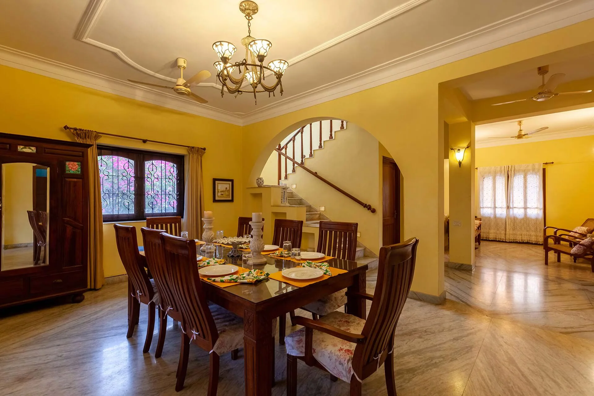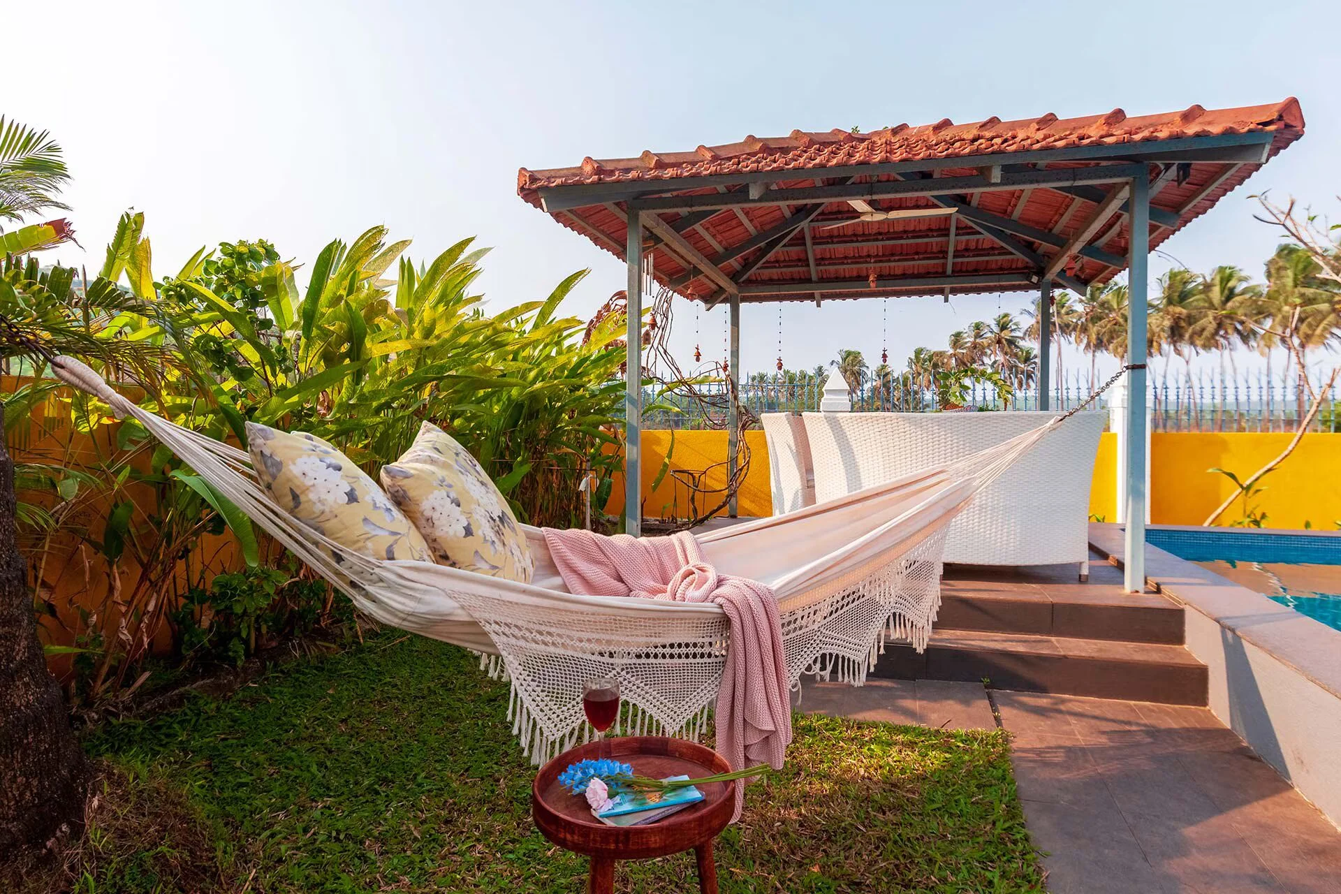 Nestled within the historic streets of Goa, surrounded by verdant lawns, is VODGA85 Villa. This villa reflects the sunlight through its beautifully painted yellow and blue walls, while the charming wooden and cane furniture beckons you to relax to your heart’s content. The villa offers a variety of engaging games and activities, including Jenga, Mahjong, and carrom. Goa is a haven for water enthusiasts, and the private pool guarantees that you can take a refreshing swim, even on a cooler day. VODGA85 Villa serves as a delightful retreat, perfect for your vacation in Goa. VODGA85 Villa accommodations located in Arpora. This property features a private pool, complimentary Wifi, and free private parking.