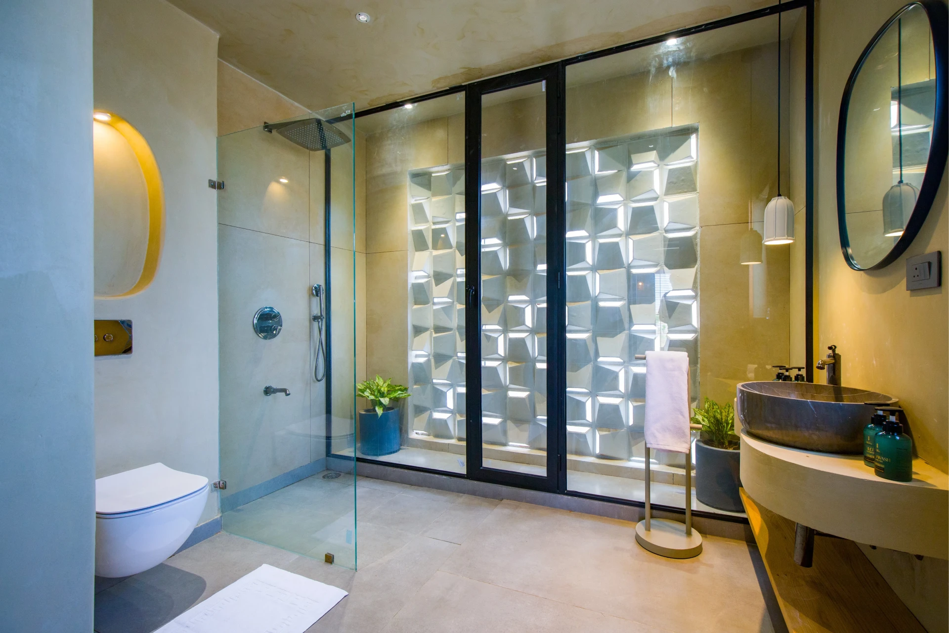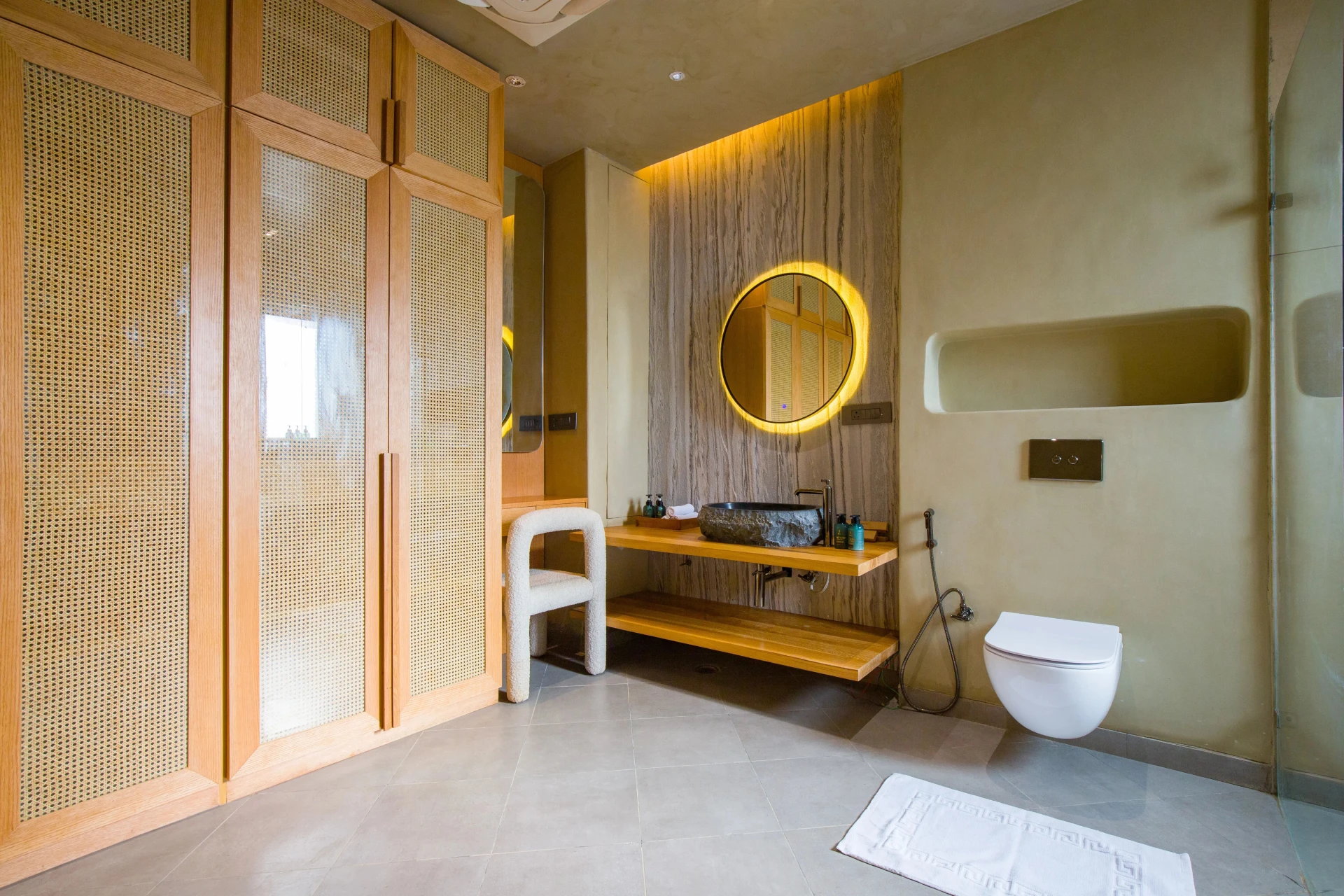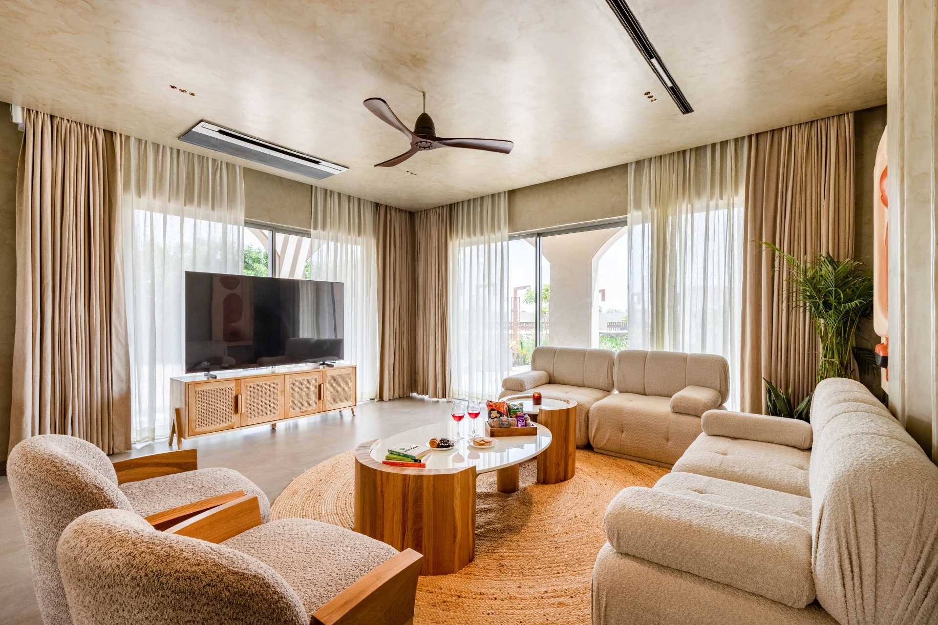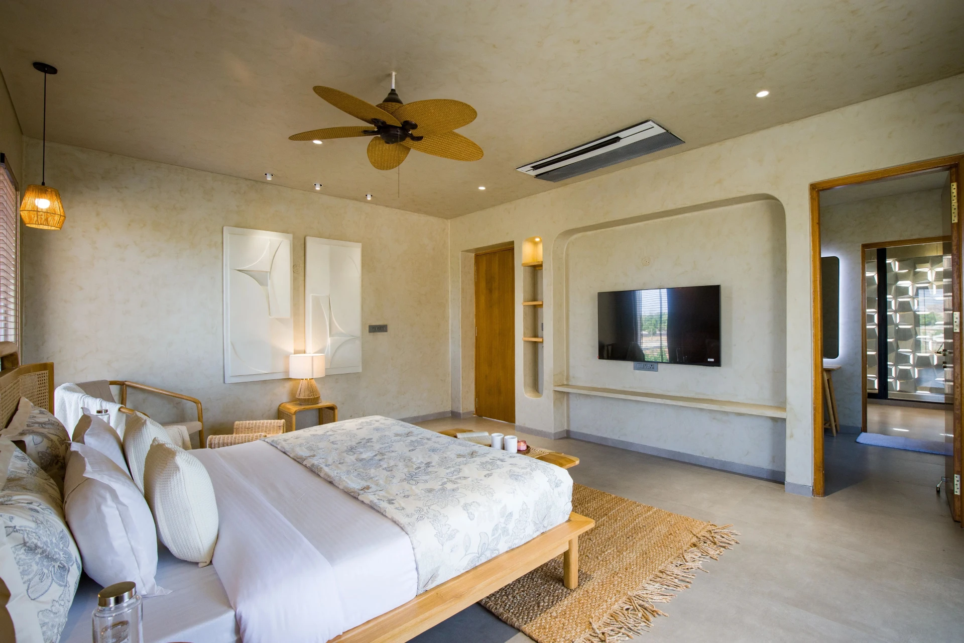Villa VODRJ159 in Jaipur boasts a generous layout comprising three bedrooms and three bathrooms. The property features a living room and a private pool, offering plenty of space for relaxation. Guests benefit from complimentary WiFi, air conditioning, and a fully equipped kitchen. The villa includes a private pool, scenic garden views, and a television, ensuring a comfortable and pleasant stay. Each bedroom combines warmth with understated elegance, highlighted by earthy tones, unique leaf-style fans, central AC, and ensuite bathrooms—one fitted with a bathtub.