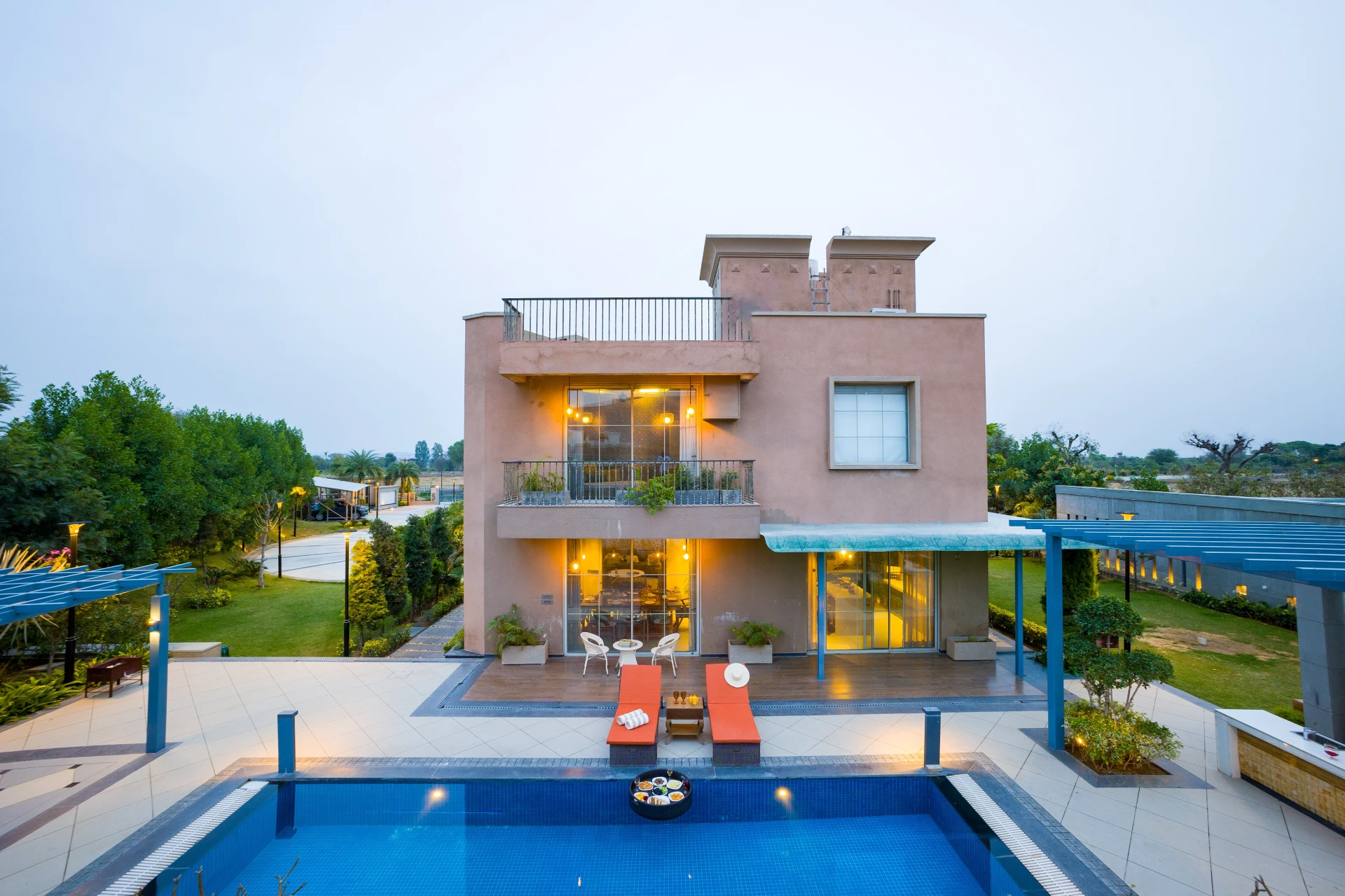 3 BHK Villa With Pvt Pool In Jaipur Nestled within 27,000 square feet of verdant landscape, the villa is encircled by a stunning garden, which includes a charming gazebo that offers a perfect backdrop for enjoying morning coffee or intimate bonfire nights under a star-filled sky.