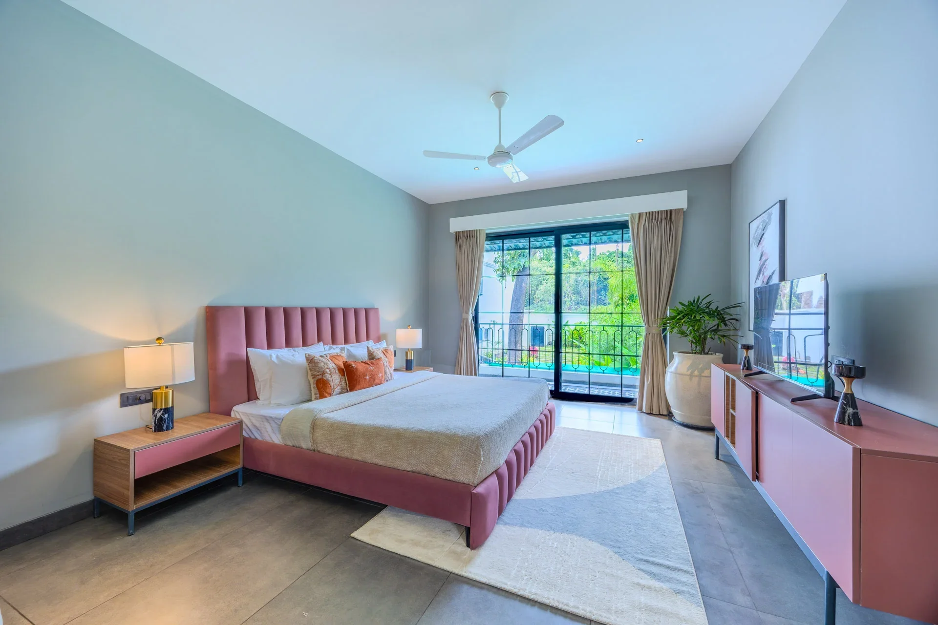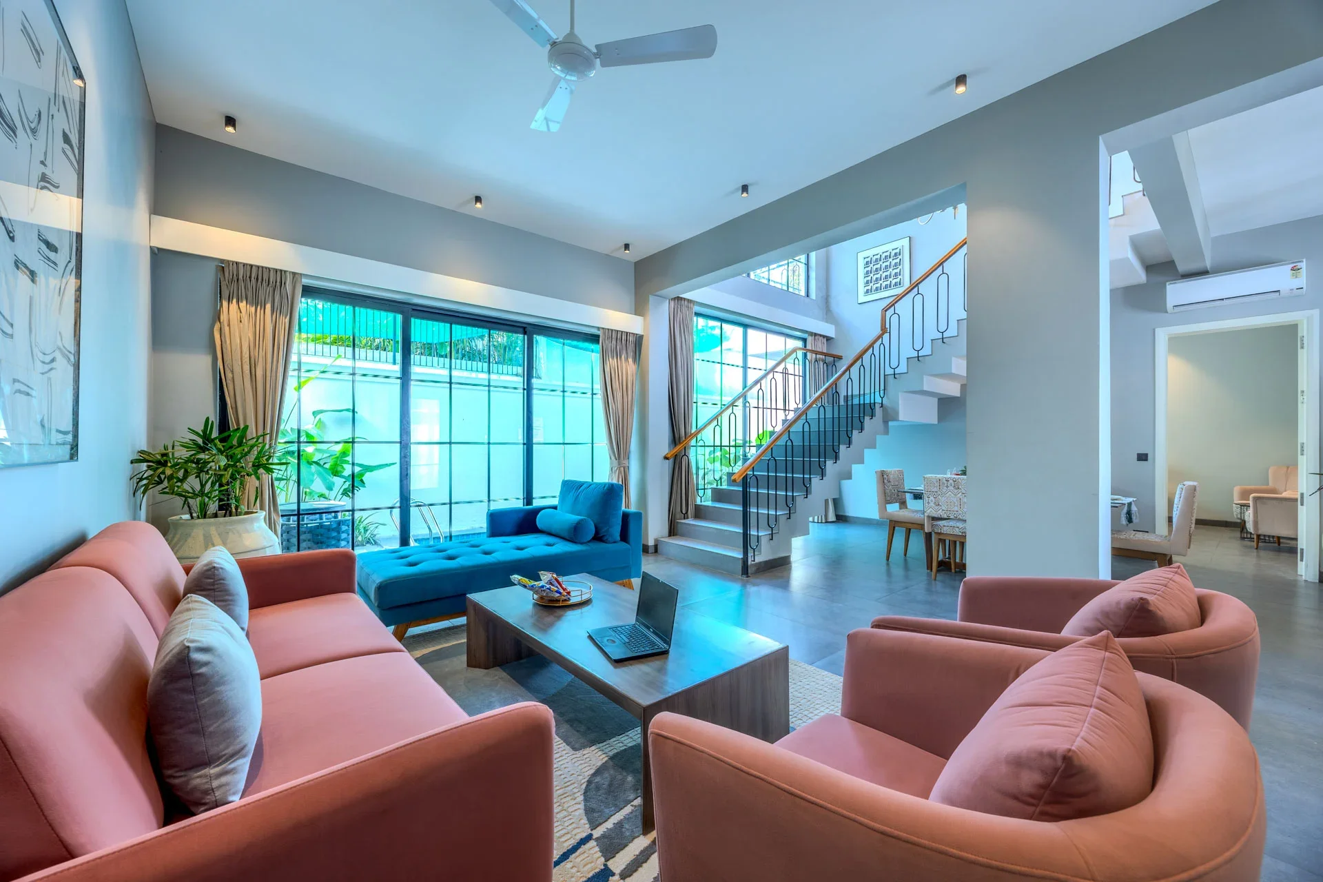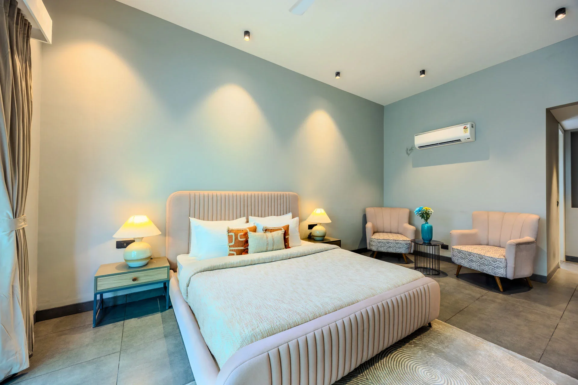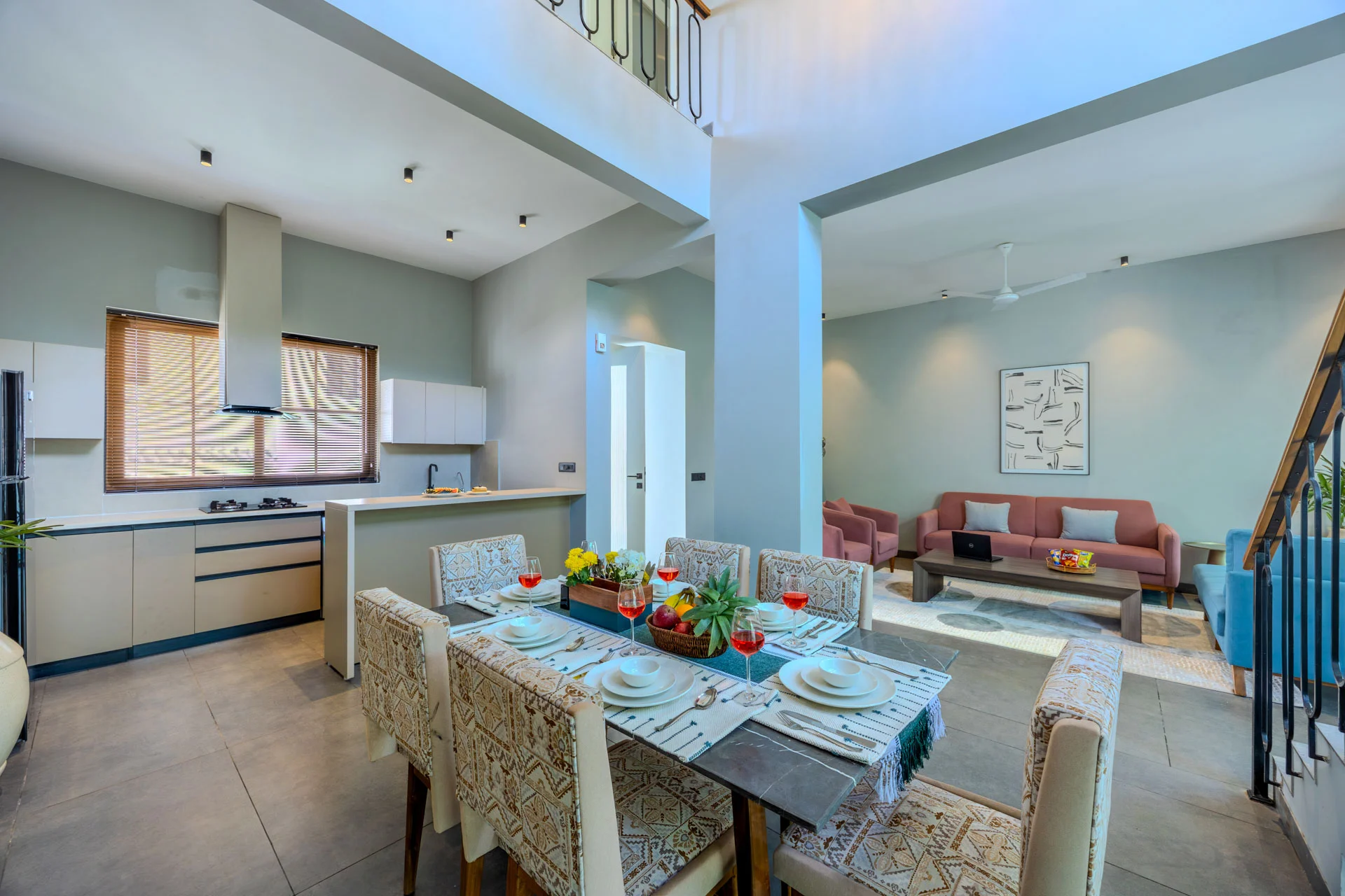 3 Room Pet Friendly Villa In North Goa Upon entering, you are greeted by lofty ceilings, subtle greys, and minimalist dΓ©cor that allow the vibrant surroundings to take center stage. This three-bedroom villa features one room on the ground level and two on the upper floor, crafted for leisurely livingβsunlight streams in through large glass doors, leading to airy balconies with lush views.