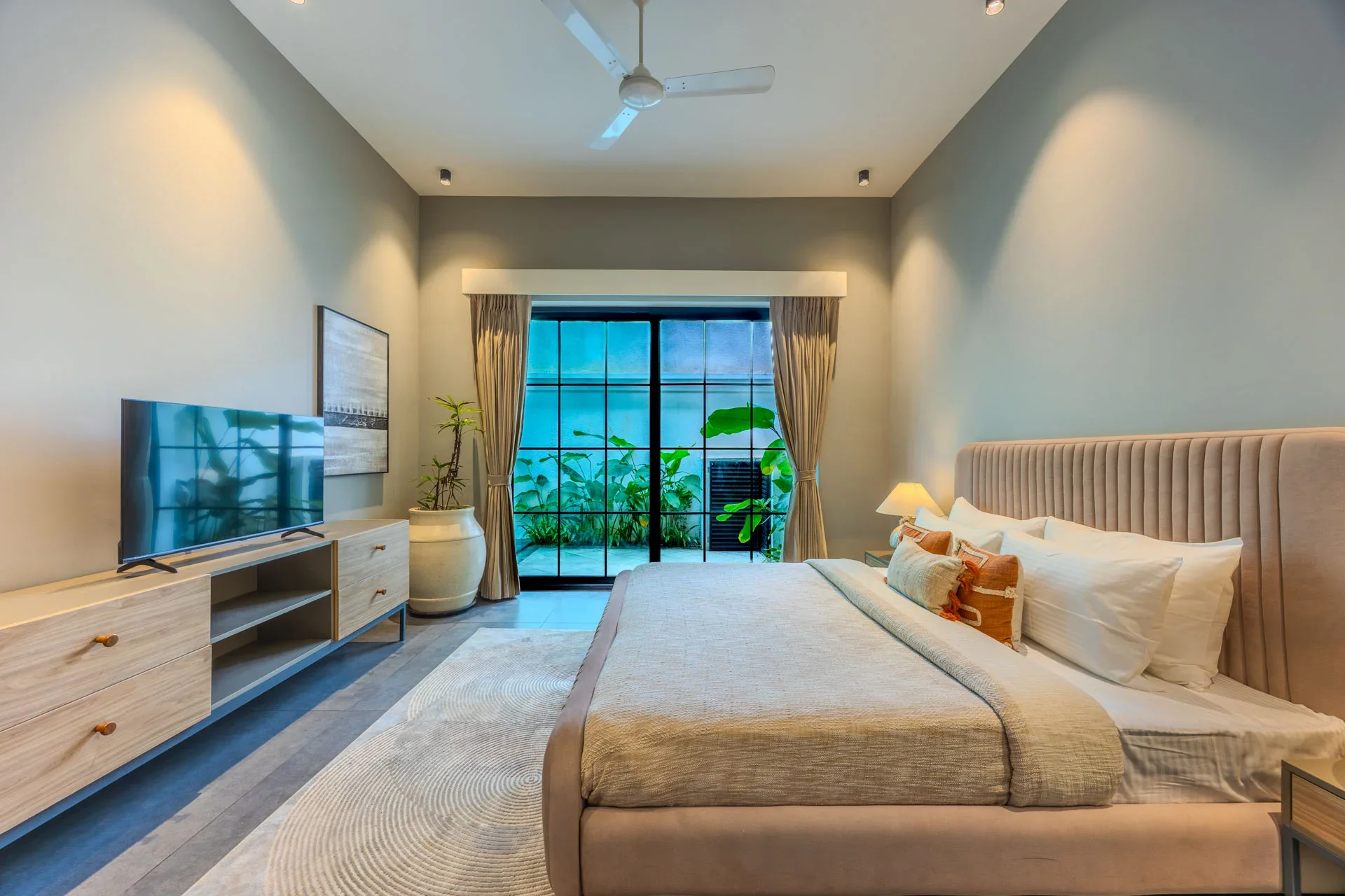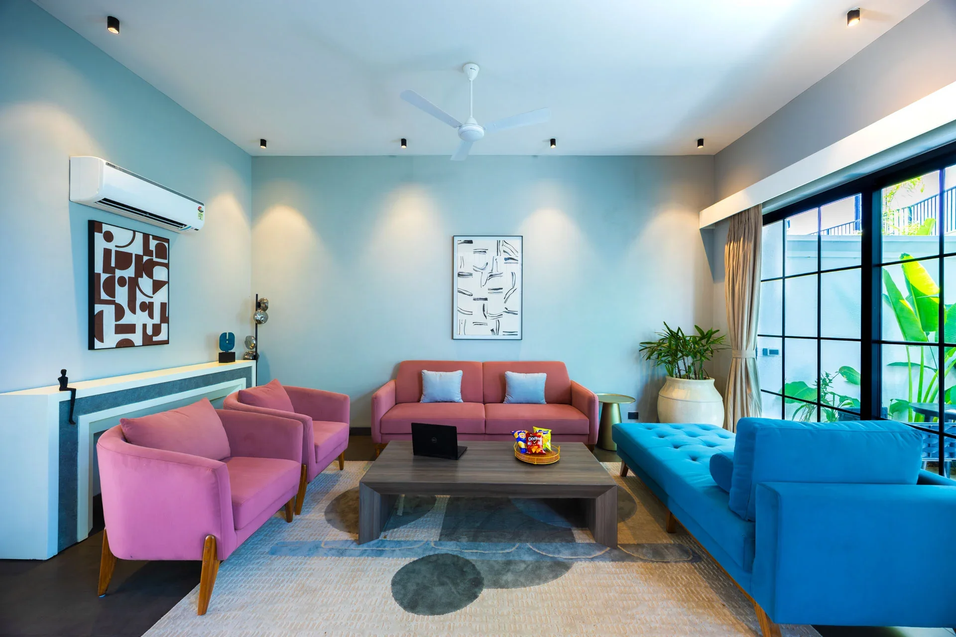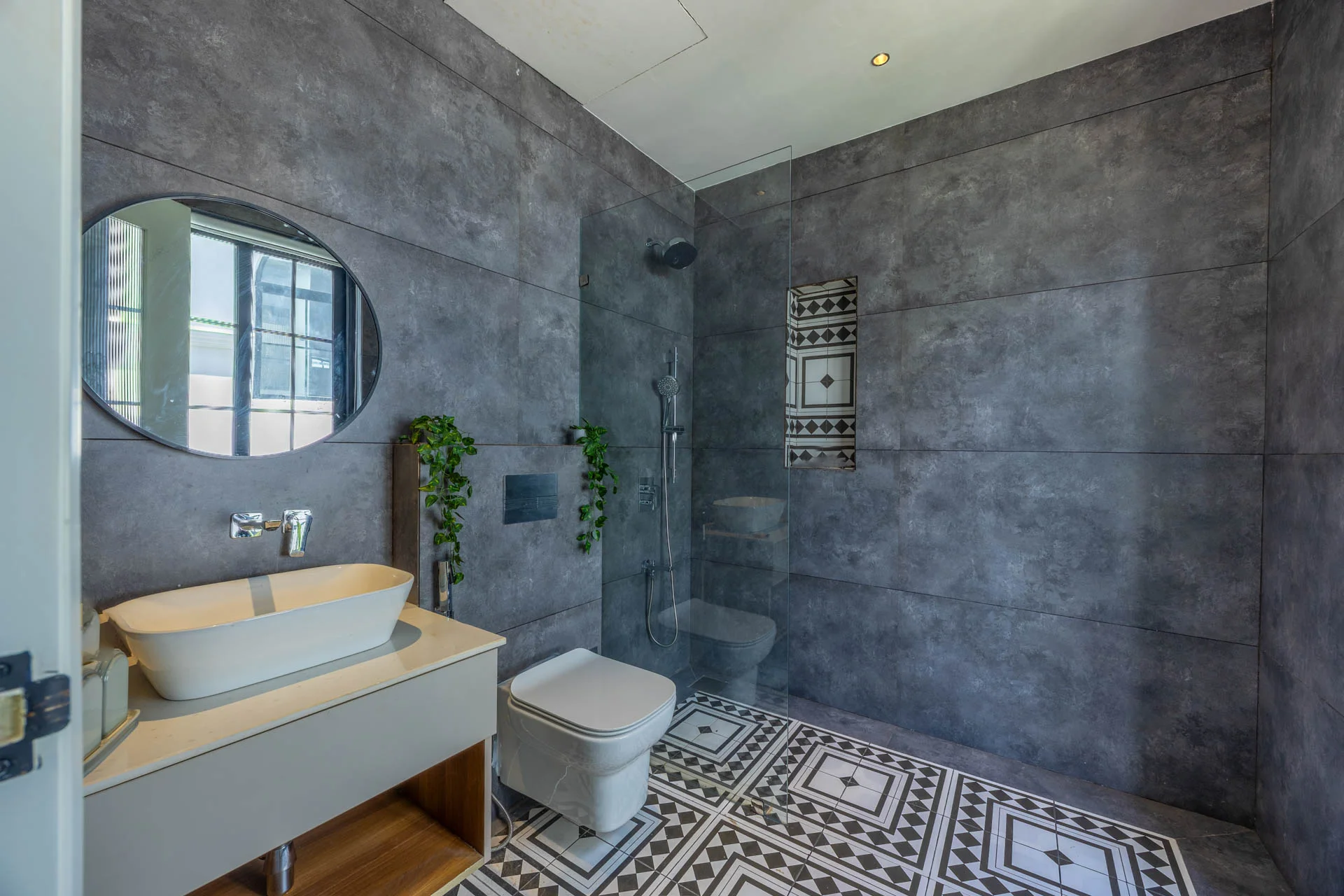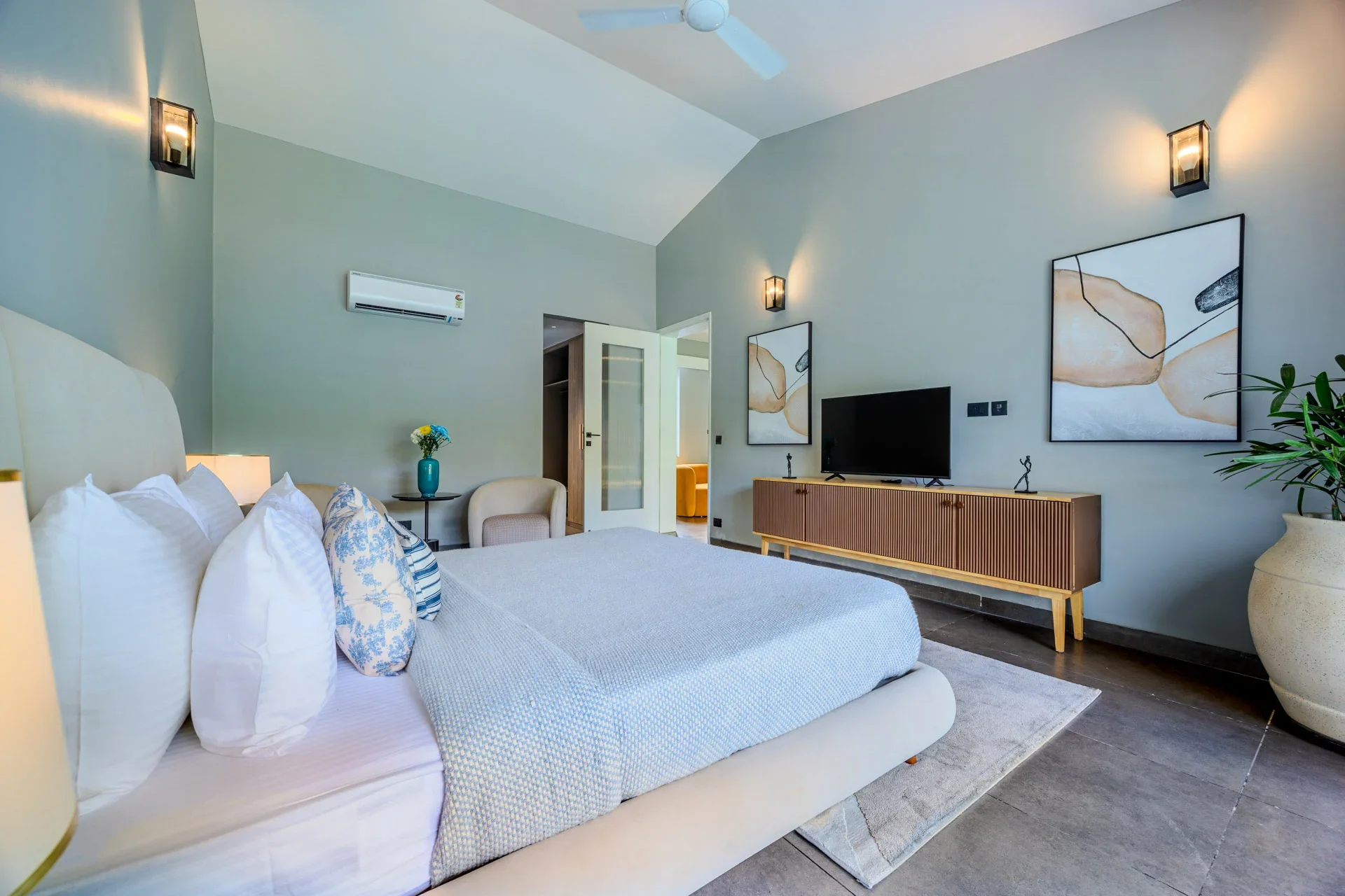 3 Room Pet Friendly Villa In North Goa Upon entering, you are greeted by lofty ceilings, subtle greys, and minimalist dΓ©cor that allow the vibrant surroundings to take center stage. This three-bedroom villa features one room on the ground level and two on the upper floor, crafted for leisurely livingβsunlight streams in through large glass doors, leading to airy balconies with lush views.
