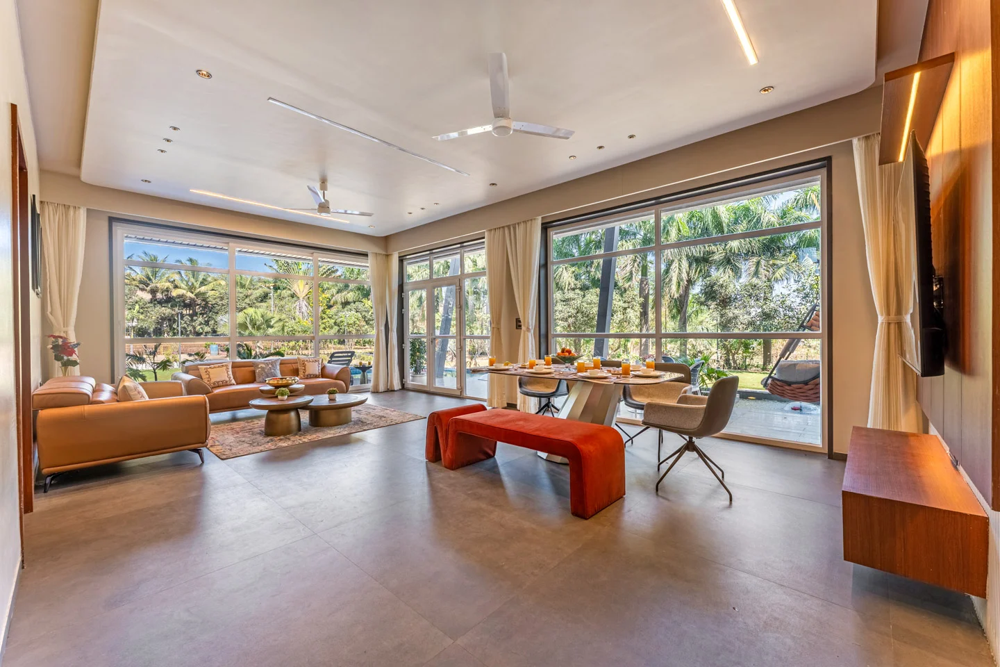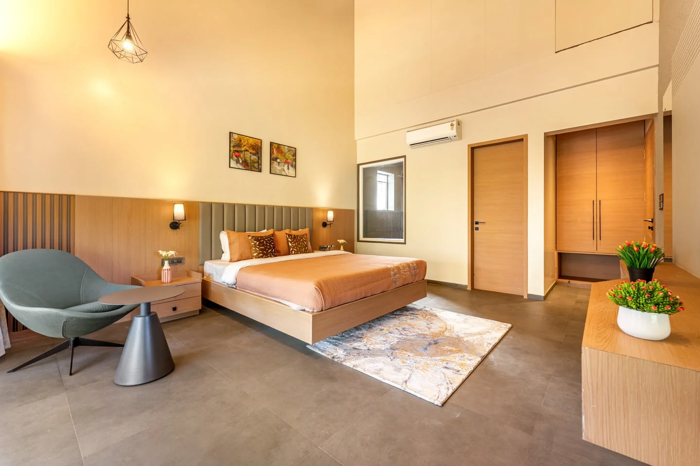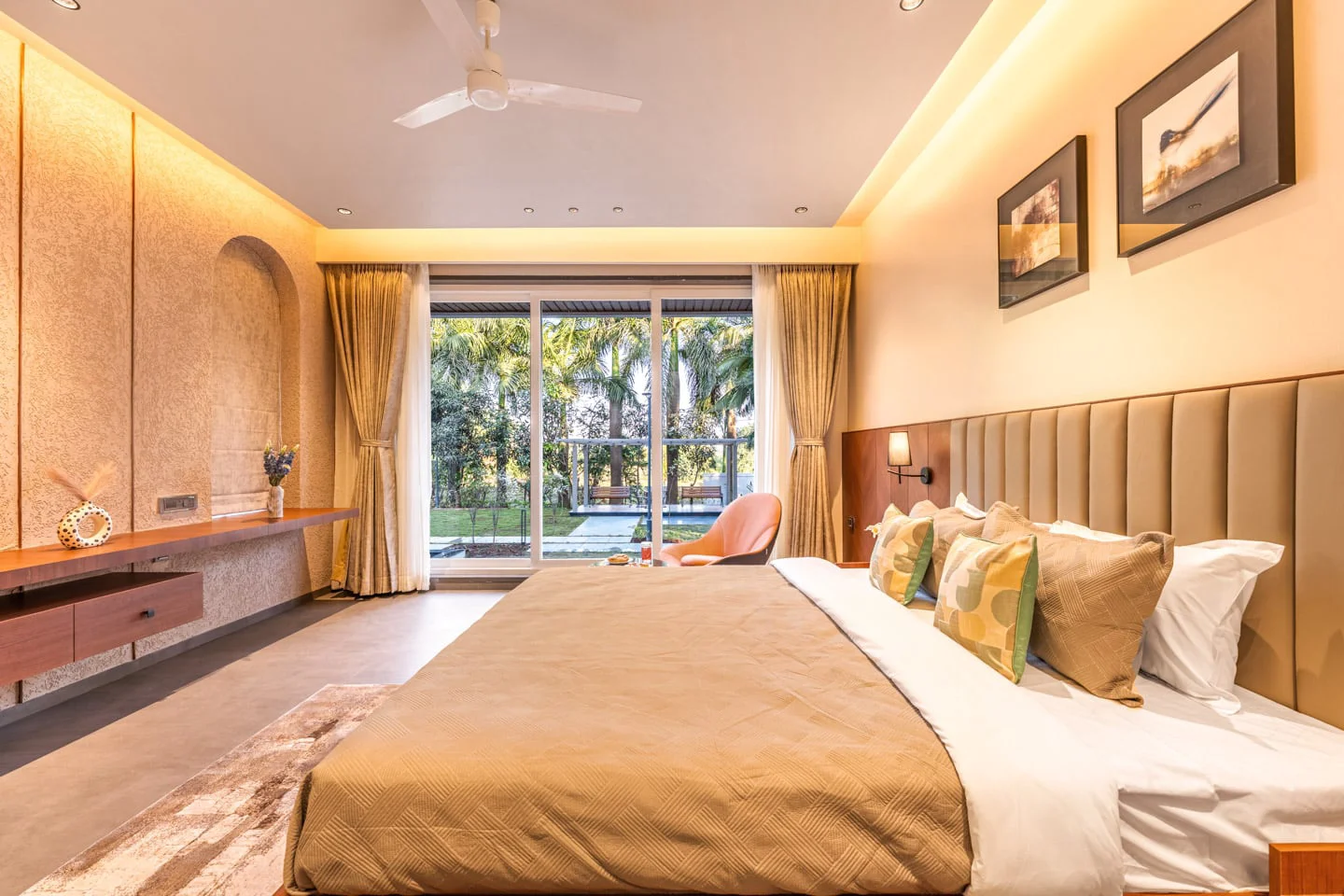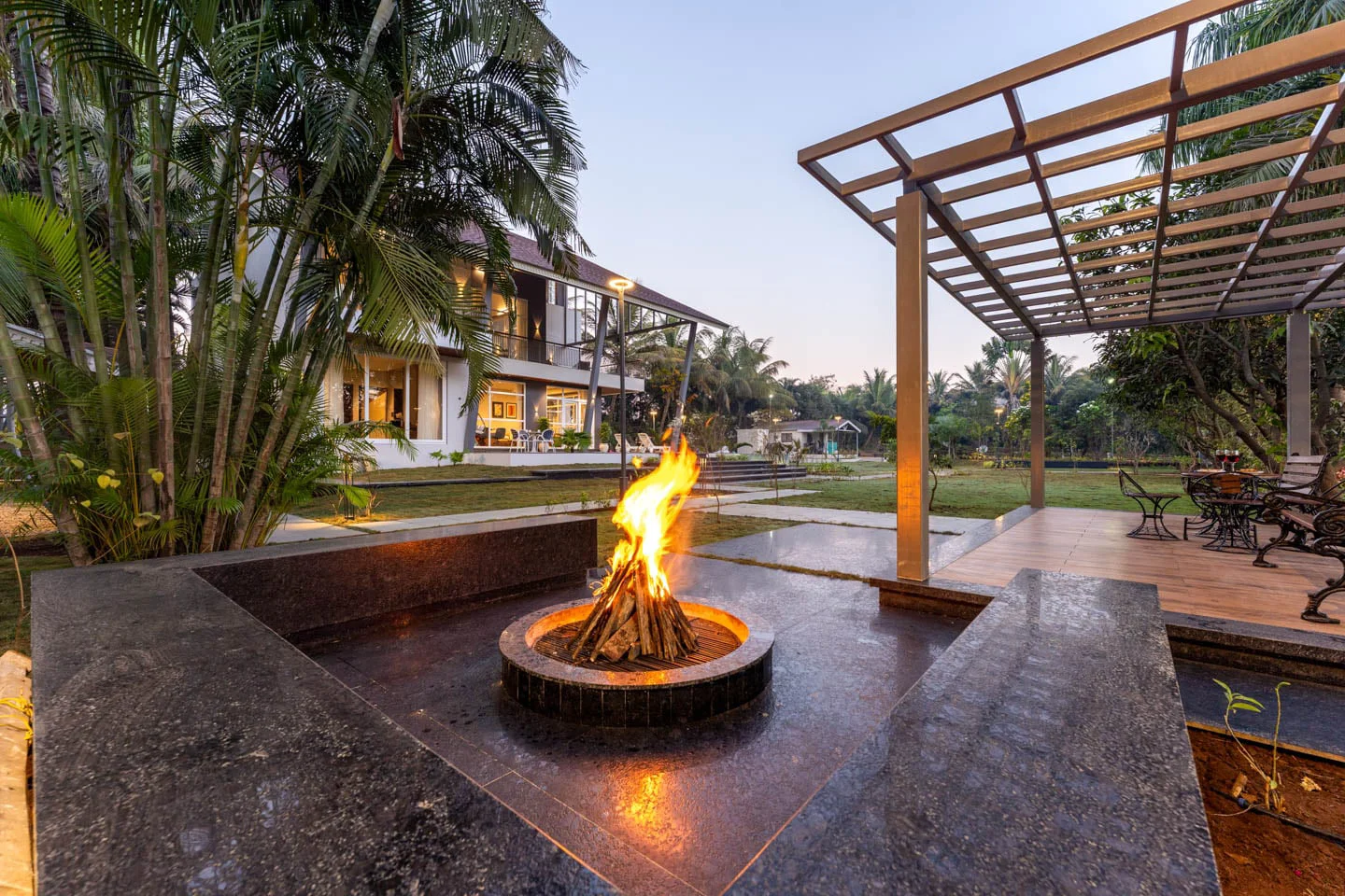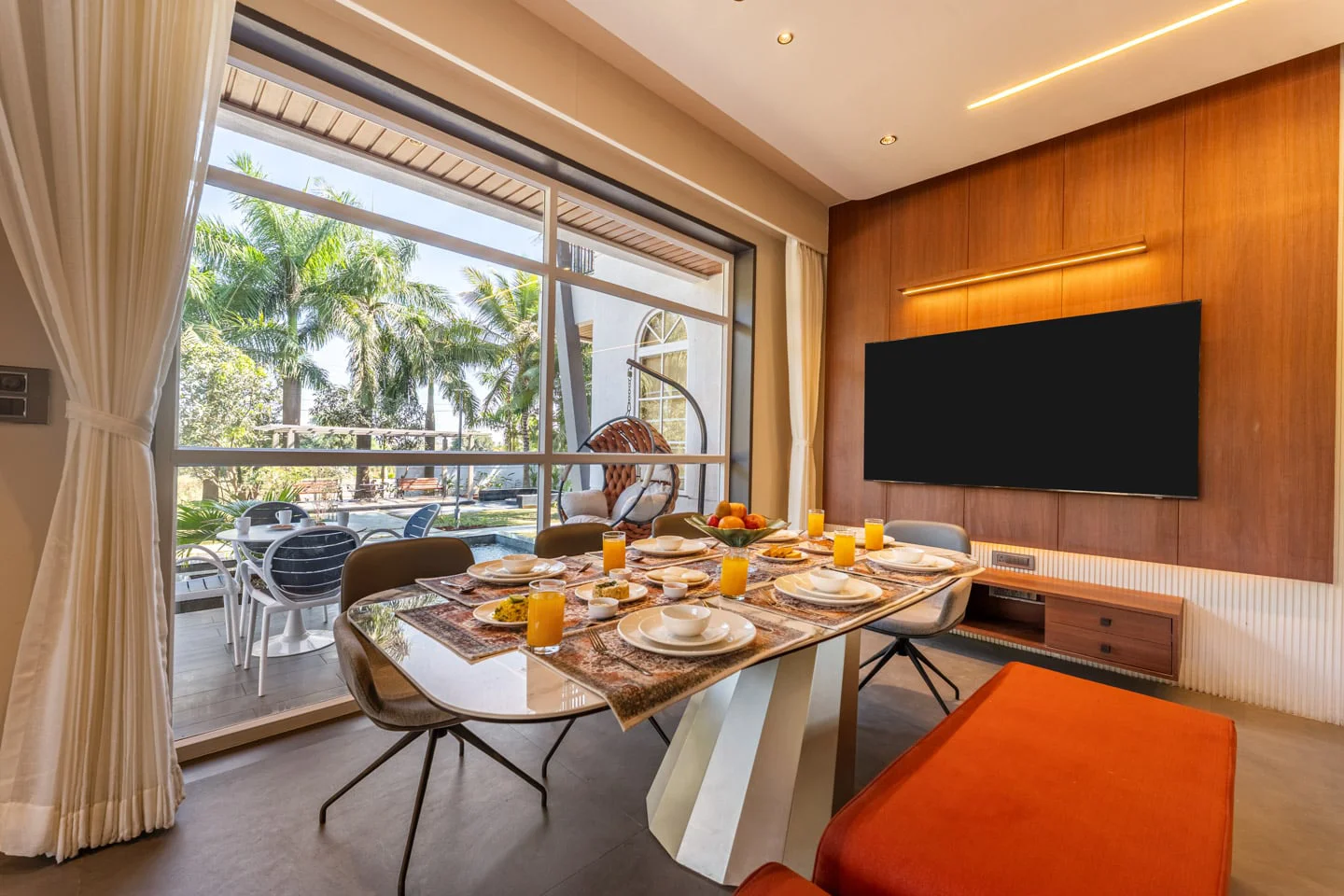 Additional amenities include a dining area, a work desk, and complimentary WiFi, ensuring a comfortable stay. The villa’s earthy interiors, designed with warm tones and elemental elegance, create an inviting atmosphere that is both refined and comforting. Step outside to discover a private pool surrounded by stylish sun loungers, ideal for leisurely afternoons or quiet moments of relaxation. The manicured lawn, adorned with charming sit-out corners, provides the perfect setting for unhurried conversations and sunset pauses.
