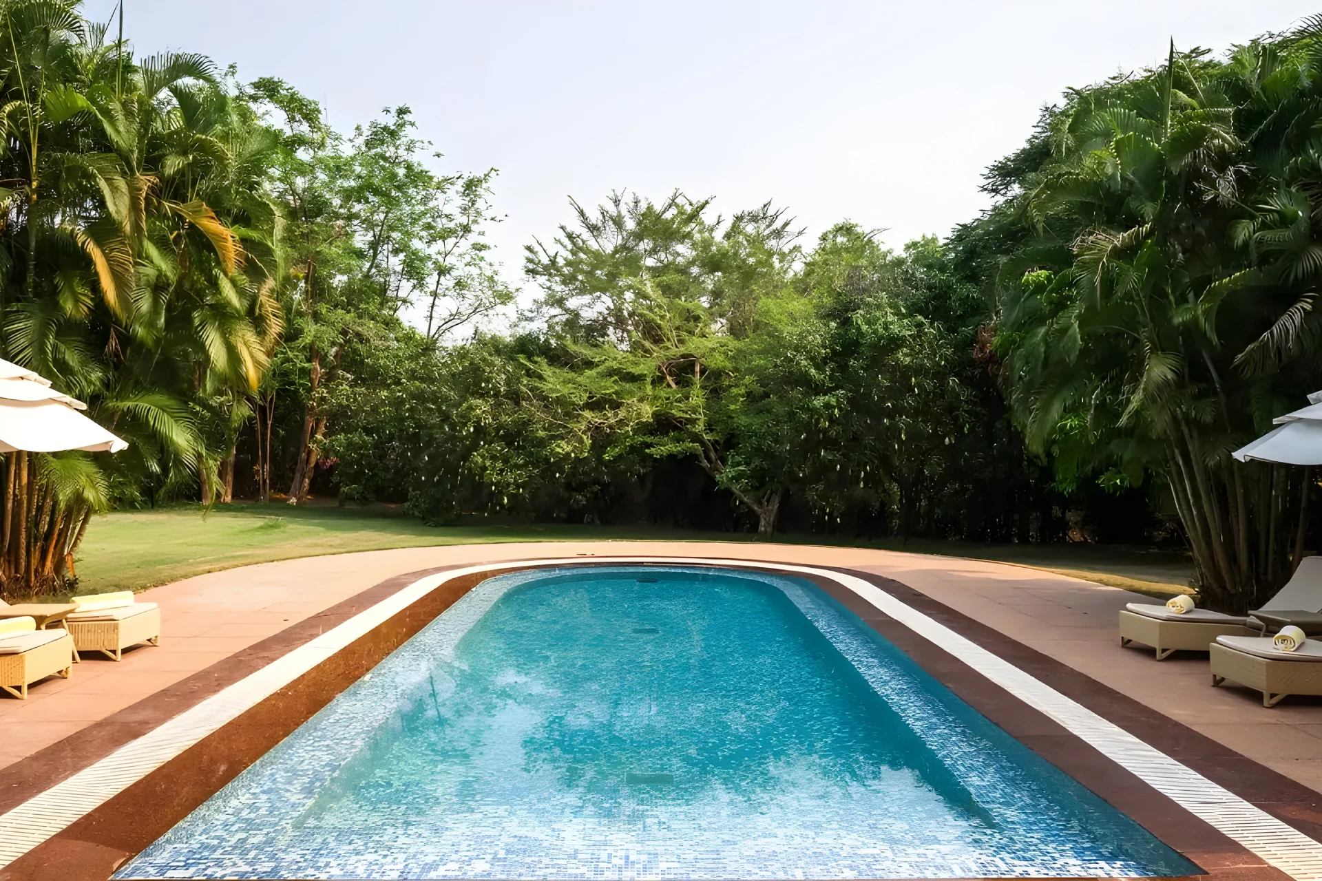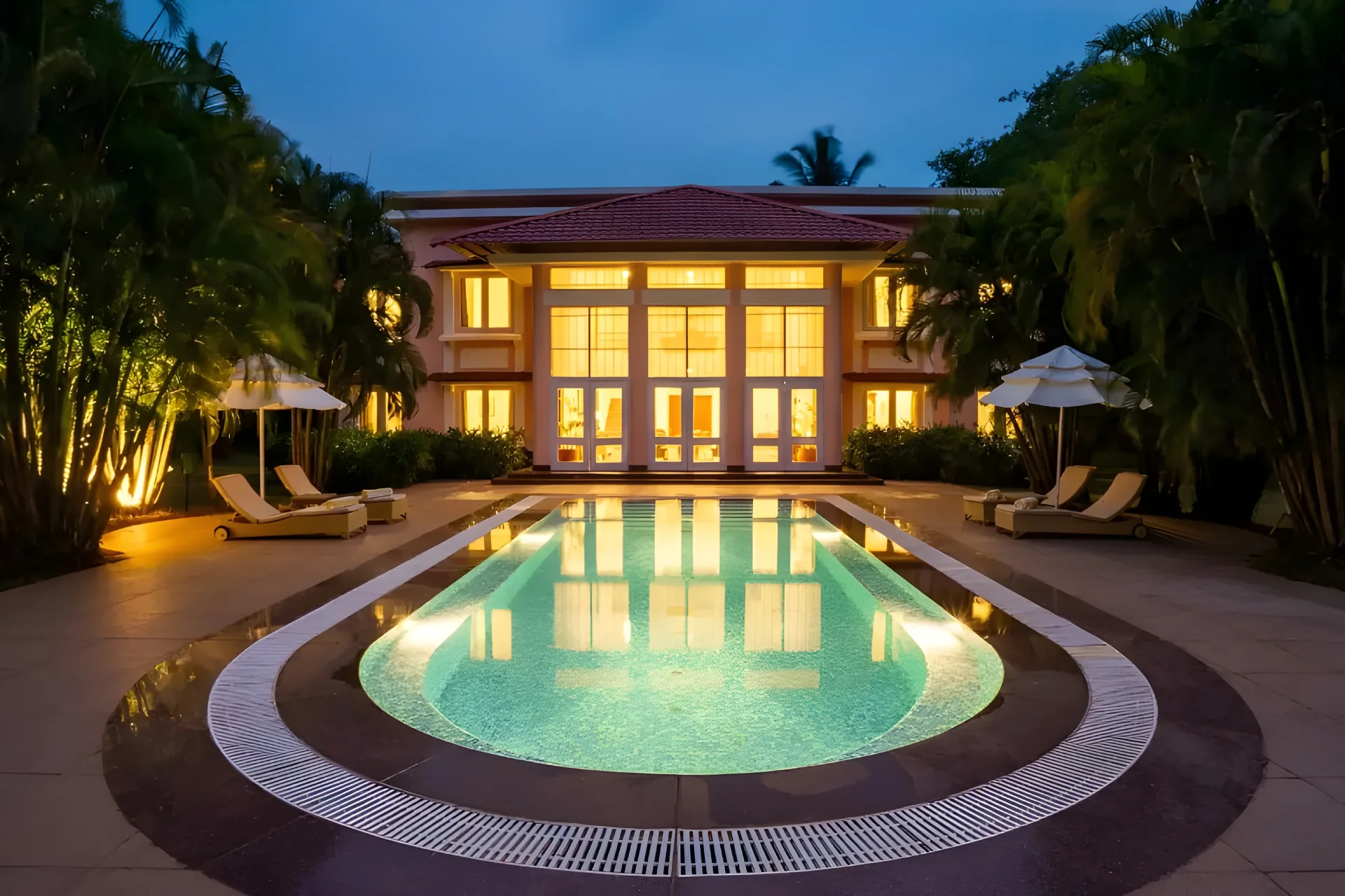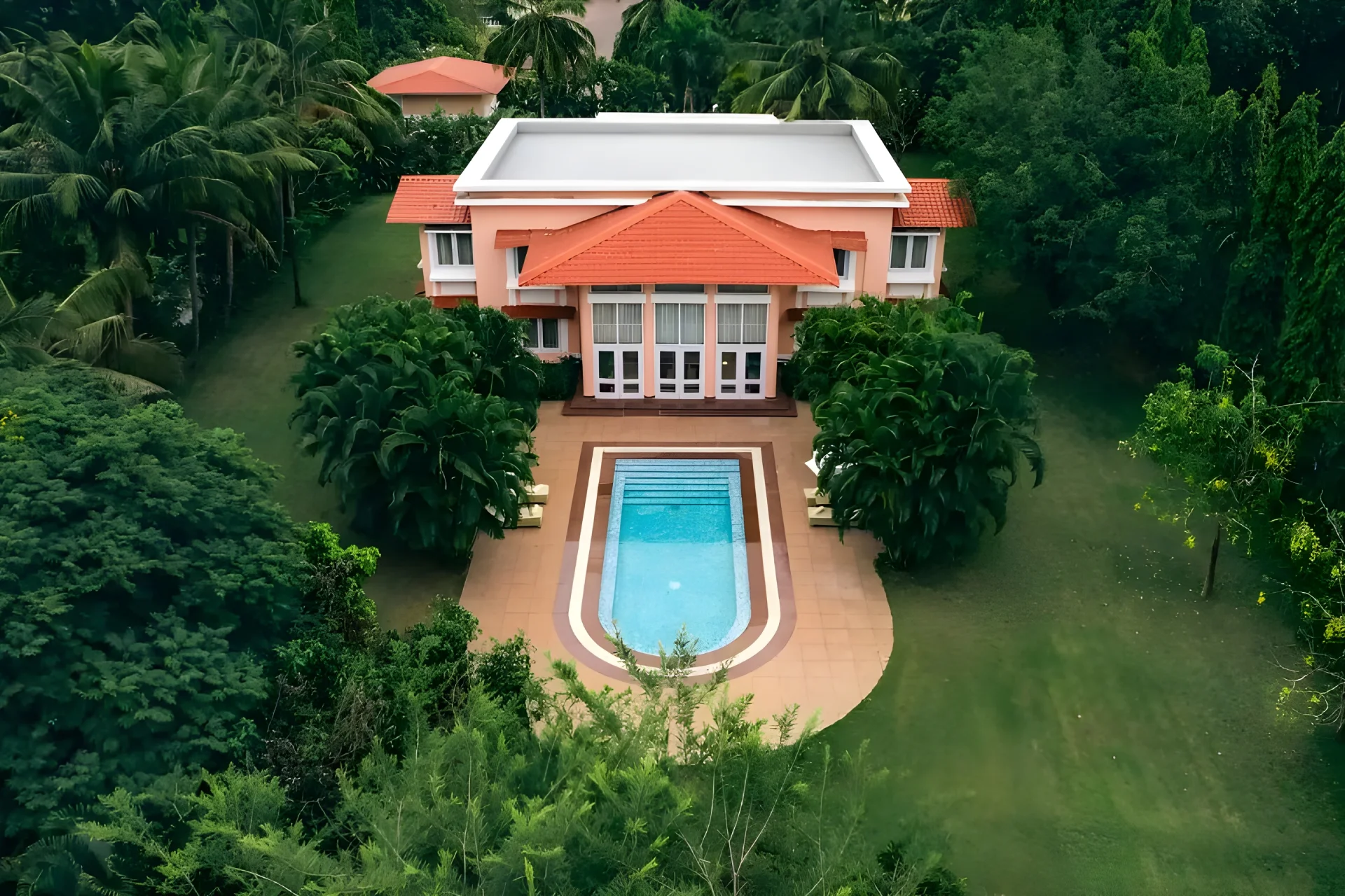 4 Bedroom Villa With Private Pool In South Goa Inspired by Palladian architecture, this retreat features a spacious living area adorned with floor-to-ceiling glass windows, offering unobstructed views of the coastline. Step outside directly into your private swimming pool, encircled by swaying palm trees, creating the ideal setting for relaxation. The villaโs interiors are meticulously designed, harmonizing warm hues with elements of wooden furniture. This beach-facing villa is ideal for families and friends, comprising three generous bedrooms, each equipped with an ensuite bathroom that includes a Jacuzzi.