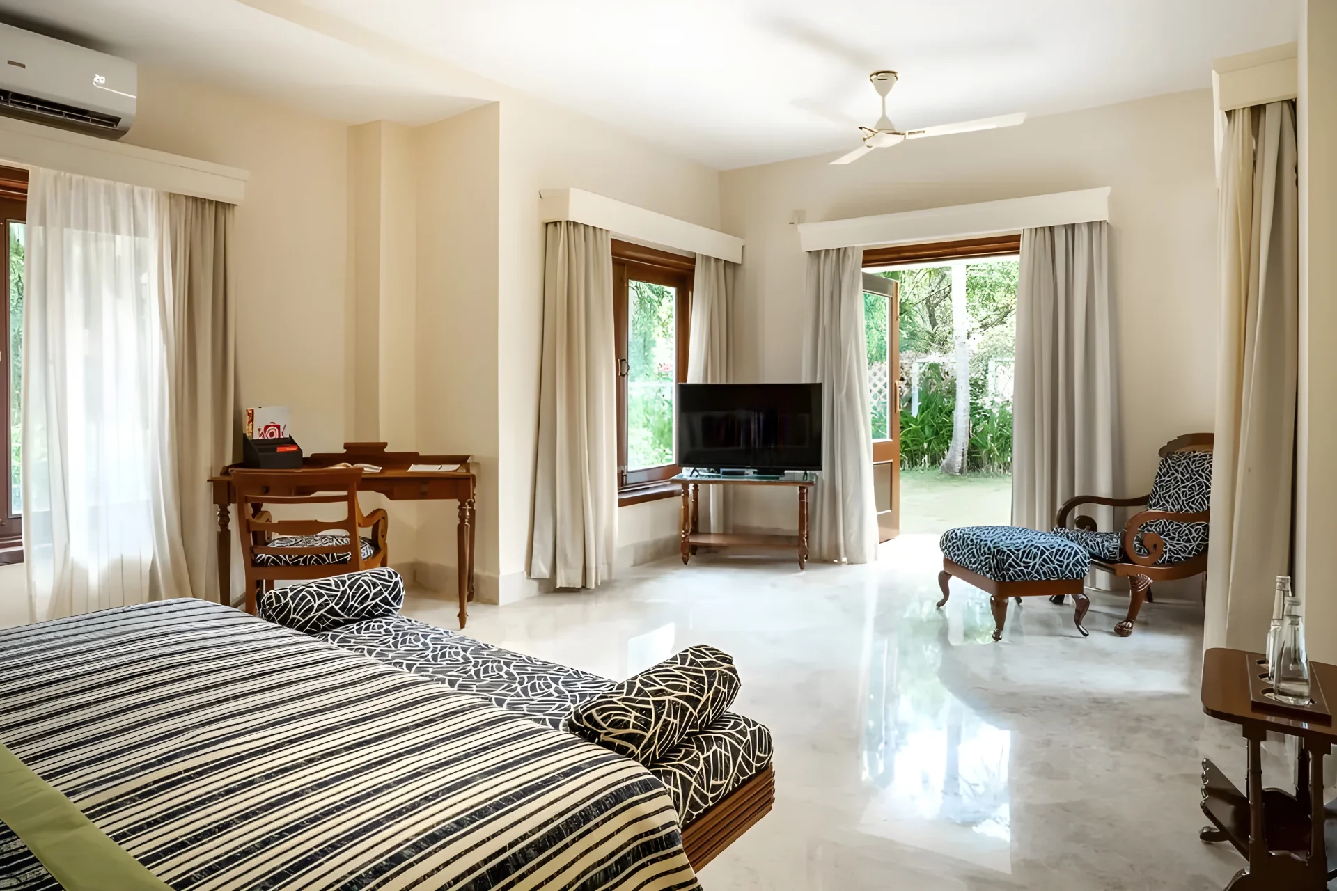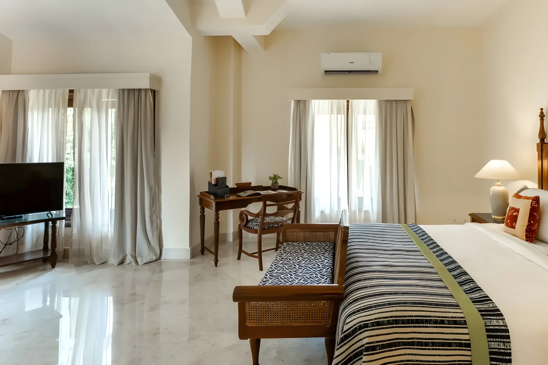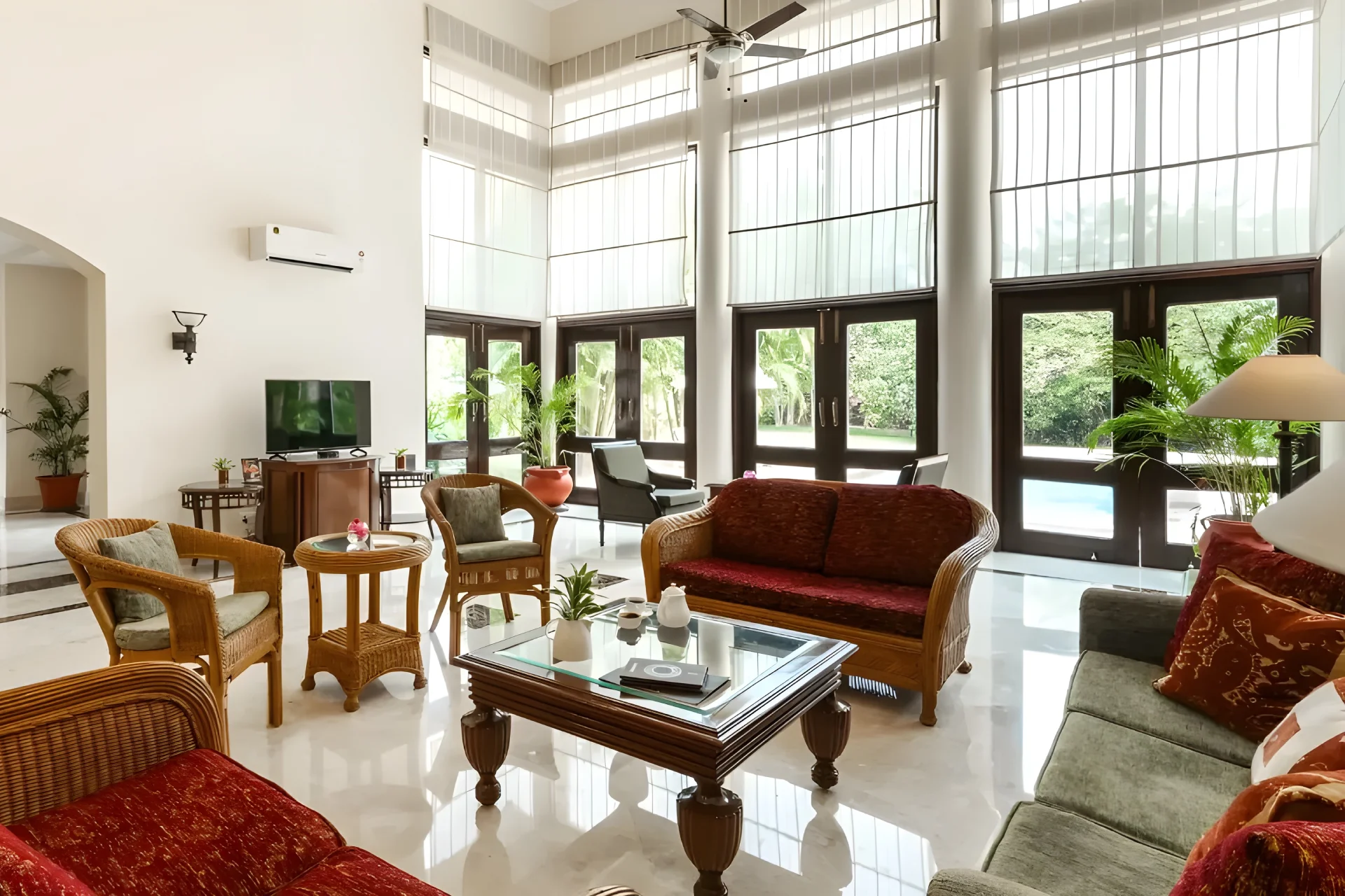 4 Bedroom Villa With Private Pool In South Goa Inspired by Palladian architecture, this retreat features a spacious living area adorned with floor-to-ceiling glass windows, offering unobstructed views of the coastline. Step outside directly into your private swimming pool, encircled by swaying palm trees, creating the ideal setting for relaxation. The villaโs interiors are meticulously designed, harmonizing warm hues with elements of wooden furniture. This beach-facing villa is ideal for families and friends, comprising three generous bedrooms, each equipped with an ensuite bathroom that includes a Jacuzzi.