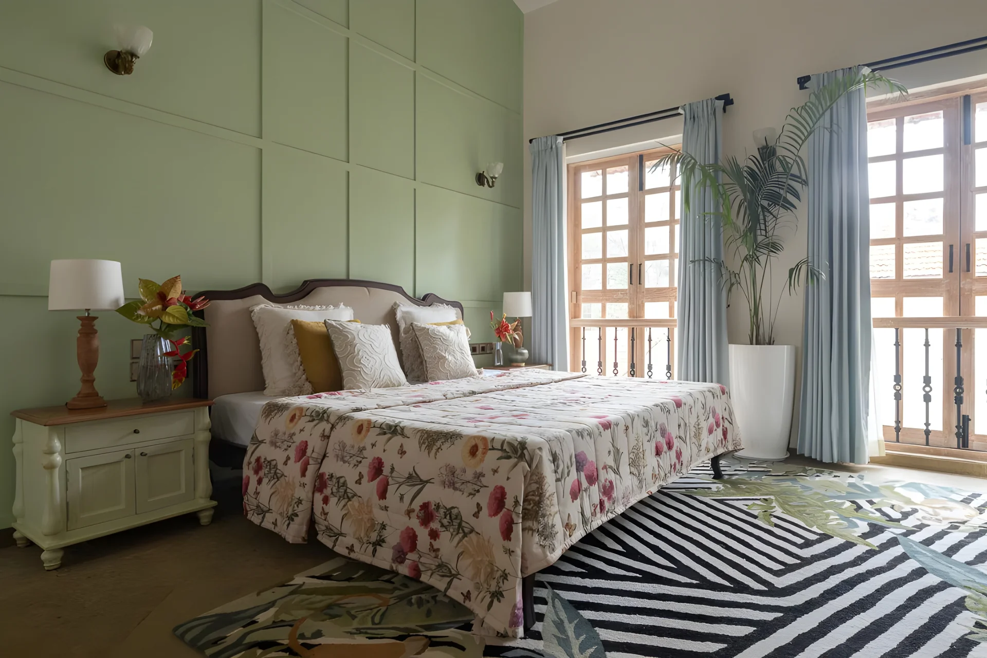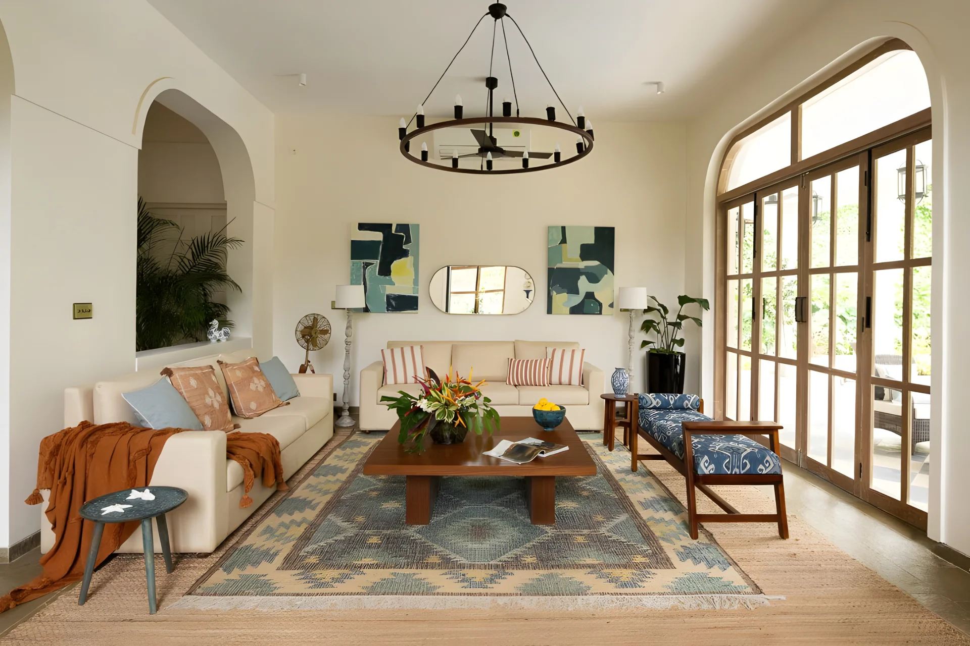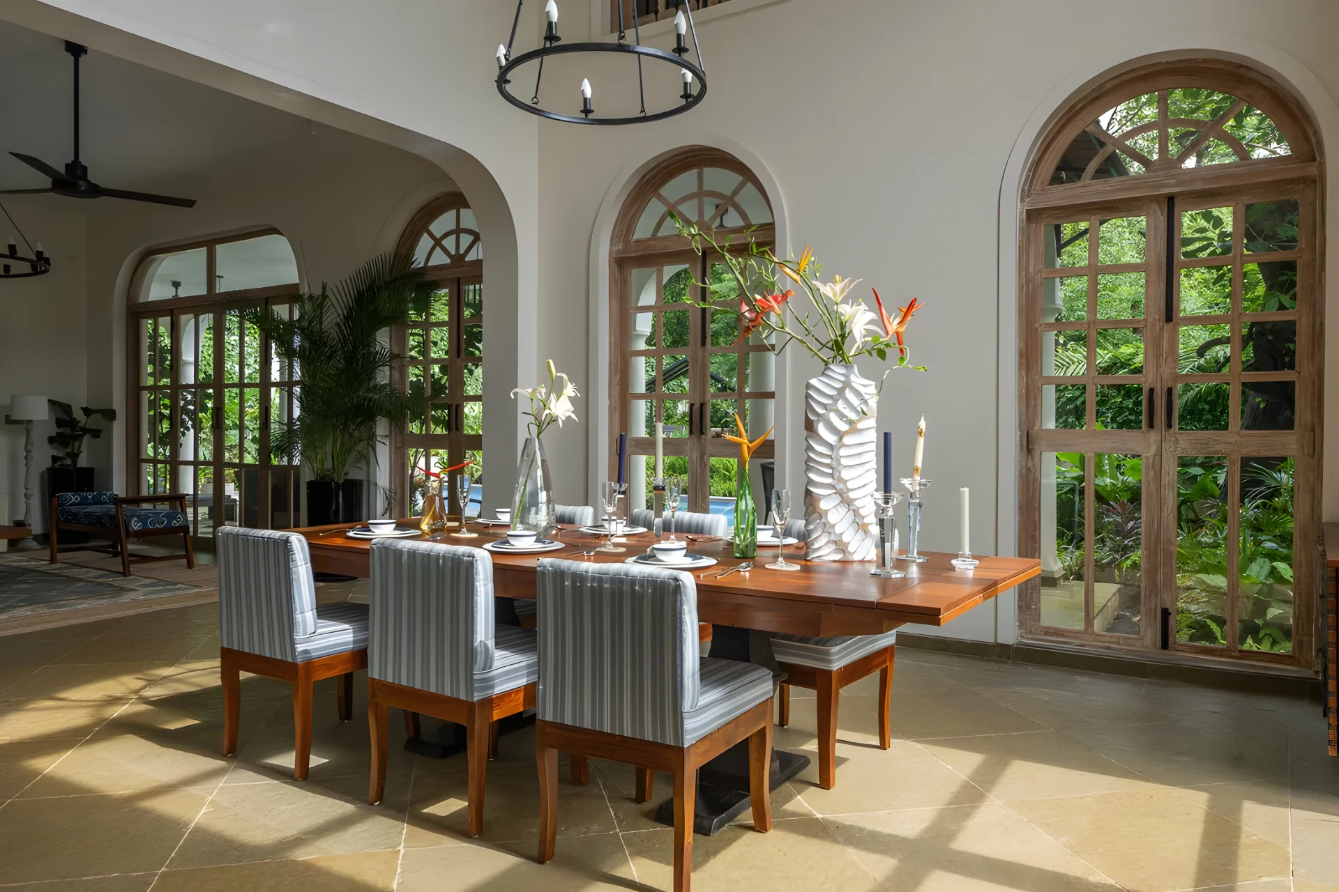 4 Bedroom Villa With Private Pool In North Goa, this villa in Goa effortlessly combines modern design with a hint of retro Hollywood allure. Each corner of the villa is a masterpiece, narrating its own unique story. Upon entering, you will be welcomed by a charming living room, ideal for unwinding with family and enjoying a film. The dining area features large glass windows that provide a view of the lush surroundings, establishing a picturesque atmosphere for leisurely meals. With a striking turquoise entrance, patterned stone flooring, and elements such as a sunlit den filled with vintage legal texts, the residence harmonizes charm and character with comfort and understated elegance.