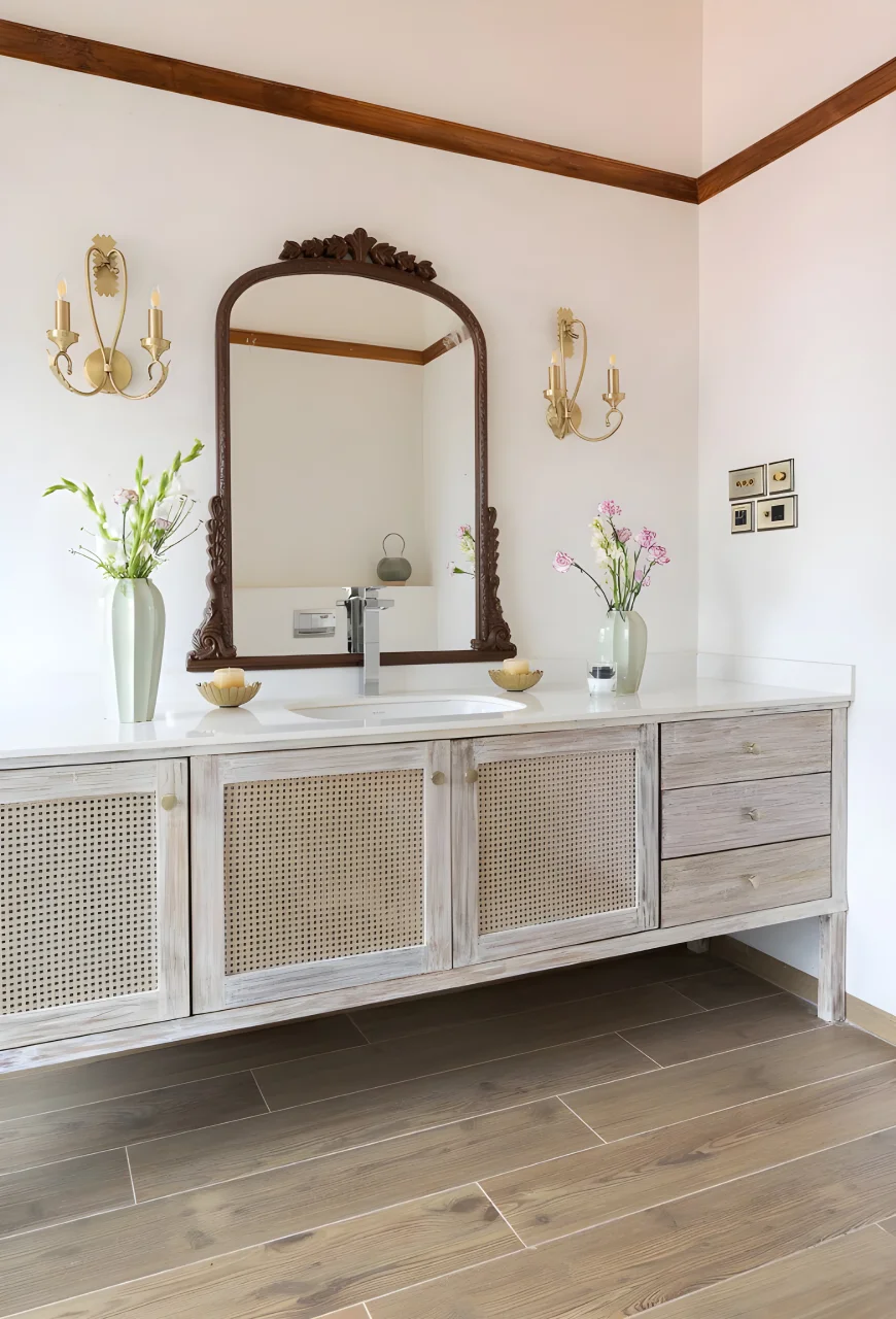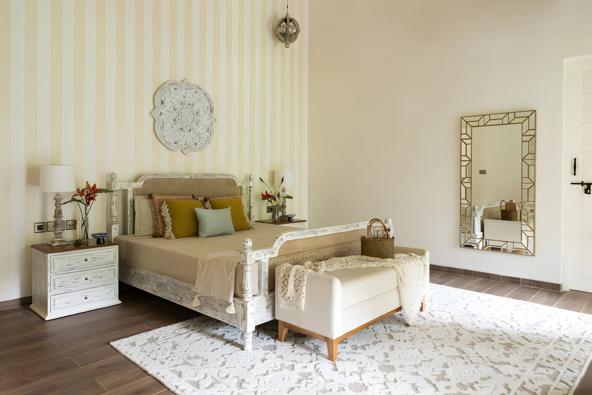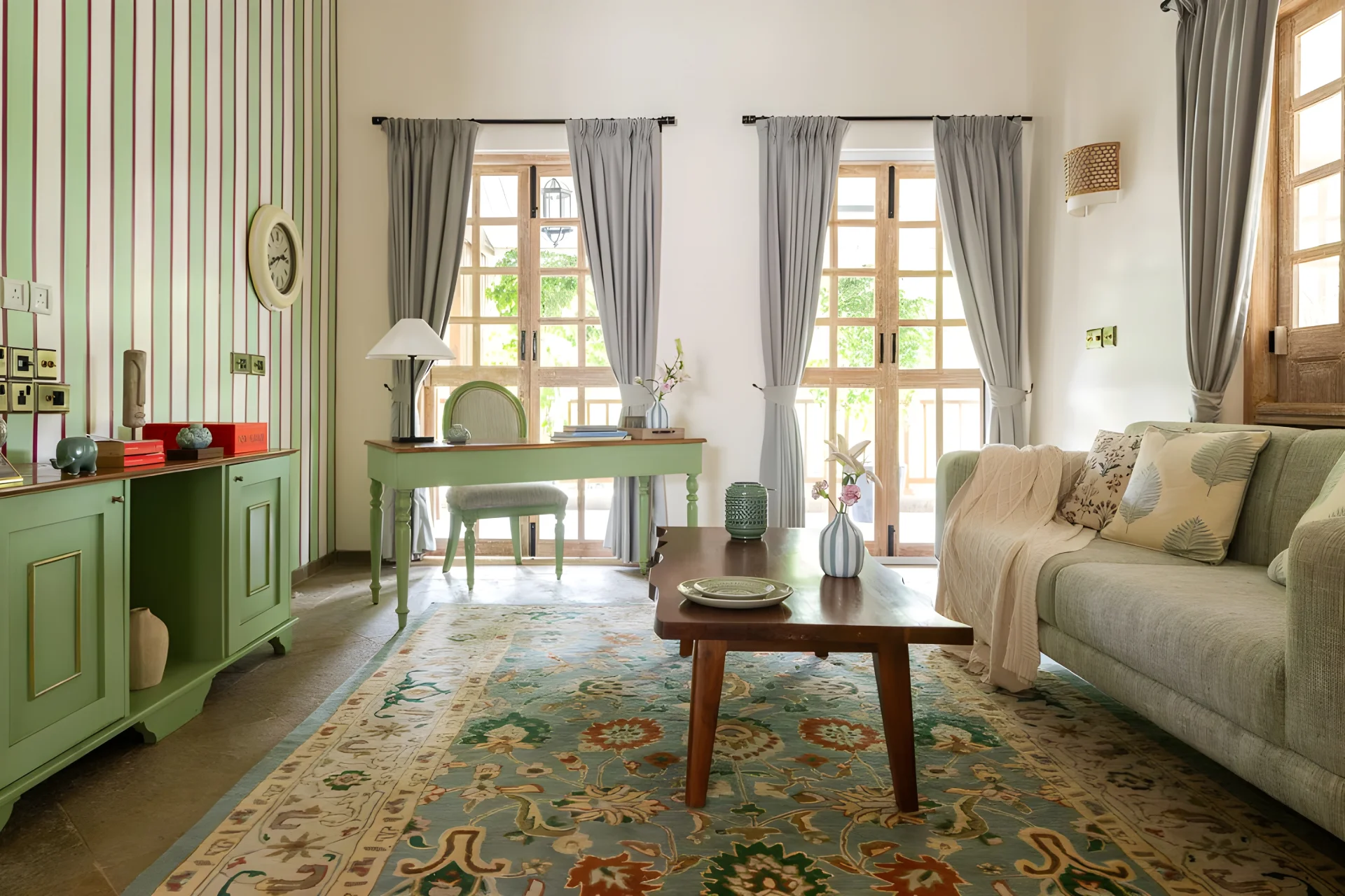 4 Bedroom Villa With Private Pool In North Goa, this villa in Goa effortlessly combines modern design with a hint of retro Hollywood allure. Each corner of the villa is a masterpiece, narrating its own unique story. Upon entering, you will be welcomed by a charming living room, ideal for unwinding with family and enjoying a film. The dining area features large glass windows that provide a view of the lush surroundings, establishing a picturesque atmosphere for leisurely meals. With a striking turquoise entrance, patterned stone flooring, and elements such as a sunlit den filled with vintage legal texts, the residence harmonizes charm and character with comfort and understated elegance.