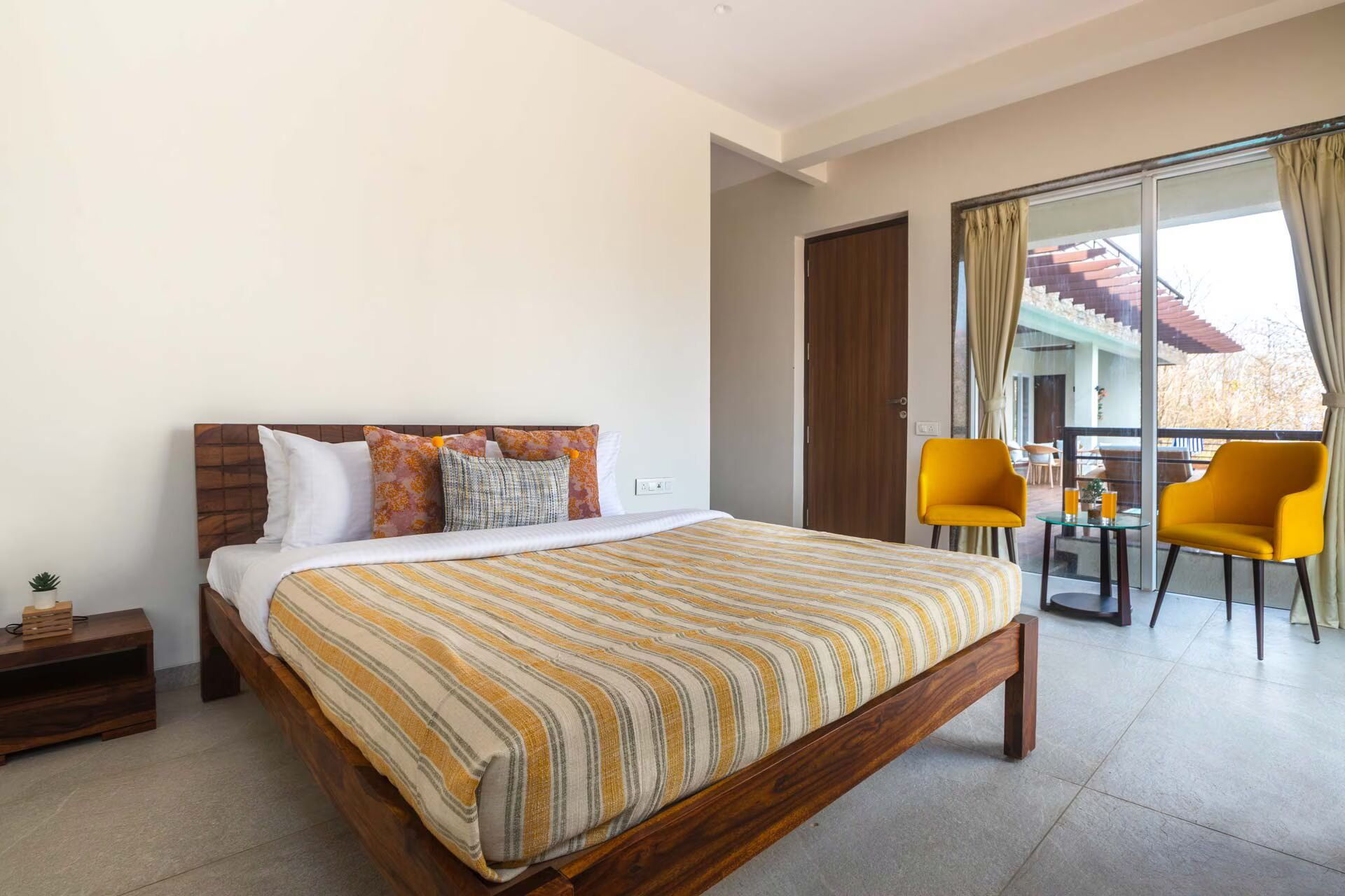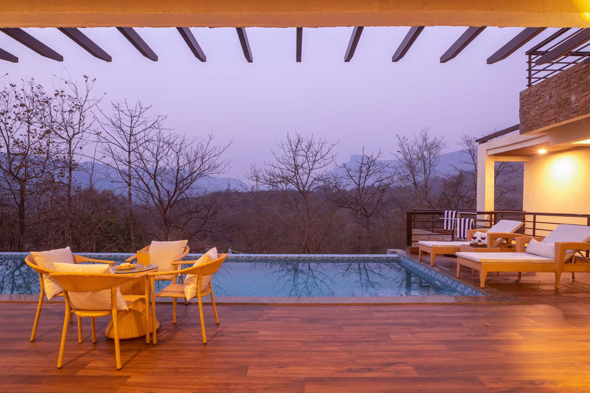 VODMH12 villa is a luxurious villa located in Khopoli, Maharashtra, offering a serene retreat amidst lush greenery and picturesque mountain views. After savoring your morning coffee in the sunlit living space, proceed to the pool area to bask in the sunlight and refresh yourself from the heat of the afternoon. The interior features a subdued color scheme that radiates serenity, complemented by sophisticated decor and airy windows that enhance the overall brightness of the space.
