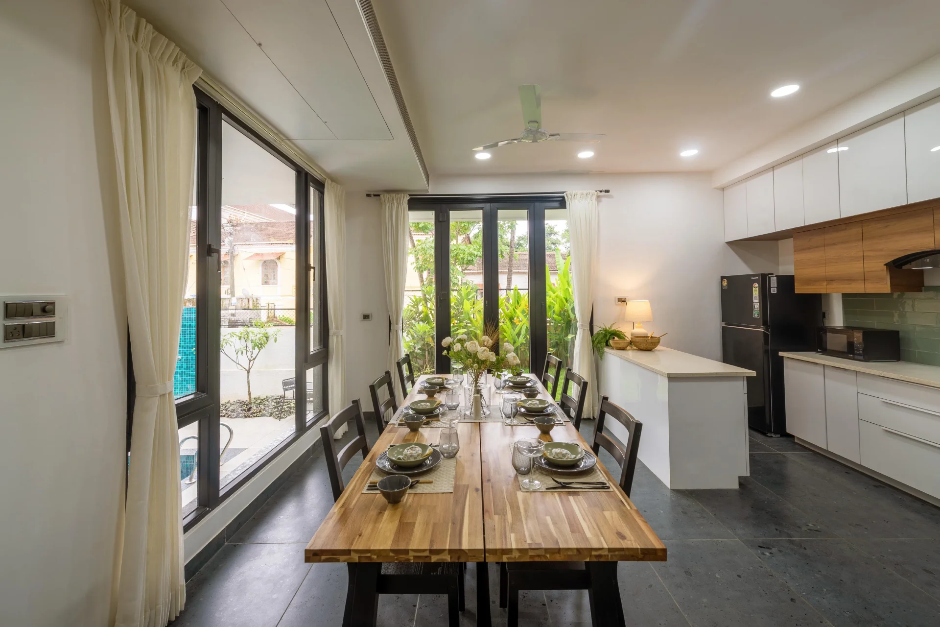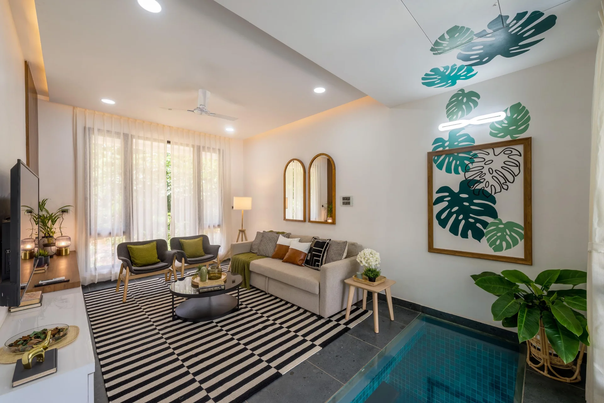 4 BHK Pet Friendly Villa In North Goa The villa located in Nerul, Goa, is not merely a residence; it serves as a catalyst for conversation! Its breathtaking private pool seamlessly integrates with the villa, extending beneath the living room floor, creating the sensation of walking on water.