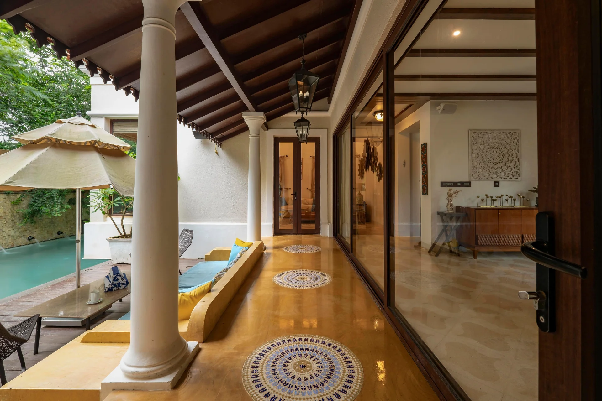 4 BHK Pet Friendly Villa In North Goa The villa located in Nerul, Goa, is not merely a residence; it serves as a catalyst for conversation! Its breathtaking private pool seamlessly integrates with the villa, extending beneath the living room floor, creating the sensation of walking on water.