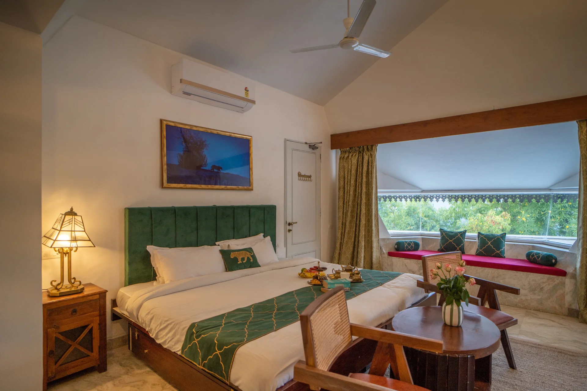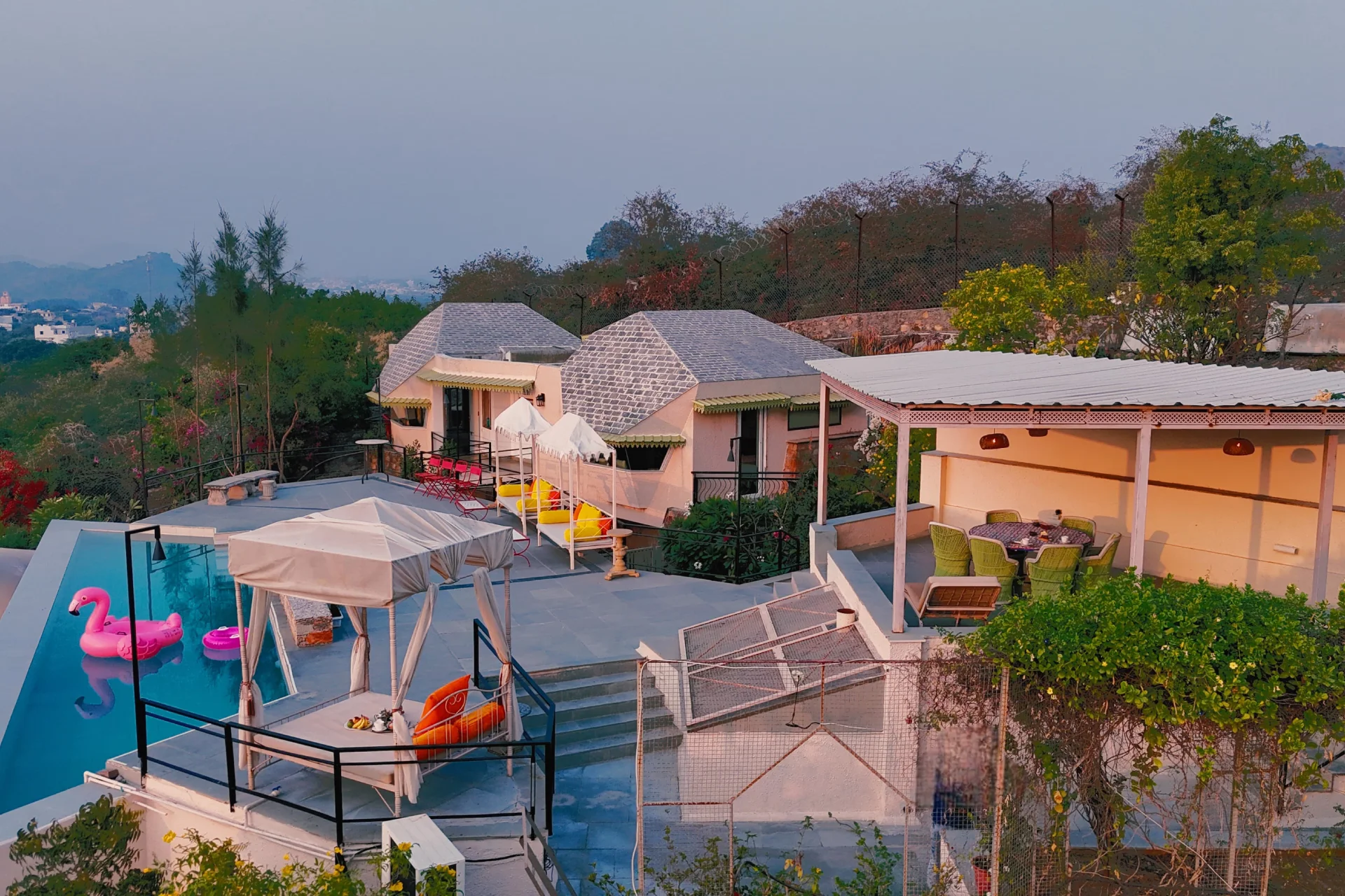 The villa features modern amenities, including spacious bedrooms, elegant living areas, and a fully equipped kitchen. The air-conditioned villa consists of 4 bedrooms with dining area, and 5 bathrooms with shower. Outdoor facilities include a private swimming pool, lush gardens, and cozy seating areas, perfect for relaxation or gatherings. The property is designed to blend contemporary comforts with the charm of Udaipur Rajasthan natural beauty.