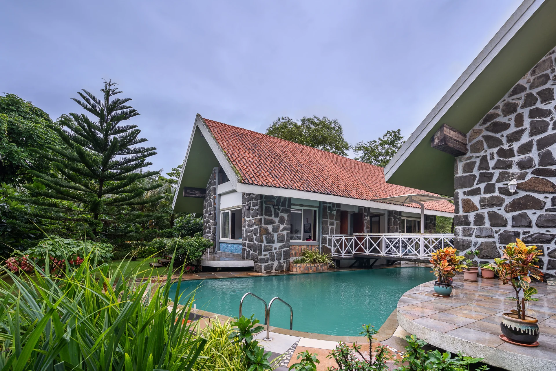 4 BHK Villa With Garden A luxurious villa with a pool located in Alibaug, serving as the ideal getaway for individuals desiring a combination of contemporary comforts and scenic beauty. Its two beautifully designed buildings, central pool, and lush gardens offer an idyllic retreat for relaxation, fun, and memorable gatherings.