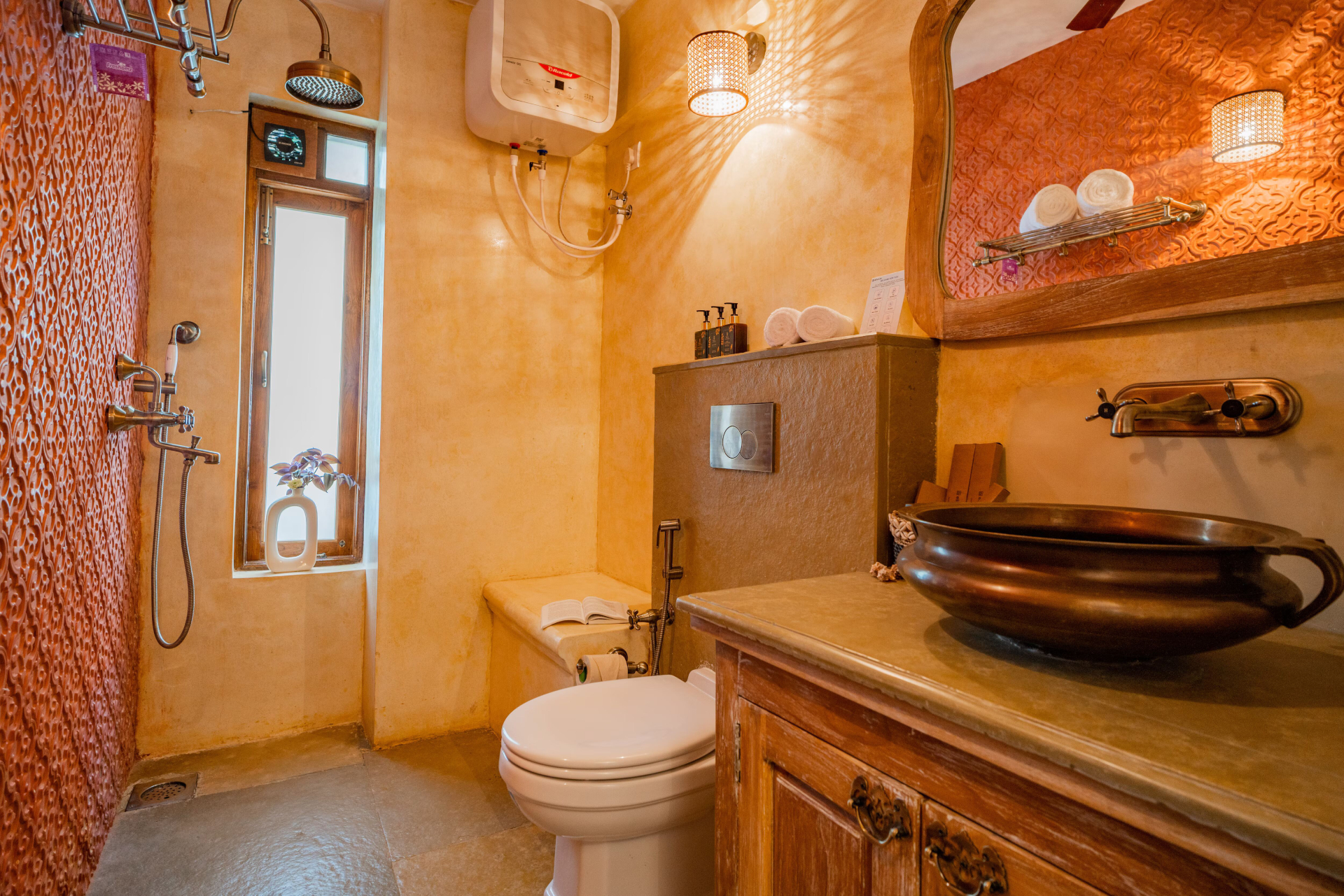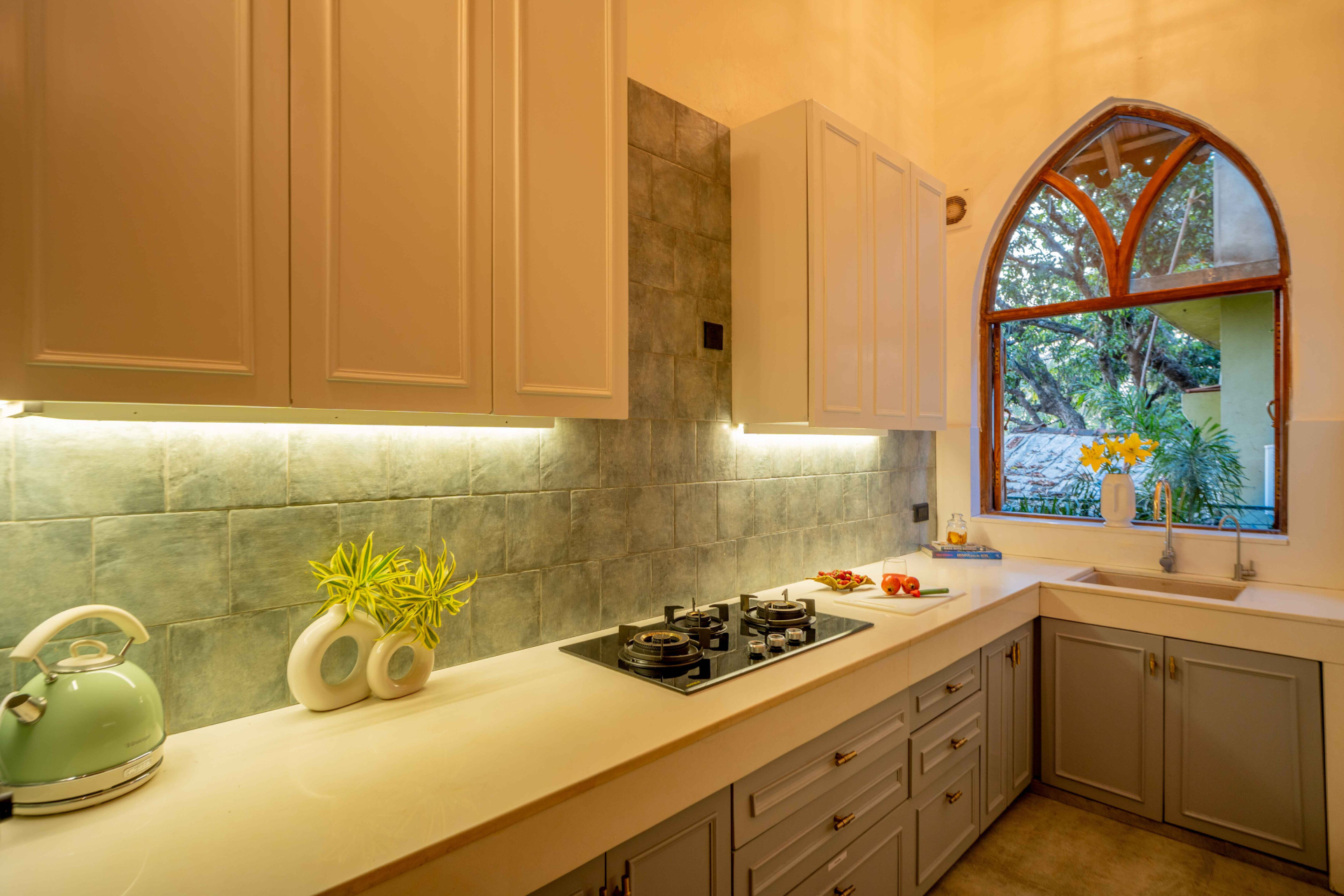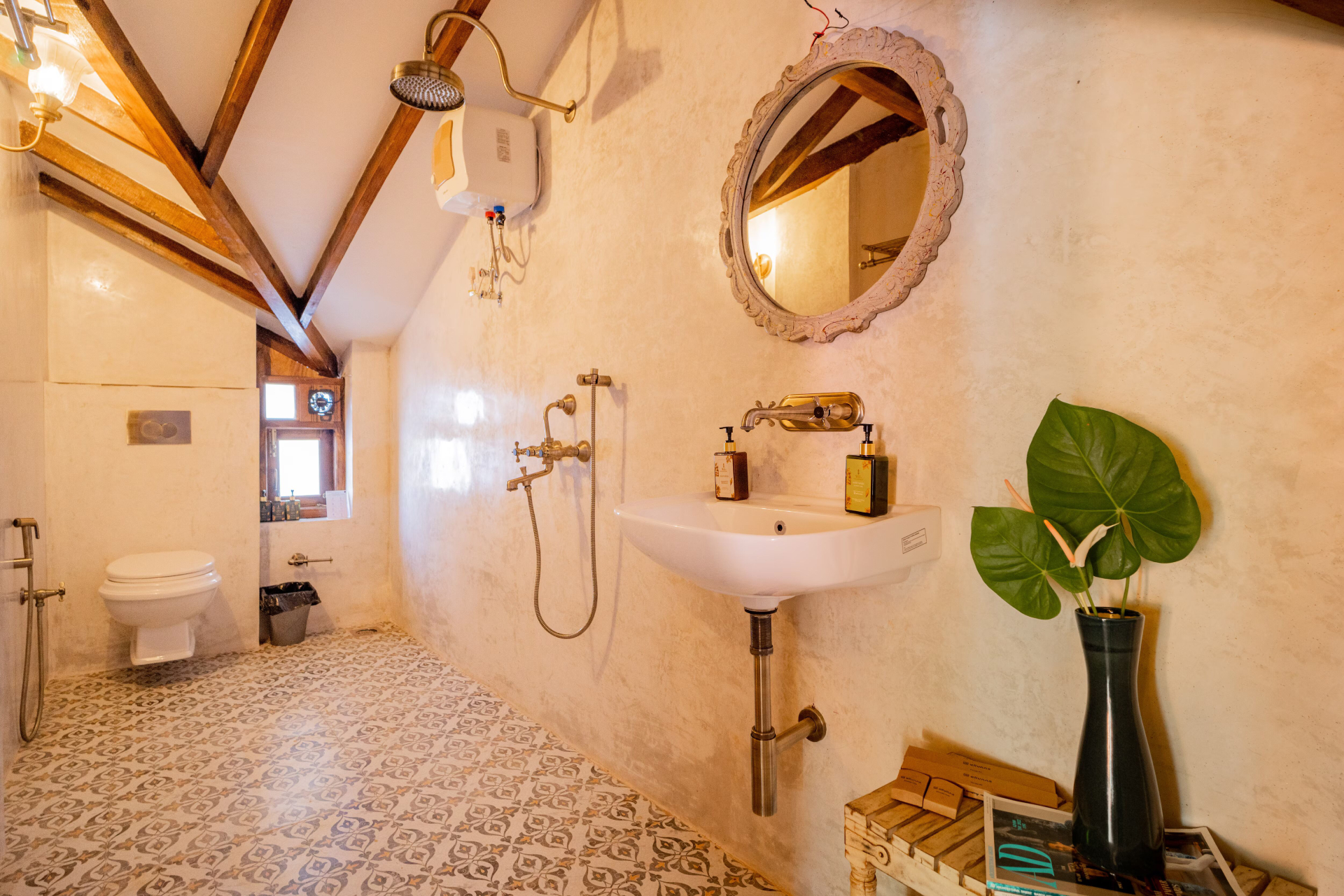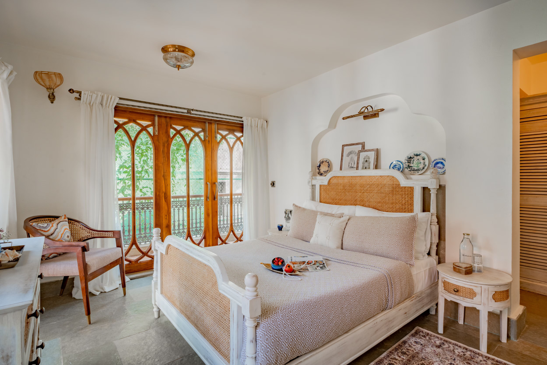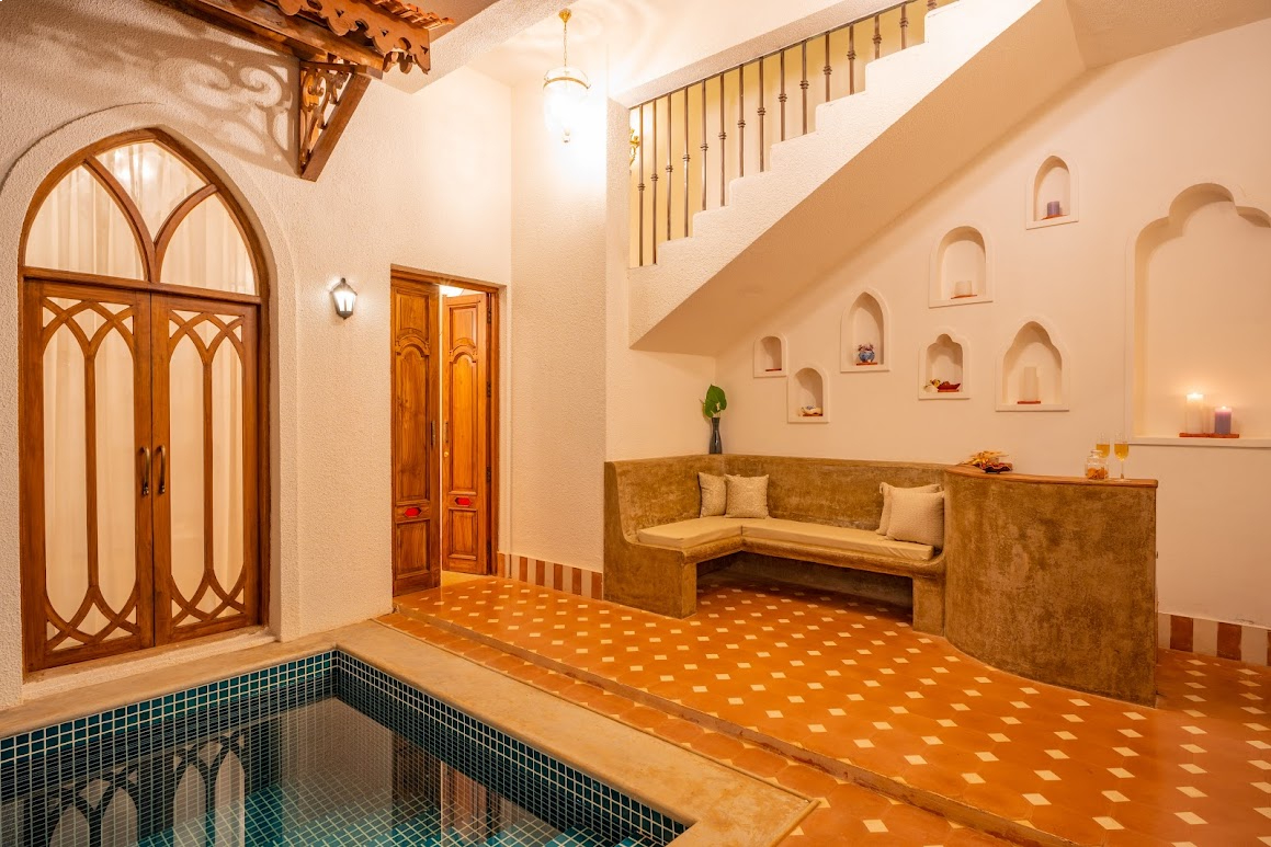 Enjoy the comfort of attached bathrooms in all 4 bedrooms, and unwind on the exclusive terrace the perfect setting for memorable gatherings. Upon arrival, a delightful surprise basket, bamboo tissues, and an eco friendly hygiene kit will greet you, as we believe in maintaining pristine and perfect surroundings. The living area seamlessly blends traditional and modern design, featuring a rustic wooden ceiling and classic chandeliers for added grandeur. Bright and airy, this space showcases large arched windows with intricate latticework and tasteful decorative items, including ceramic plates.