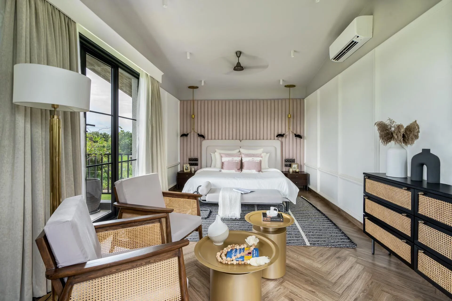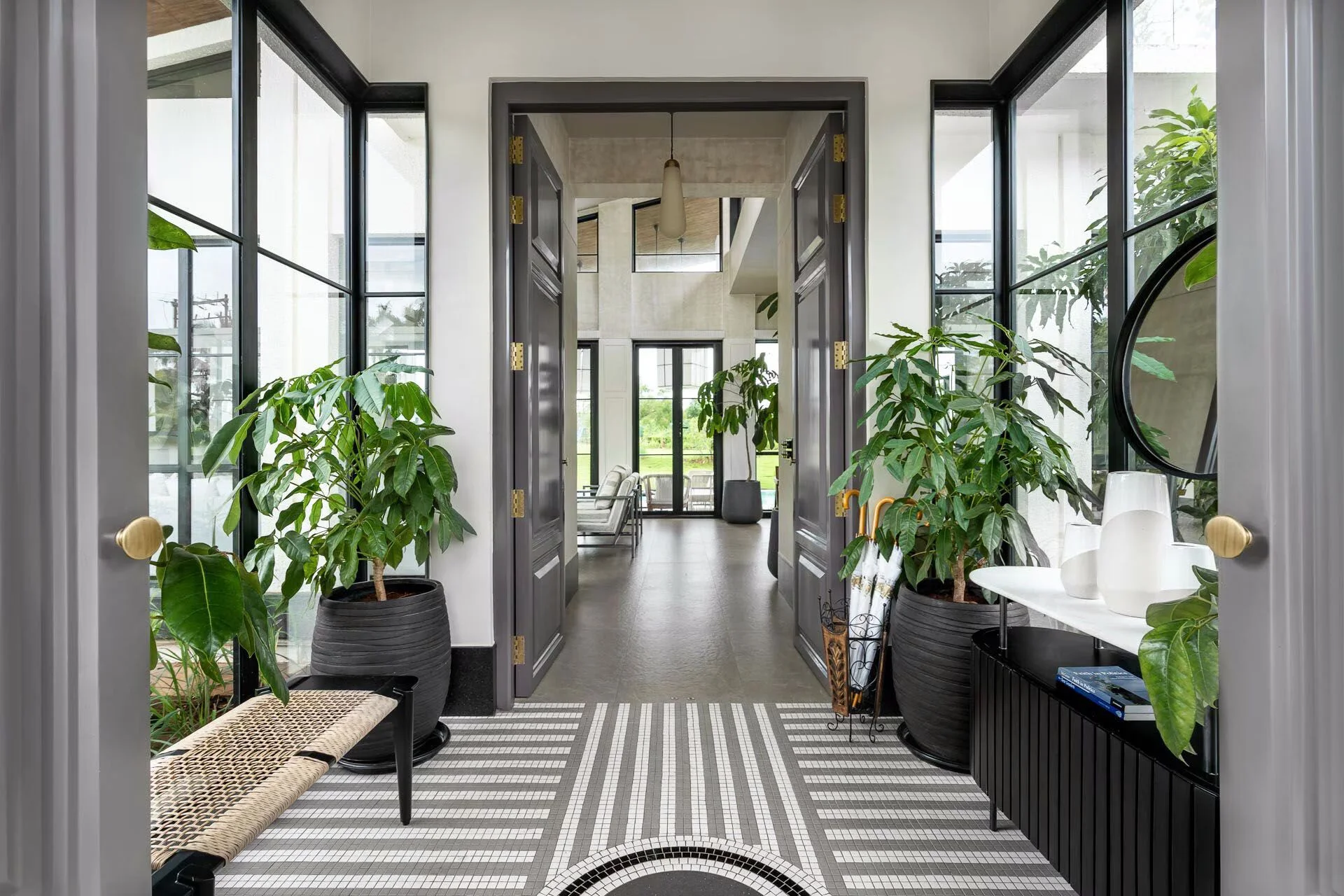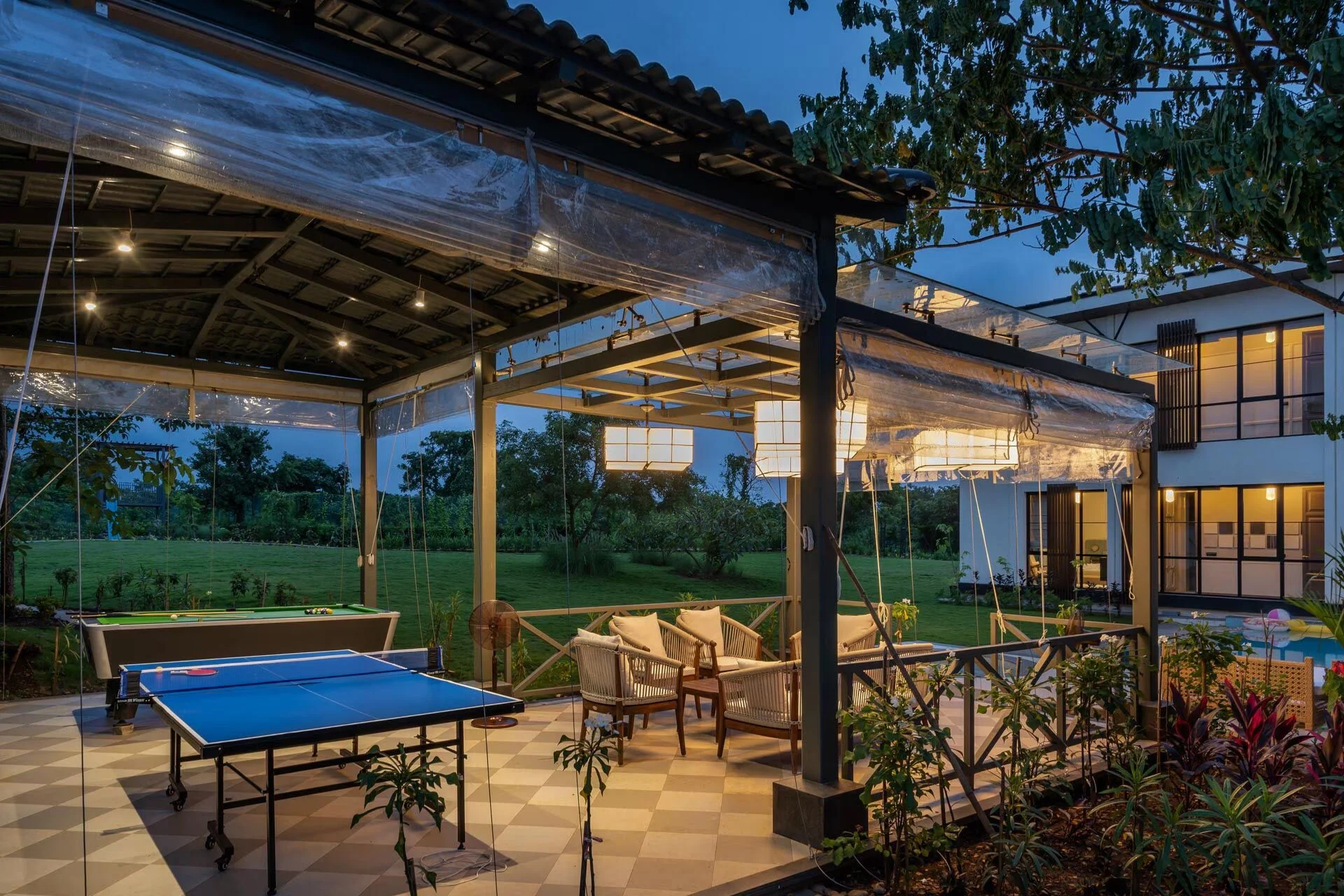 5 Bedroom Jacuzzi Villa VODMH213 nestled within the lush tropical greenery of Alibaug. The incorporation of earthy elements and hues fosters a calming atmosphere, allowing you to connect with nature, while the rustic textures and patterned flooring establish a visually pleasing equilibrium.