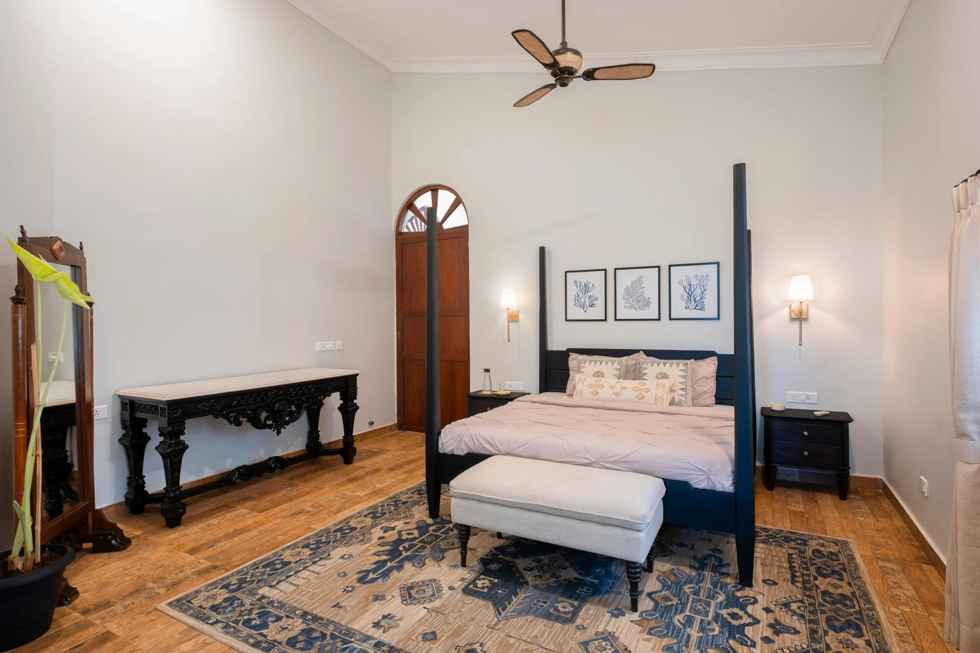 Elegant arched openings adorned with handmade tiles, a magnificent 10-foot live-edge dining table, and a sunlit lounge overlooking the pool establish an atmosphere of relaxed tropical sophistication. Nestled in a tranquil, wooded area of Assagao, it remains conveniently close to vibrant locations while providing a peaceful retreat for families, gatherings, and stylish events. Situated 24 km from Manohar International Airport, the villa is near Vagator Beach at 2.8 km and Chapora Fort at 2.5 km. Nearby attractions include Fort Aguada at 16 km and Basilica Of Bom Jesus at 28 km.