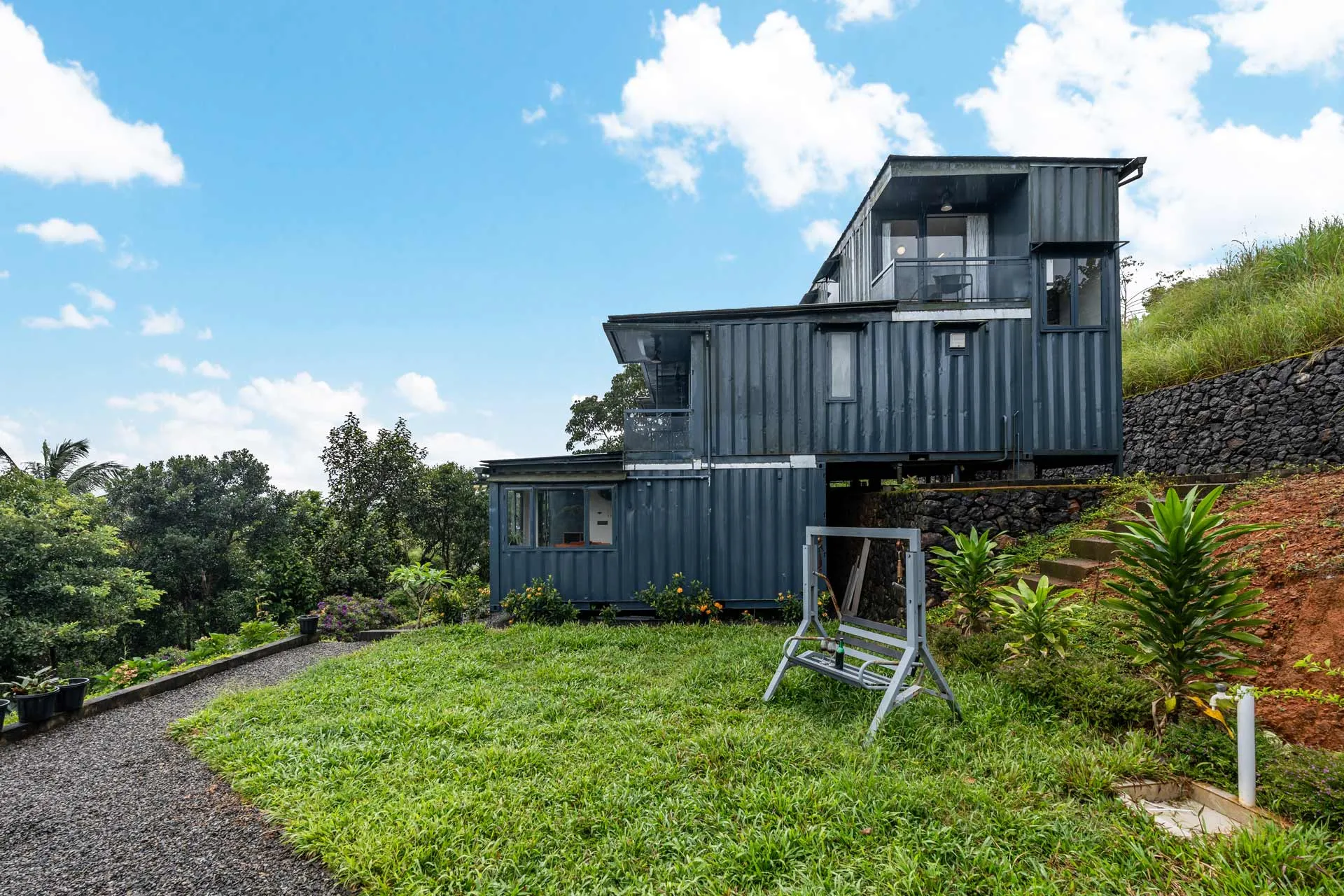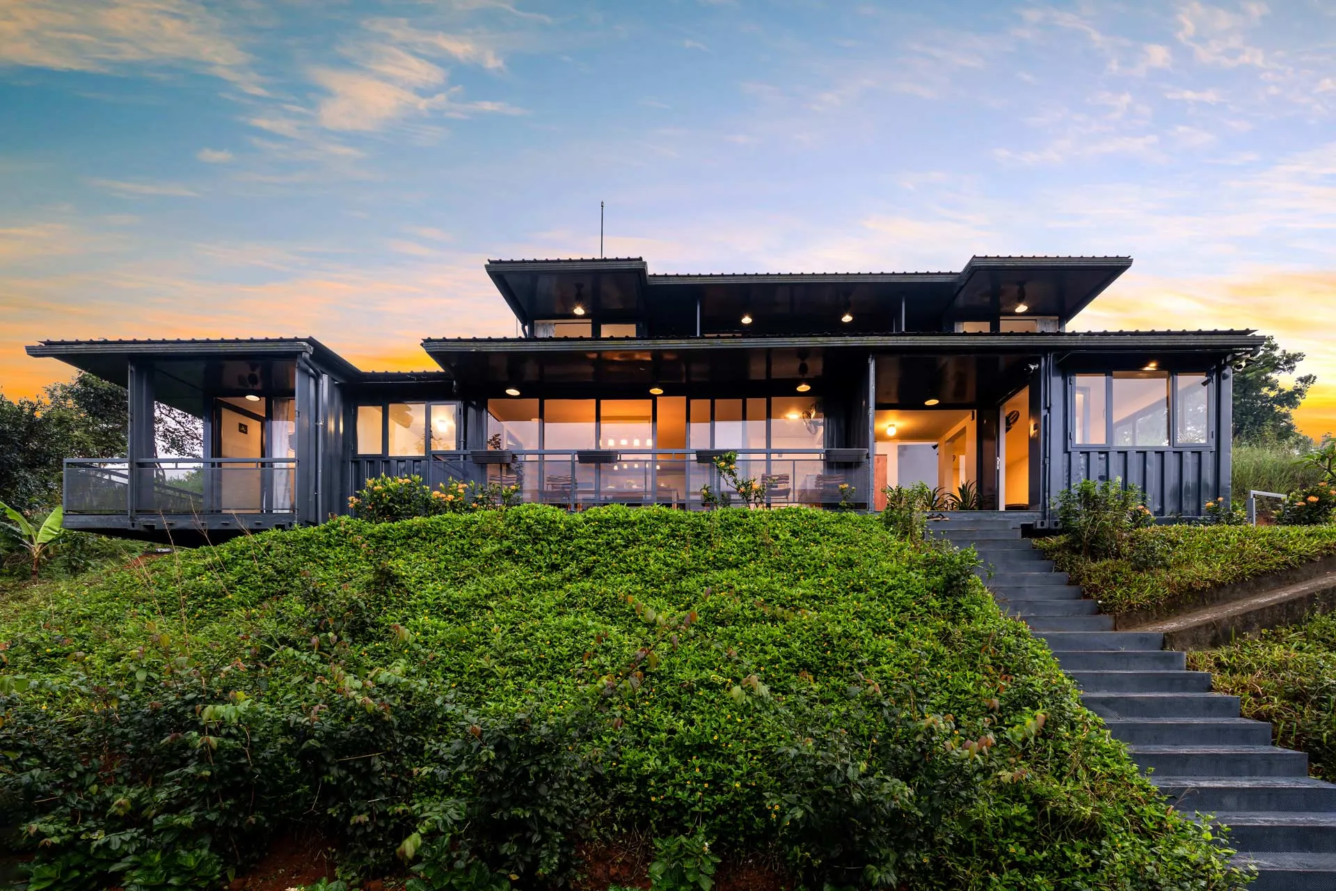5 Bedroom Villa With Garden In Wayanad VODSI42 Villa is a remarkable residence located in the tranquil area of Korome in Wayanad. This distinctive container home harmoniously combines modern contemporary design with the beauty of nature, providing stunning mountain vistas that calm the spirit.