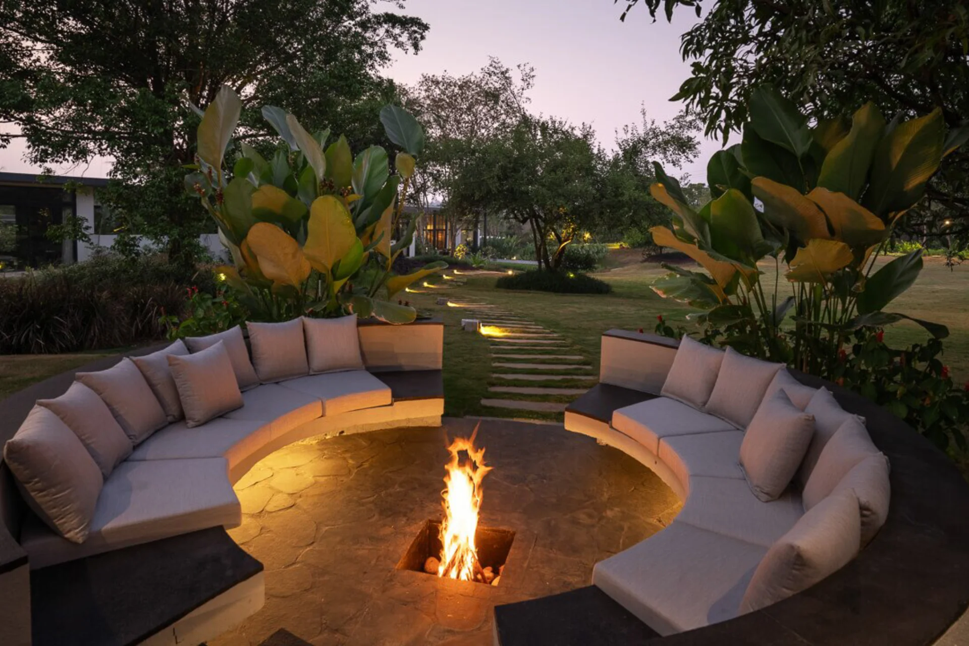 Draped in a beige hue with subtle touches of bottle green, this expansive 5-bedroom residence harmoniously integrates with the natural surroundings. Boasting door-to-glass ceilings, it provides an abundance of natural light and direct access to the outdoor lawn. The exterior is equally appealing, featuring a swimming pool and a pool table just a few steps away, creating an ideal atmosphere for a leisurely, serene evening. For cooler evenings, you can relax by the gazebo, which comes equipped with a fireplace. Next to the gazebo is a bar setup, allowing you to prepare your favorite cocktails and unwind with family and friends in a peaceful environment.