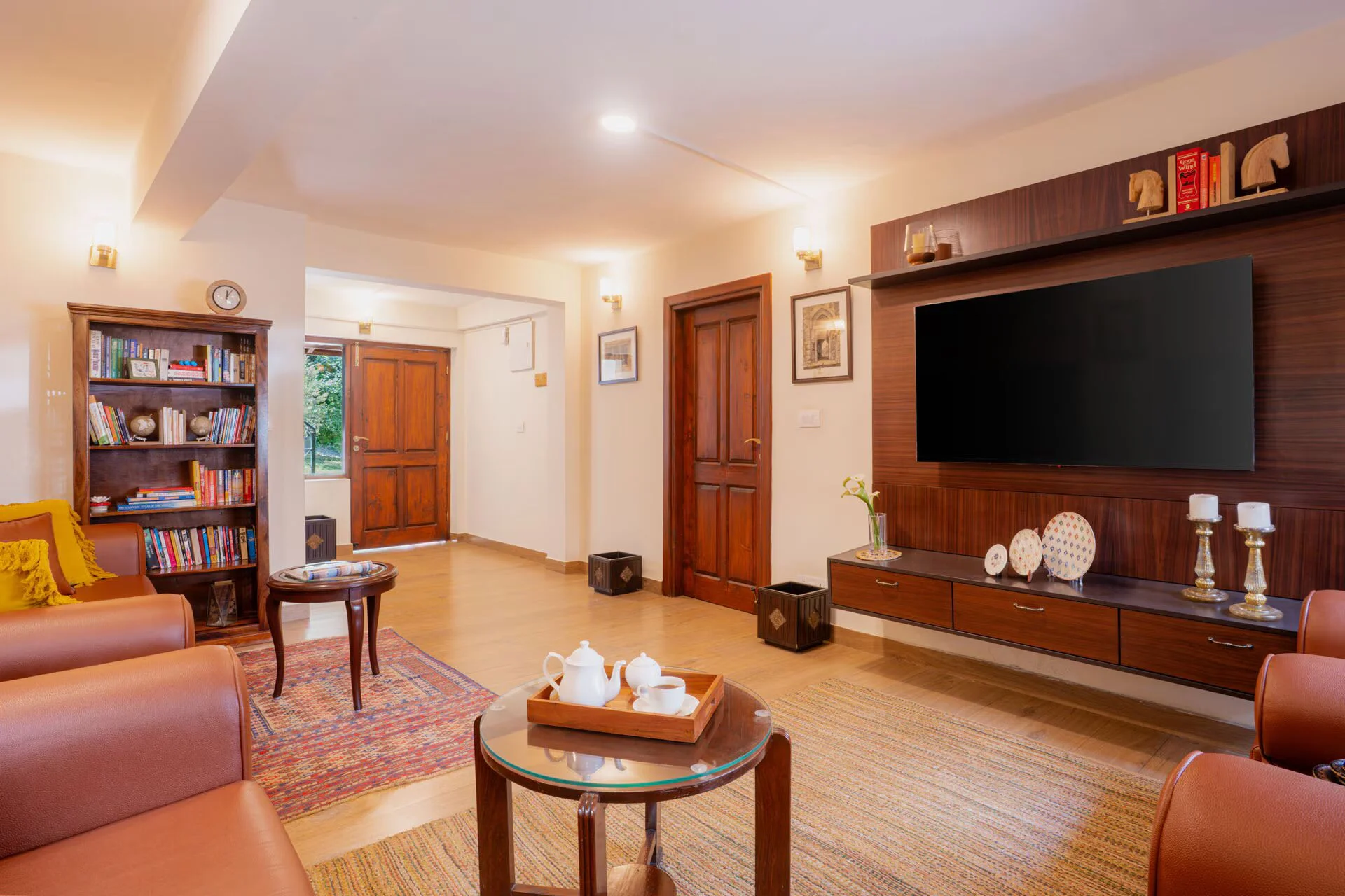 5 Bedroom Villa With Lawn In Shimla Nestled in the picturesque hills of Shimla, where the beauty of nature harmonizes with timeless sophistication, VODHP05 Villa beckons you to embark on a journey filled with tranquility and wonder. Allow the melodious sounds of the hills to lull you into a state of complete happiness, as you discover the enchantment that lies within this hillside sanctuary. VODHP05 Villa in Shimla features a villa equipped with a garden, terrace, and complimentary WiFi. Guests can unwind by the outdoor fireplace and seating area.