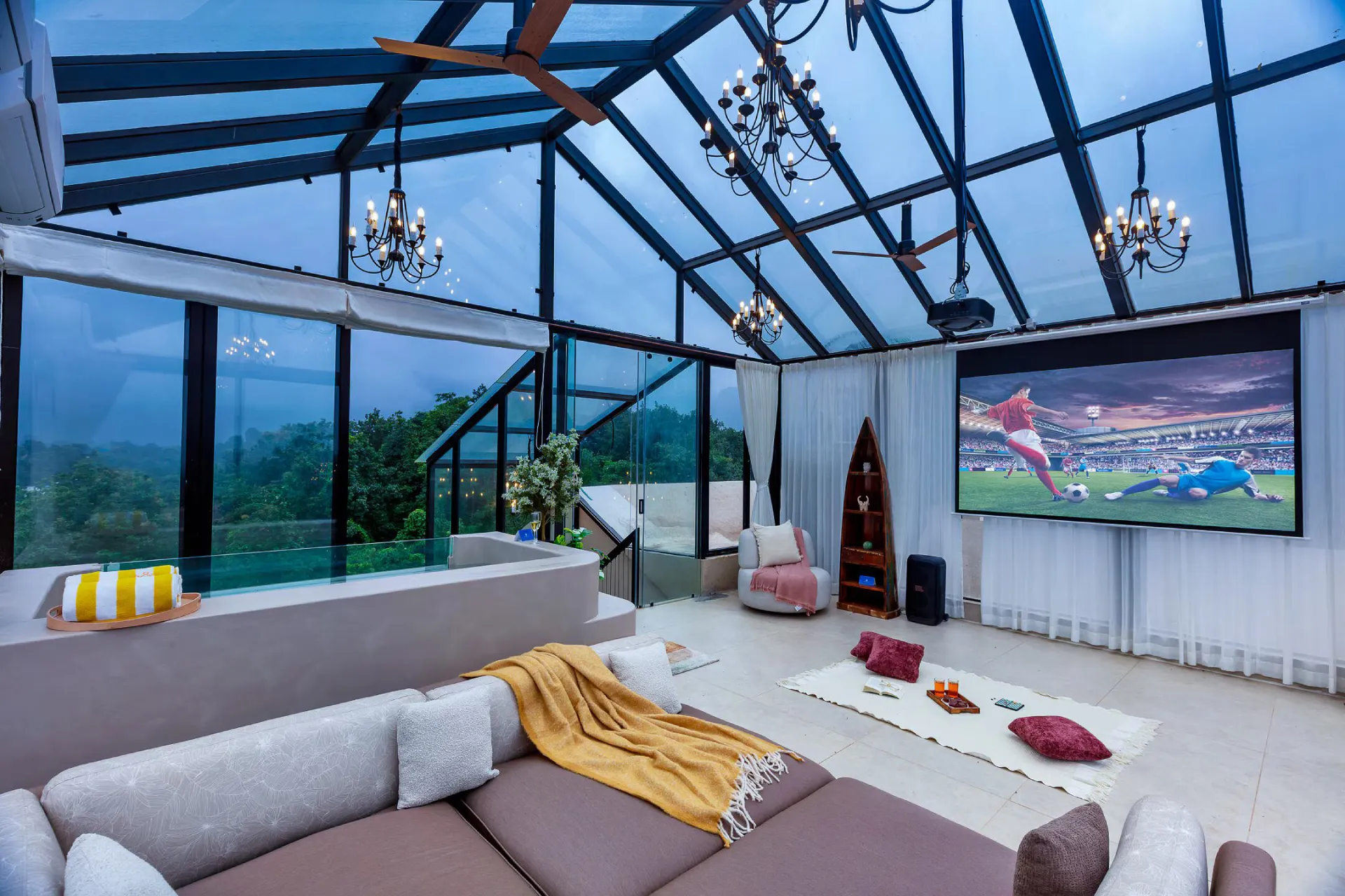 The property also includes free on-site private parking, air conditioning, and complimentary toiletries. Further amenities consist of a wardrobe and bath, addressing all guest requirements. Begin your day with a nutritious breakfast set against the backdrop of misty hills, enjoy high tea on the lawns, and unwind with barbecue nights and bonfires beneath the stars. A remarkable glasshouse equipped with a projector, indoor games, a jacuzzi, and floor-to-ceiling views of the mountains provides the perfect setting for sipping wine as the sun sets.